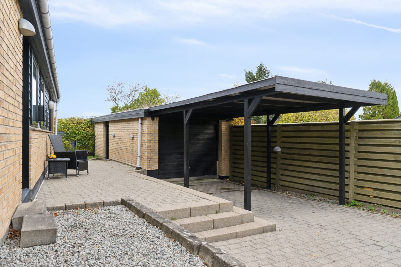 Tilhørende carport samt stort udhus i tidligere garage. Der er endvidere opsat ladestander til bil.