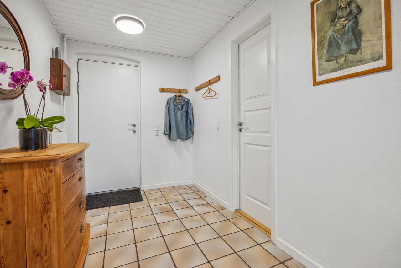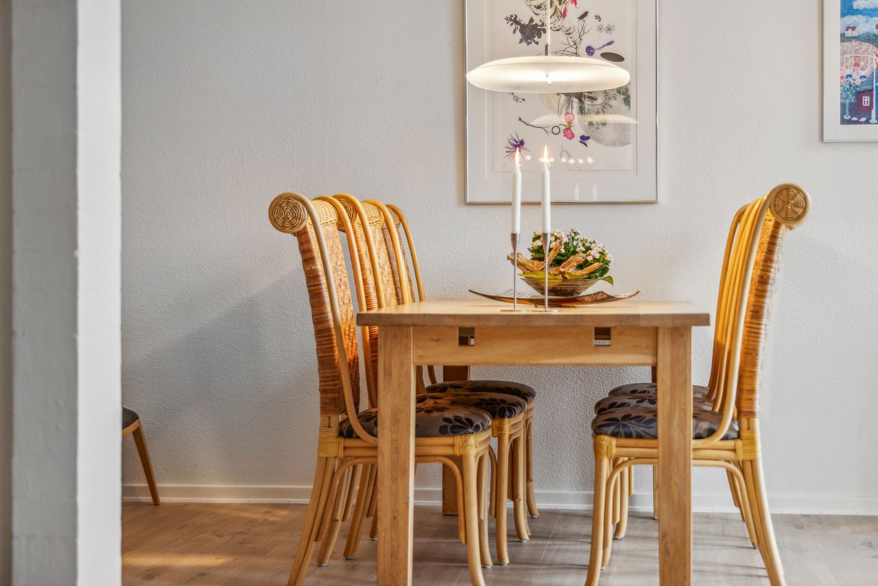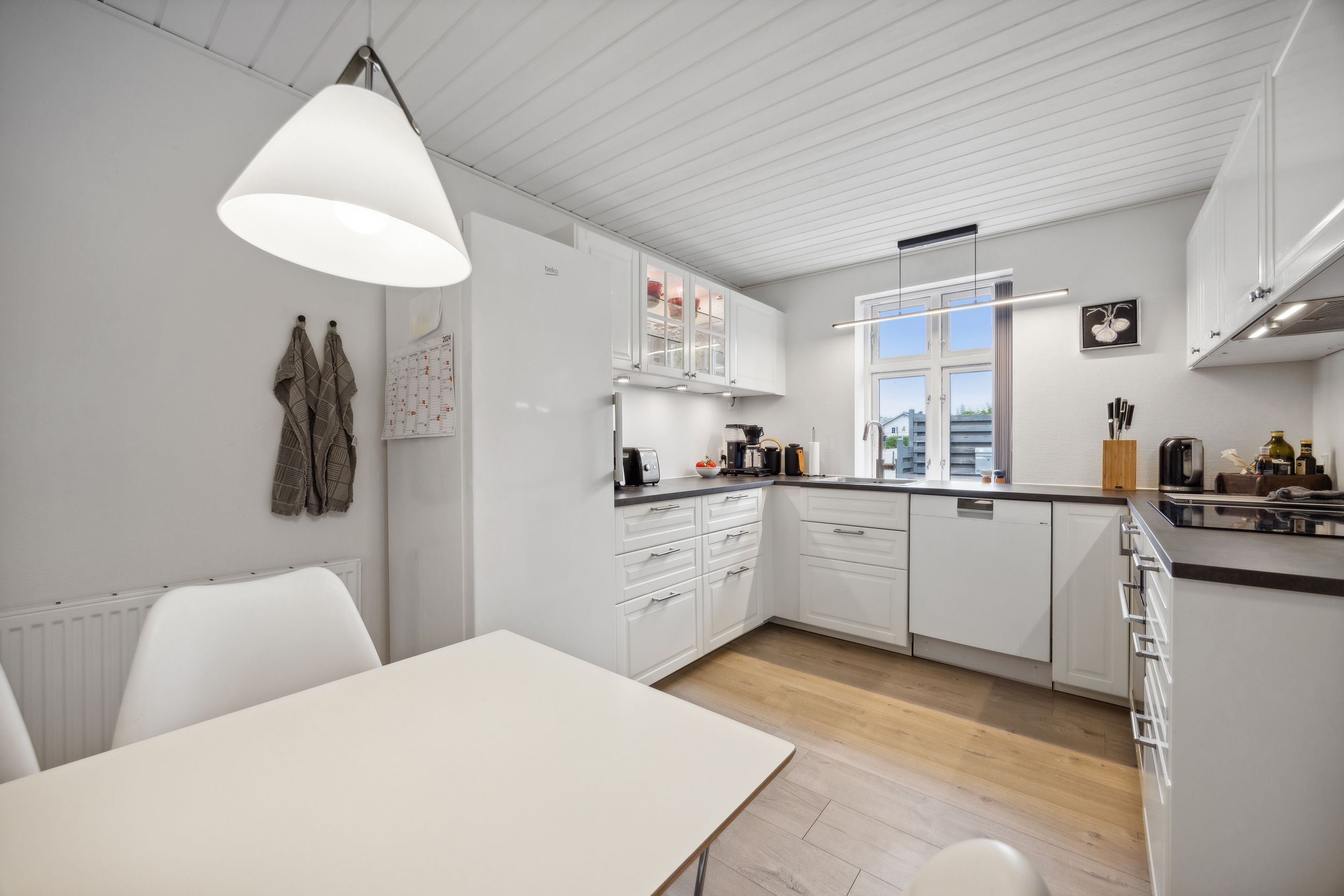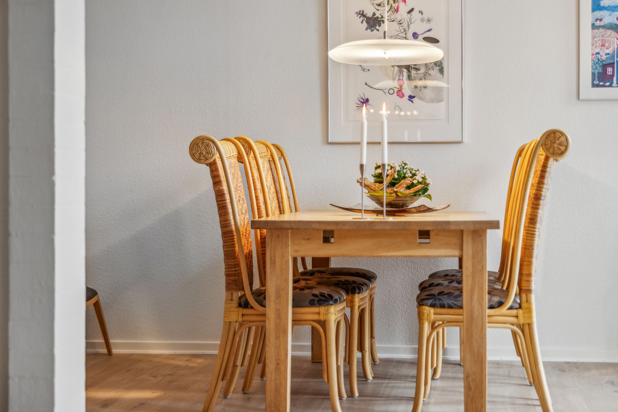 I det charmerende rækkehus, bydes du velkommen i en skøn lys entré med plads til at modtage gæster og komme af med overtøjet. Fra entréen finder du adgang til boligens lyse gæstetoilet, der er moderniseret i 2022 og med vaskemaskine og tørretumbler, skønt køkken fra 2022 med spiseplads, masser af bord- og opbevaringsplads. Endelig er det også fra entréen at der er trappe til 1. sal. Entréen leder dig helt naturligt ind i husets store todelte stue med nye gulve og vinduer fra 2022, hvor der er god plads til både langbordet og sofagruppen. Fra stuen er der udgang til rækkehusets terrasse og have.