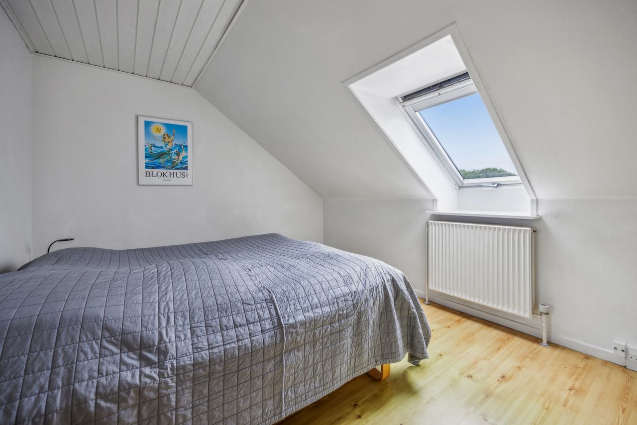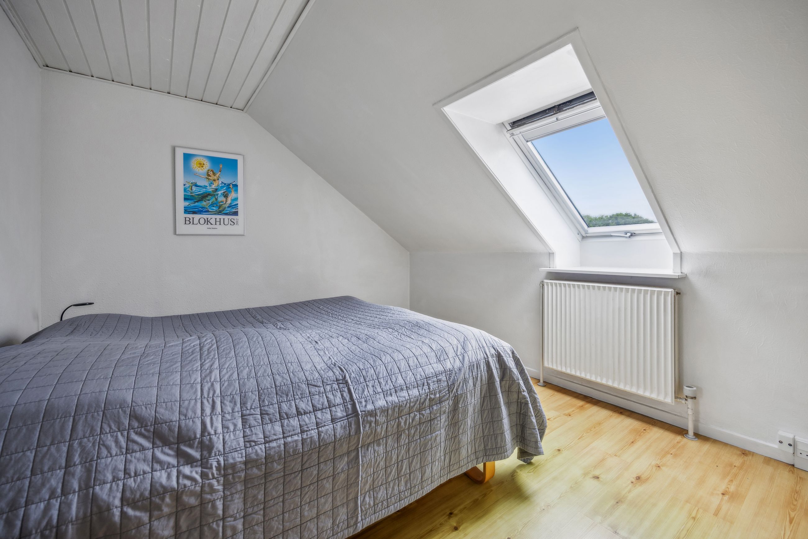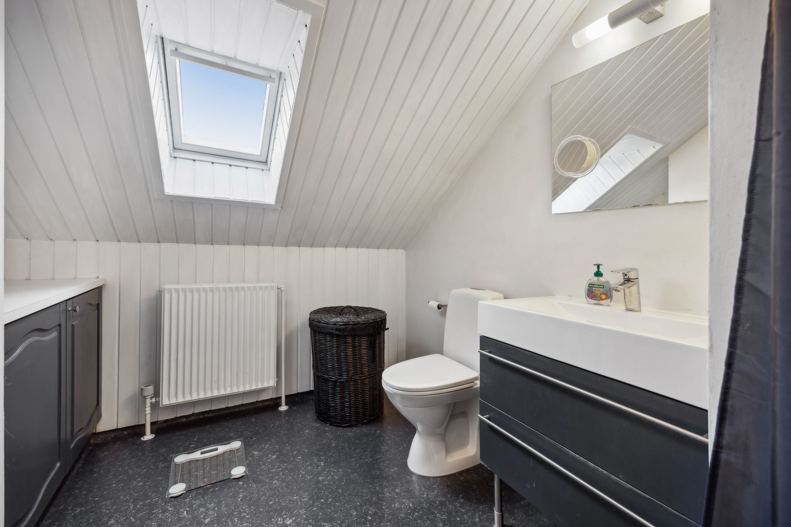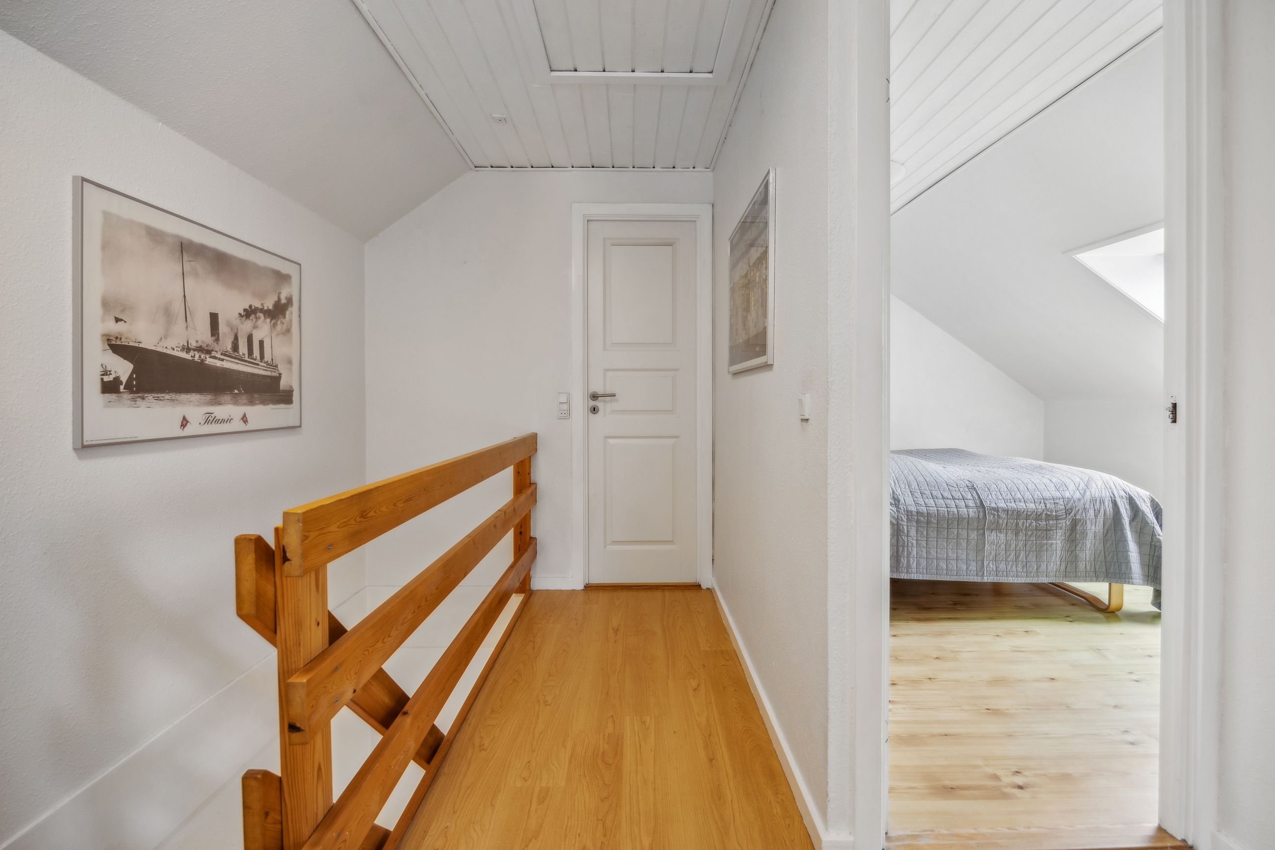 På 1. sal finder du boligens store badeværelse med bruseniche, stort soveværelse med skabsvæg og to gode værelser, samt repos med depotplads.