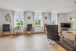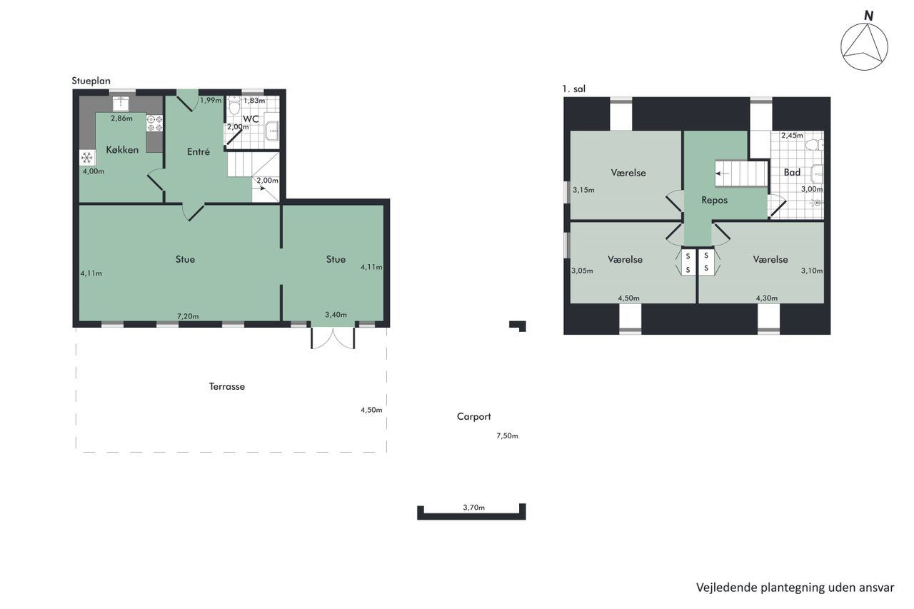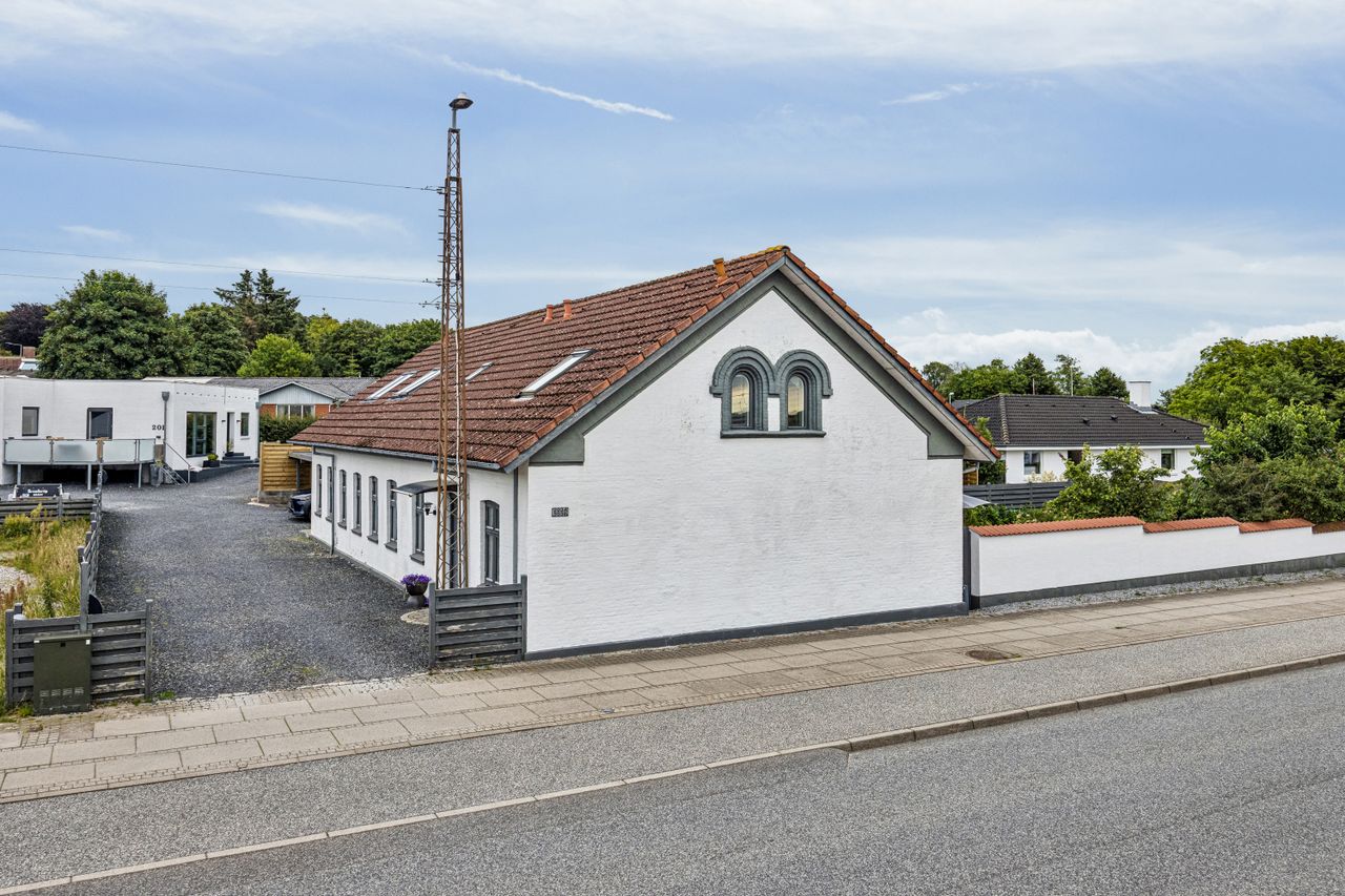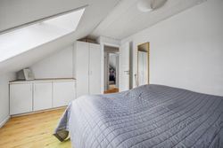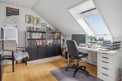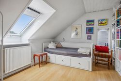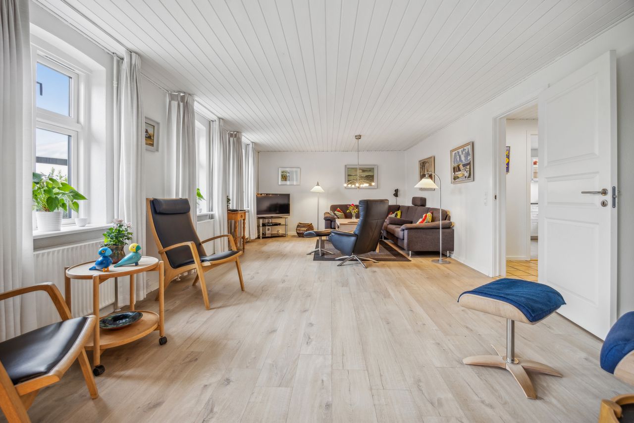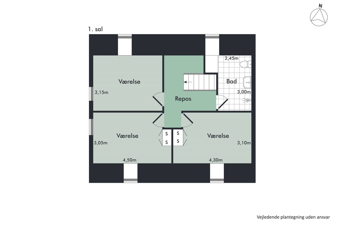 På 1. sal finder du boligens store badeværelse med bruseniche, stort soveværelse med skabsvæg og to gode værelser, samt repos med depotplads.