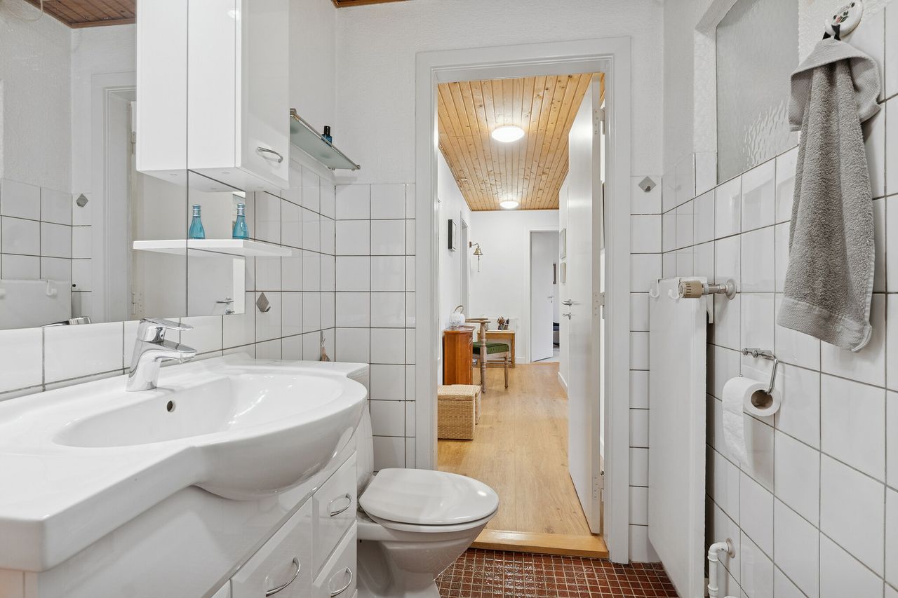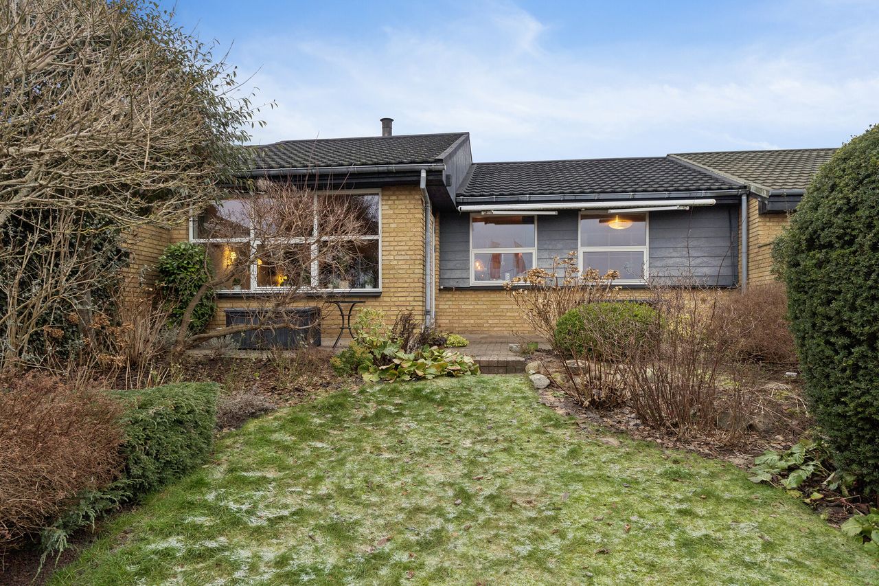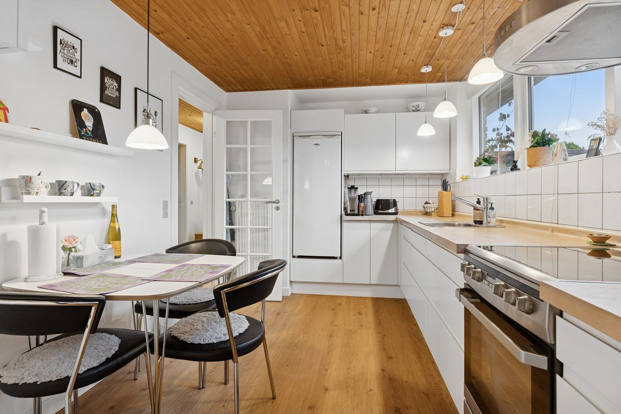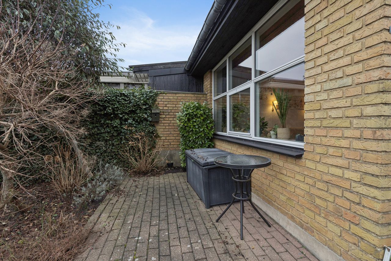 Velholdt etplans rækkehus centralt i Gug - Centralt beliggende på lukket stikvej- Badeværelse med bruseniche og gulvvarme- Rummeligt HTH køkken fra 2016- Skøn ugeneret have og terrasse bag huset- Decratag fra 2022- Vinduer fra 2009