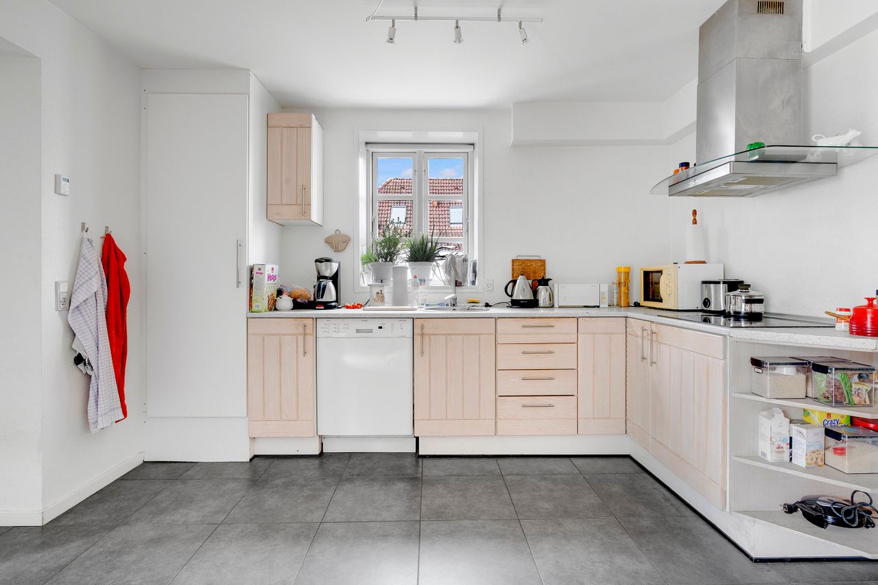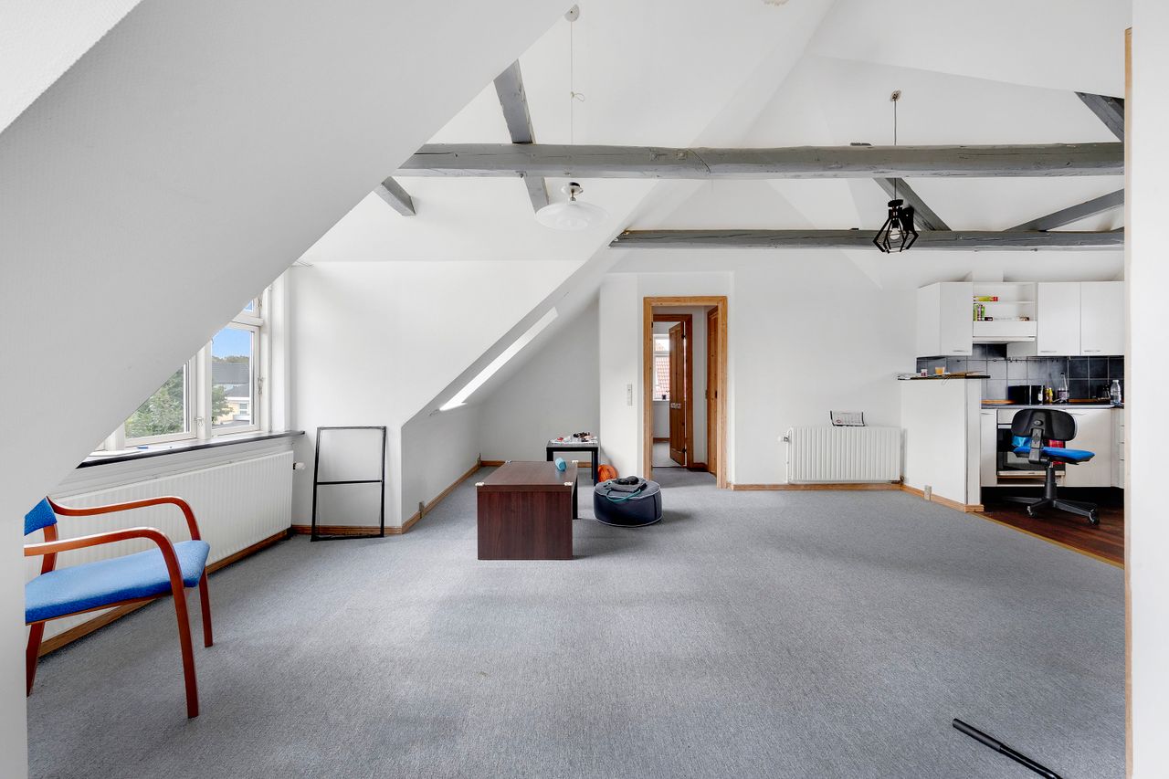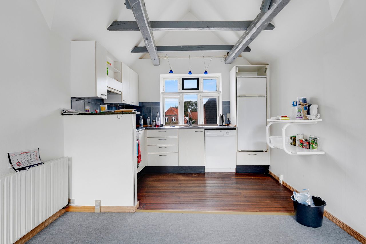 1. sal: 79 m2 ifølge BBR, stort køkken/alrum/stue m/ opvaskemaskine/indbygningsovn, køle/fryseskab, glaskeramisk kogeplade, bad/toilet m. brus + vaskesøjle. Adgang til terrasse og parkering. Aktuel husleje kr. 3.900,- inkl. vand.