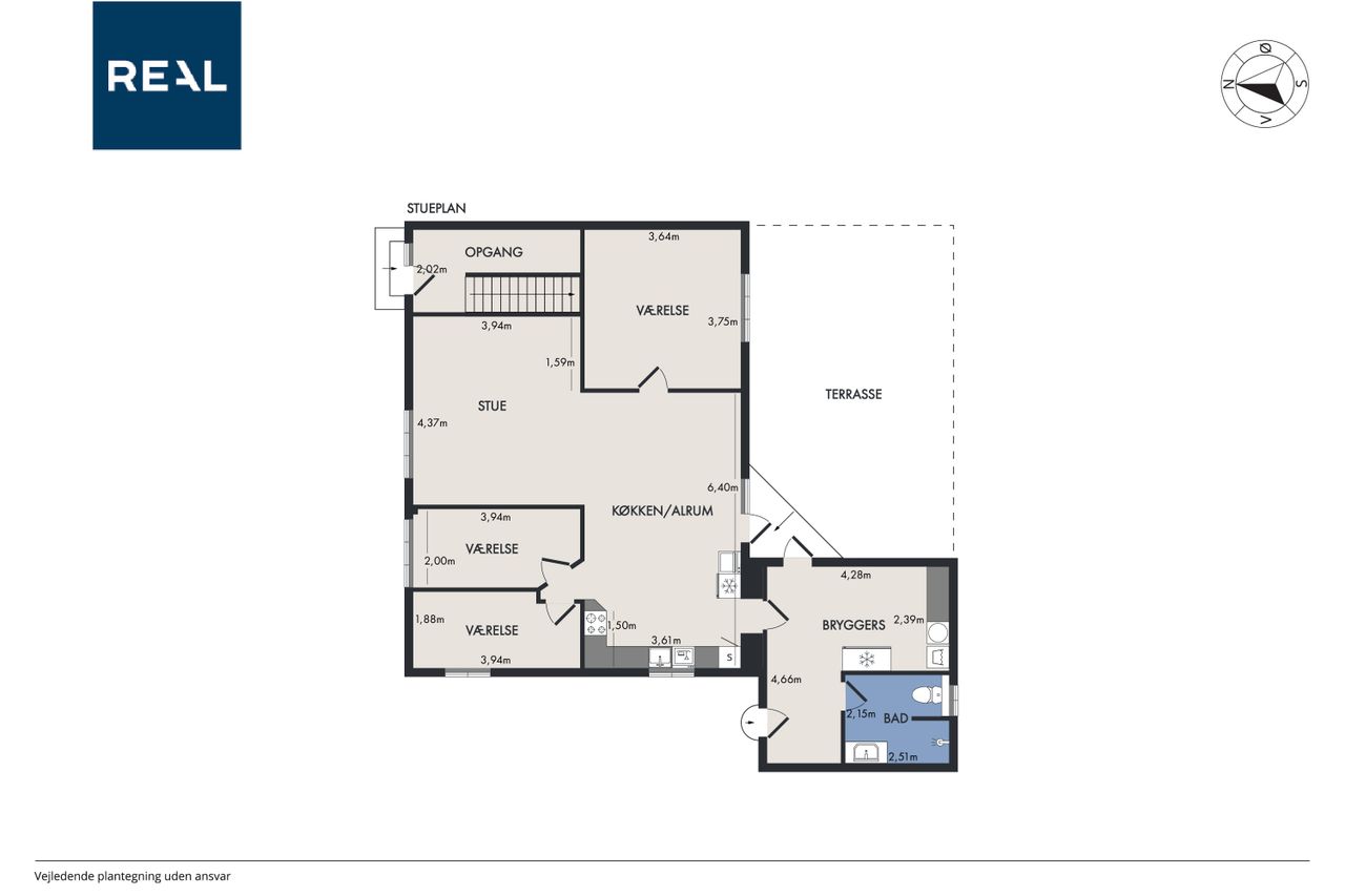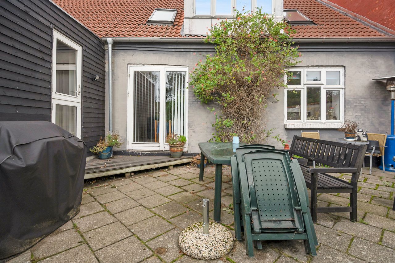 Stuen:~ 87 m2 ifølge BBR, totalrenoveret, stort køkken/alrum/stue m/ opvaskemaskine/indbyg.ovn, køle/fryseskab, glaskeramisk kogeplade, stort badeværelse med brus, stort indgangsparti m/vaskemaskine, 2 værelser, 1 stort soveværelse, udgang til egen terrasse fra både stuen og gangen, egen have i forbindelse med~ terrassen. Adgang til parkering. Aktuel husleje kr. 5.600,- inkl. vand.