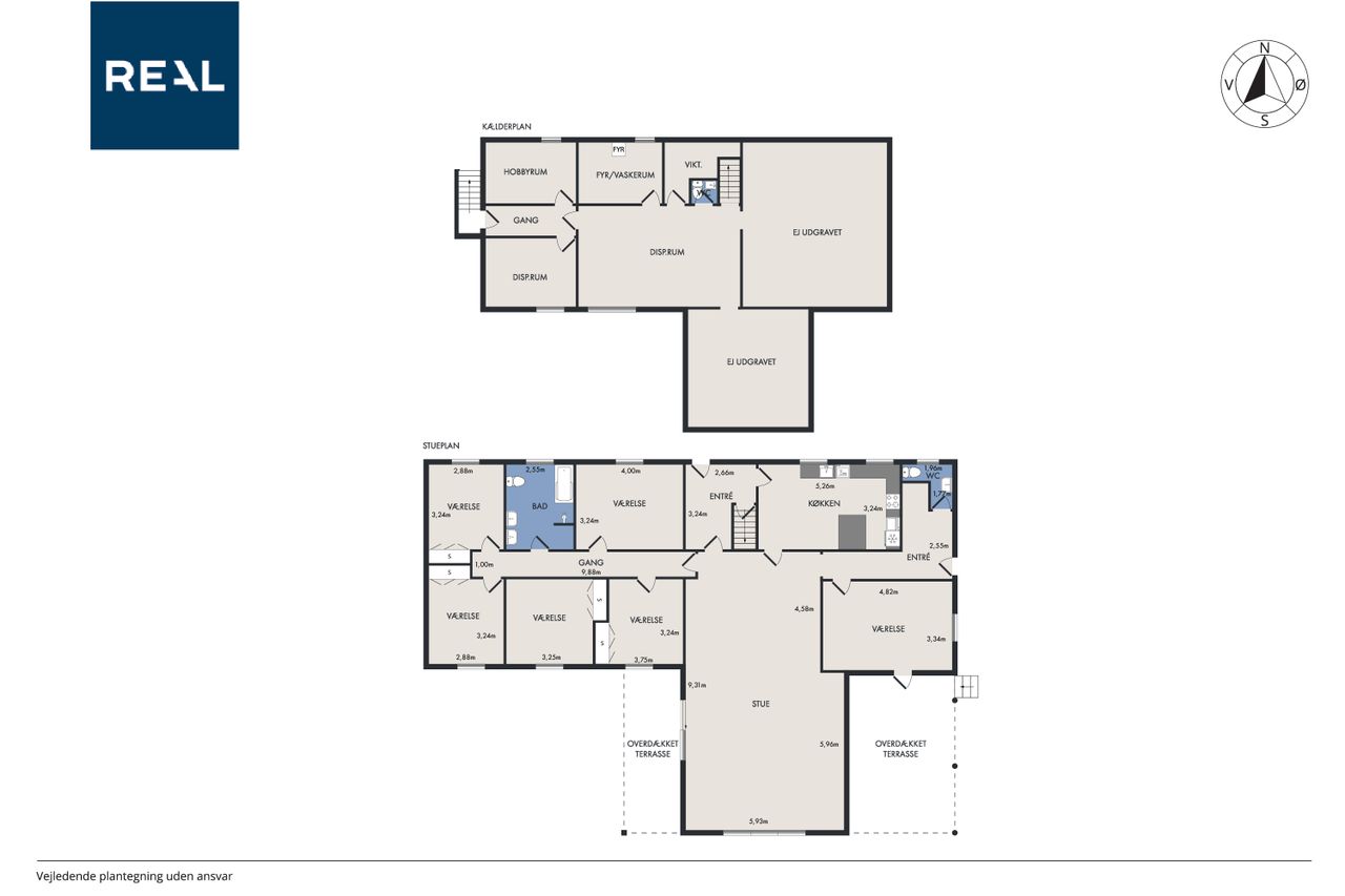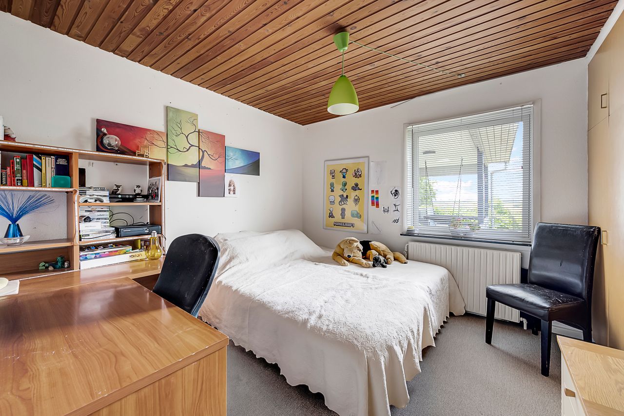 Indretning: Entre med garderobeplads. Gæstetoilet. Stort værelse med udgang til terrasse. Flot nyere køkken, ca 7 år. Entre med kælder nedgang. Stor stue med masser af plads og udgang til terrasse. Fordelingsgang med adgang til 5 værelser og badeværelse. Kælder: Indrettet med flere disponible rum i god stand. Her er vaskerum, Toilet, værksted, værelser.
