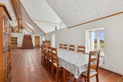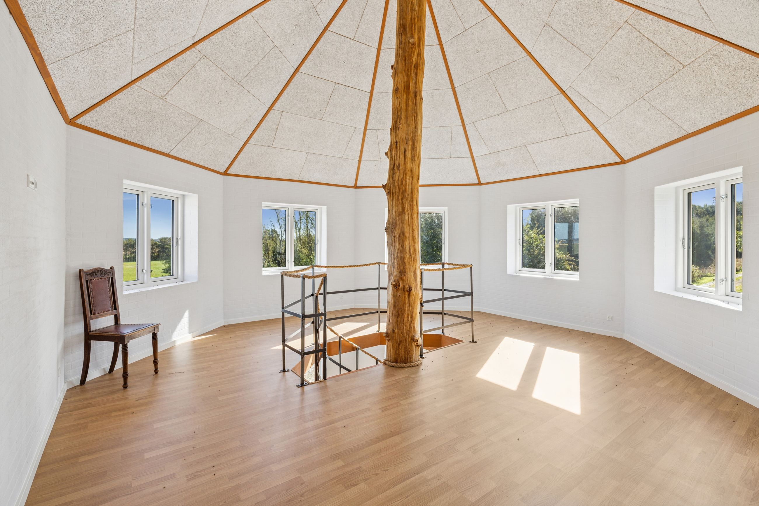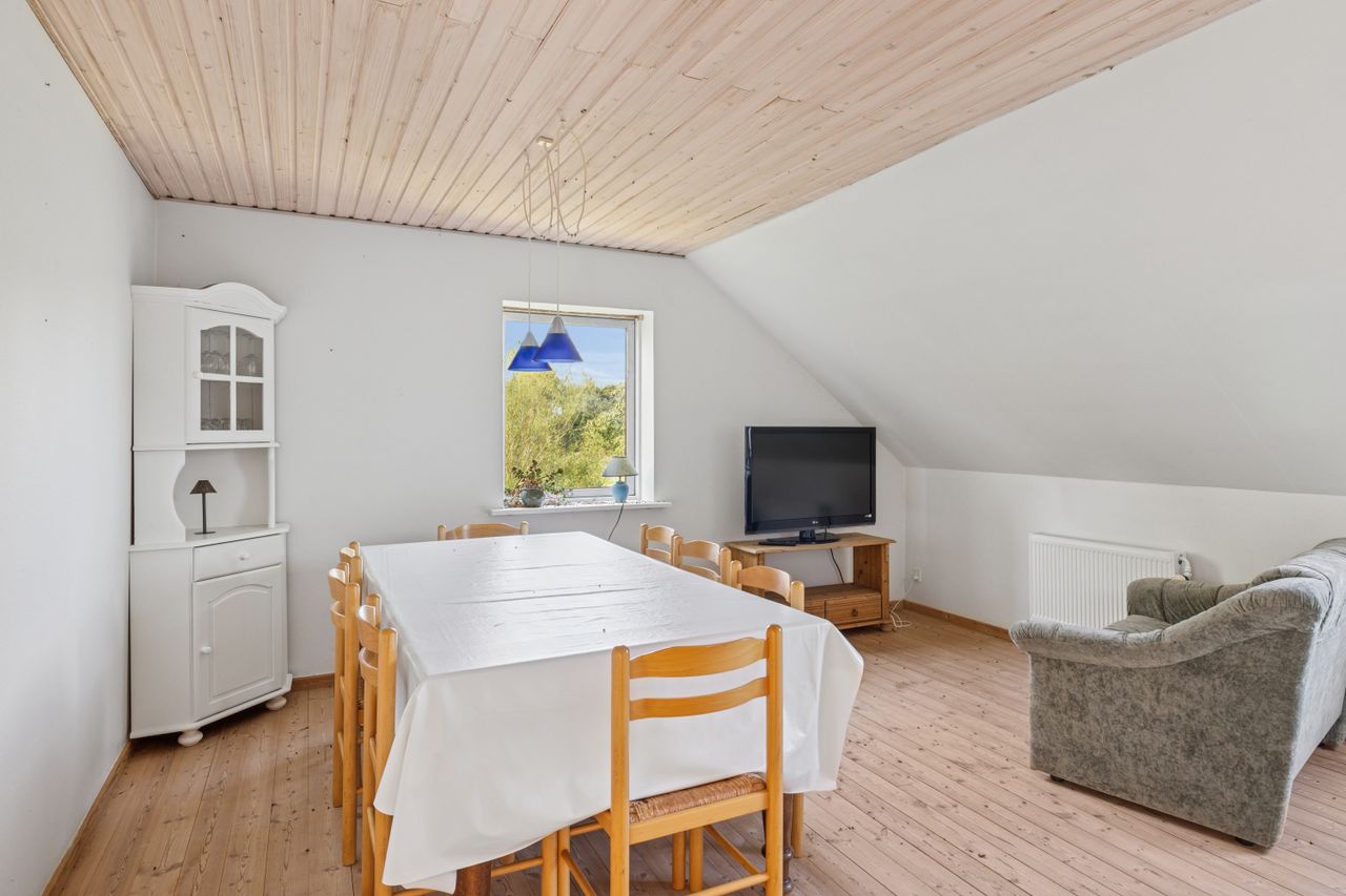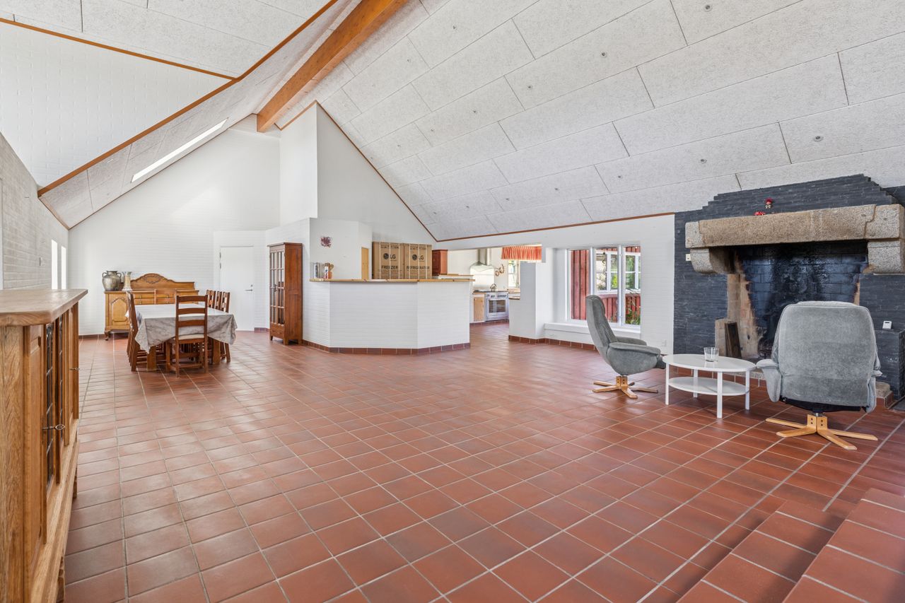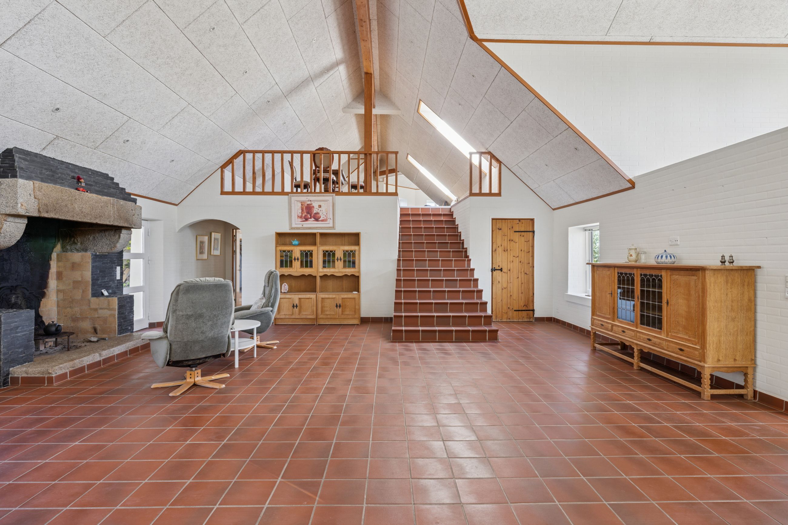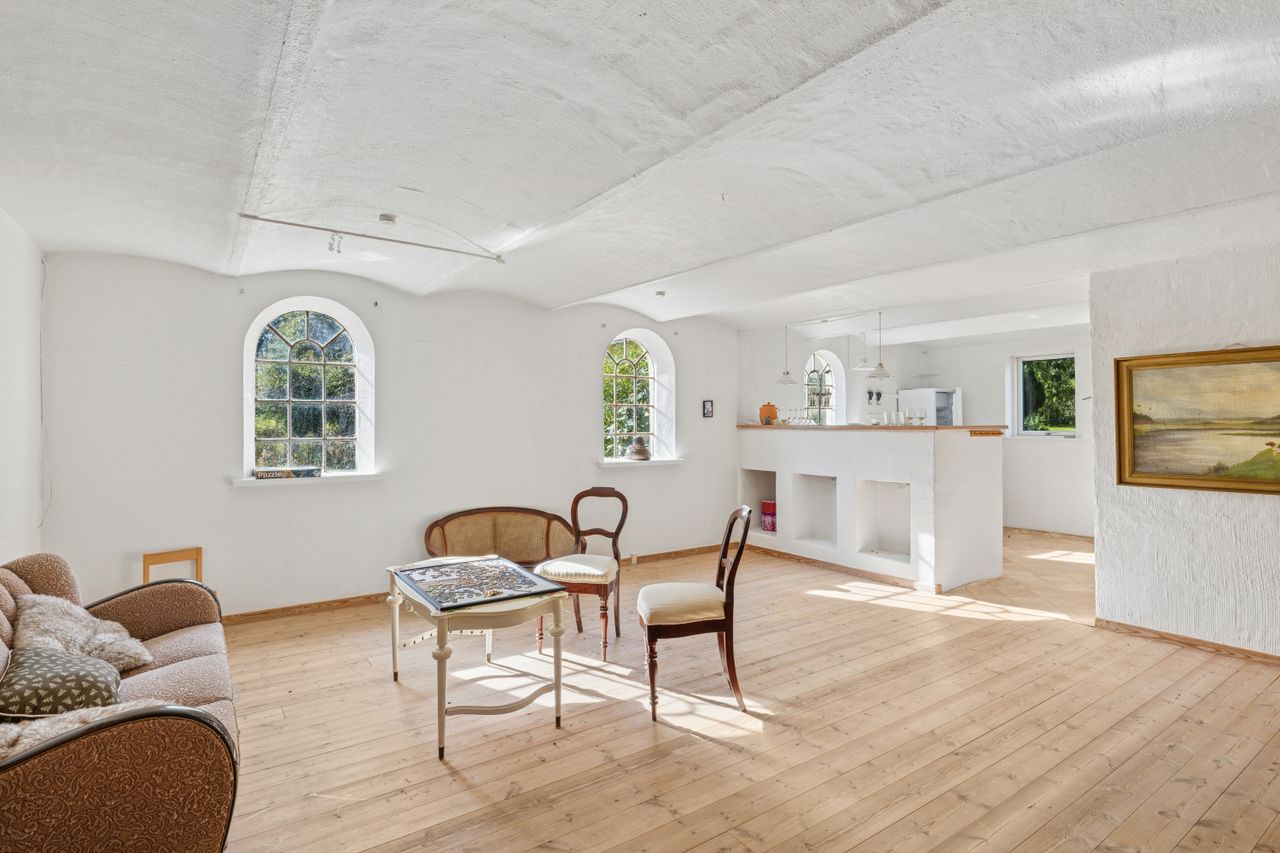 Boligens naturlige samlingspunkt er den store opholdsstue med loft til kip, synlige bjælker og den smukke franske kamin. Her fornemmer man virkelig ejendommens sjæl, når lyset falder ind gennem de mange vinduer, og der er plads til store middage, selskaber og hyggestunder.