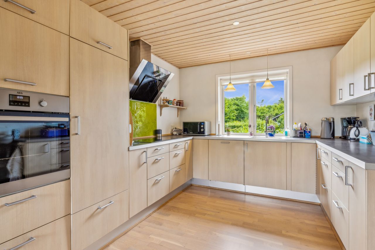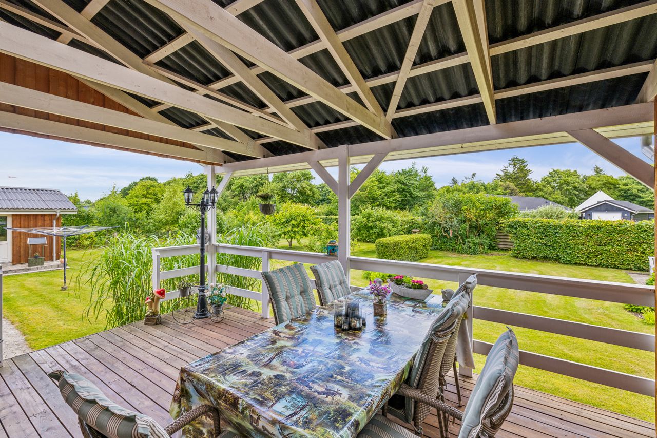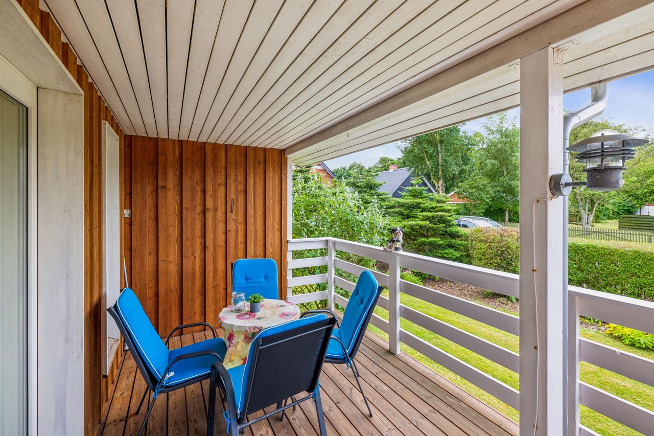 Huset er på 103 m2 og er indenfor de senere år blevet moderniseret med blandt andet nye vinduer, nyt tag, nyt køkken og nyt badeværelse, nye lofter og gulve mm. Der er endvidere opført to flotte terrasser og stor garage. Terrassen ud mod haven er overdækket.