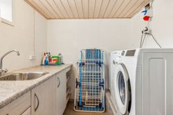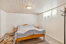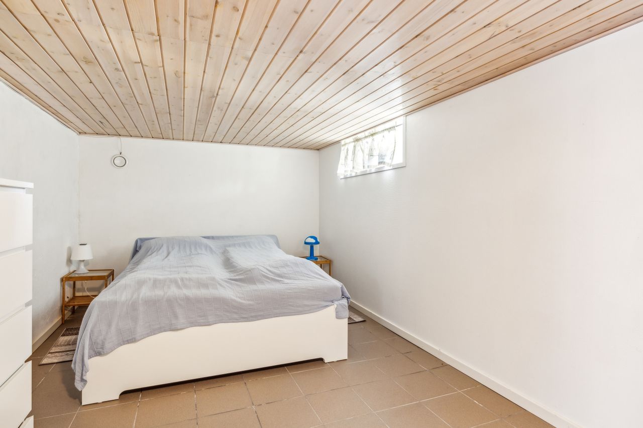Huset er indrettet med entre, stort og flot spisekøkken, stor stue med udgang til 2 terrasser. Badeværelse med god skabsplads og bruseniche. Stort soveværelse, samt værelse. Endvidere et mindre rum til opbevaring. Fra gangareal er der trappe til kælder, hvor der er etableret bryggers, samt flere gode disponible rum. Kælderen er på 74 m2. Der er brændeovn i stuen og huset er velisoleret og særdeles billig i drift.