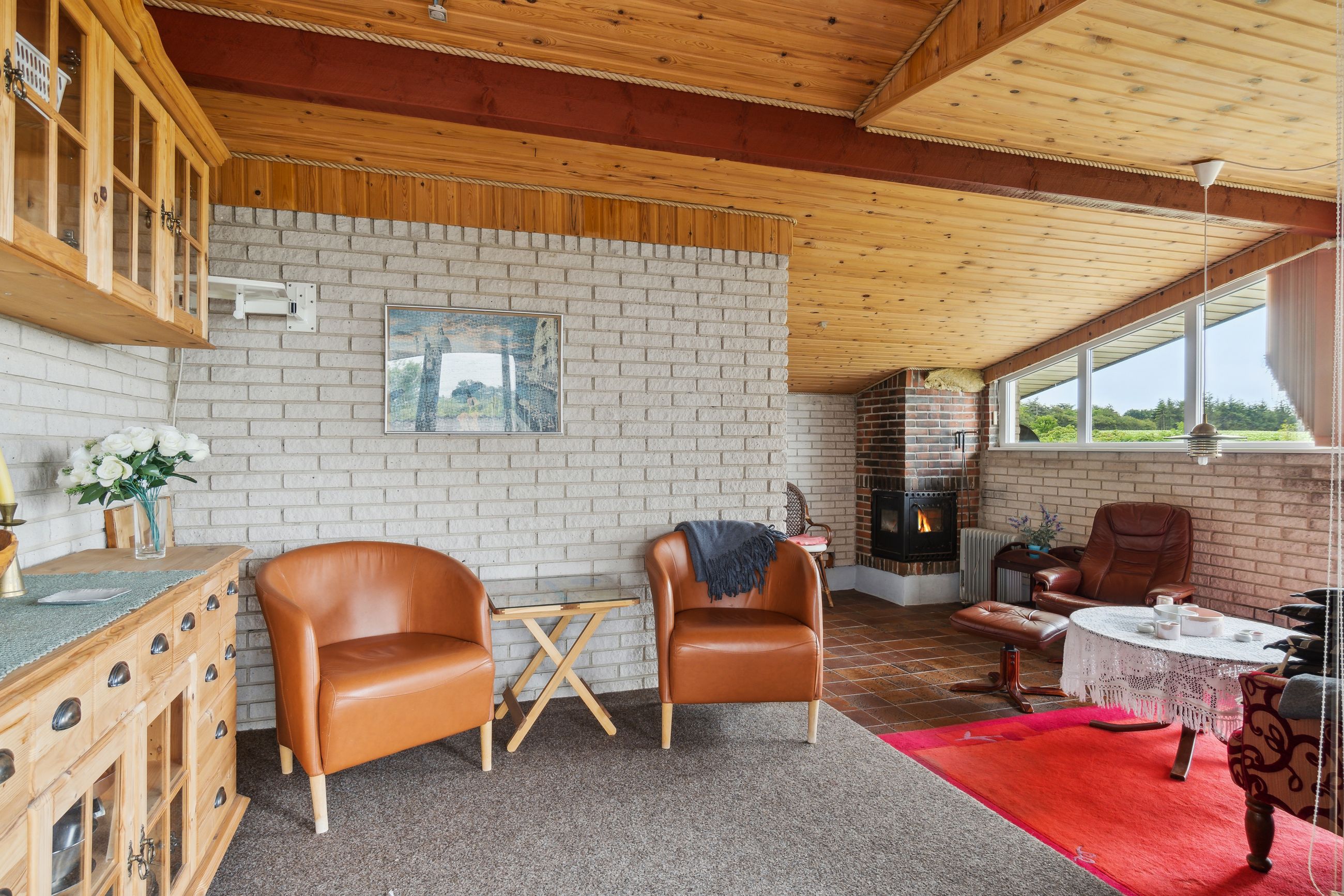 køkkenalrum hvor der er brændeovn og varmepumpe. Herfra er der udgang til terrasse samt ekstra stue