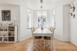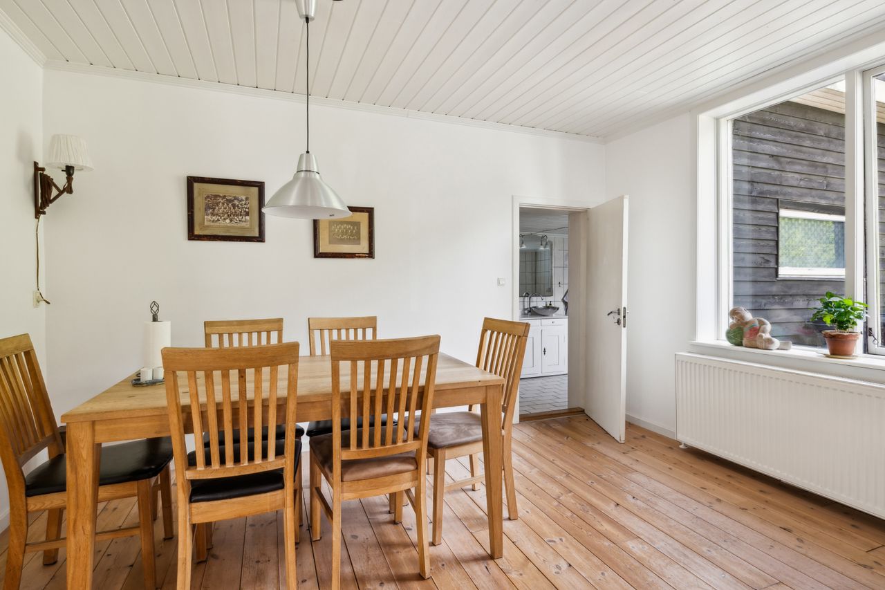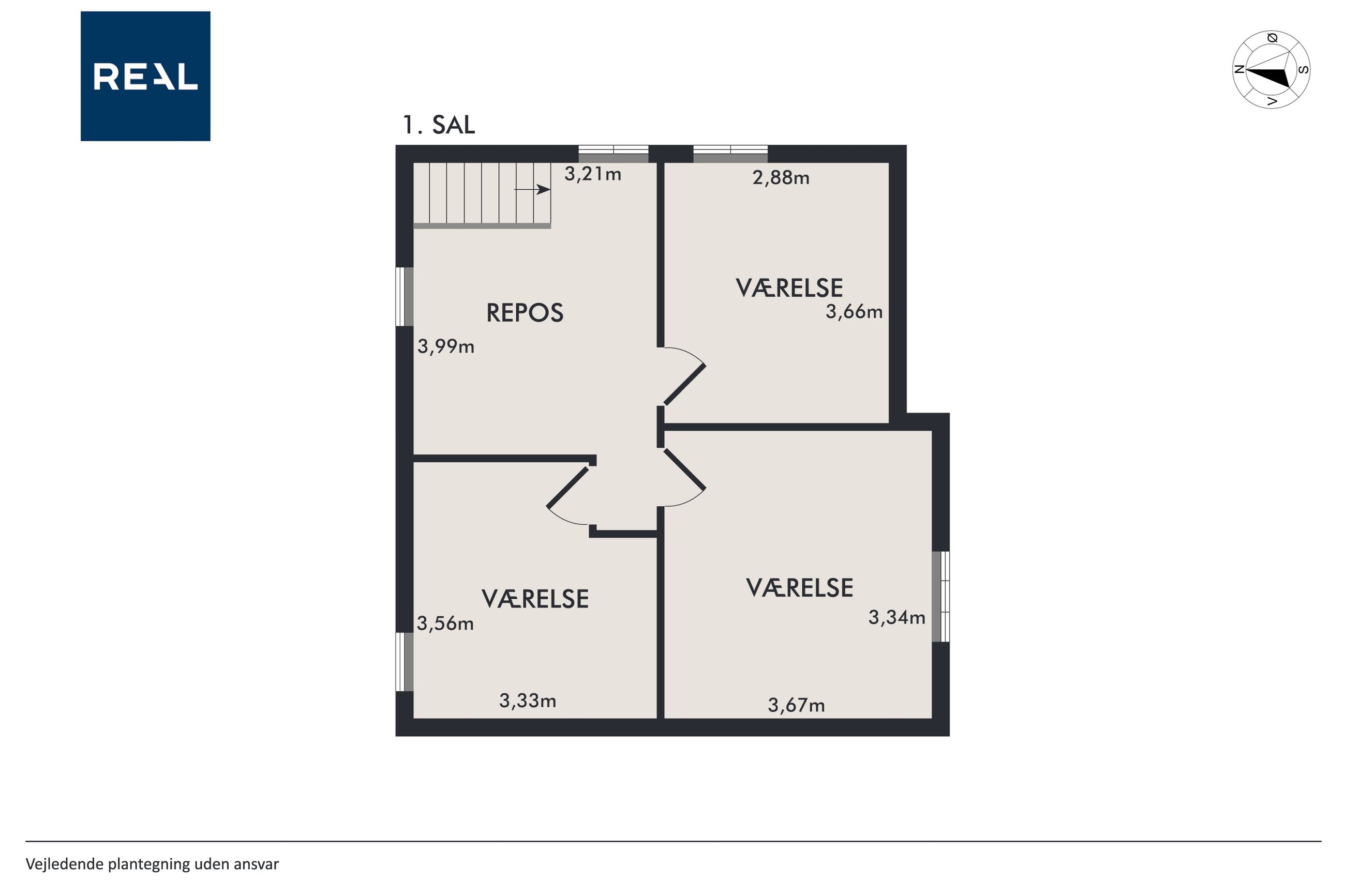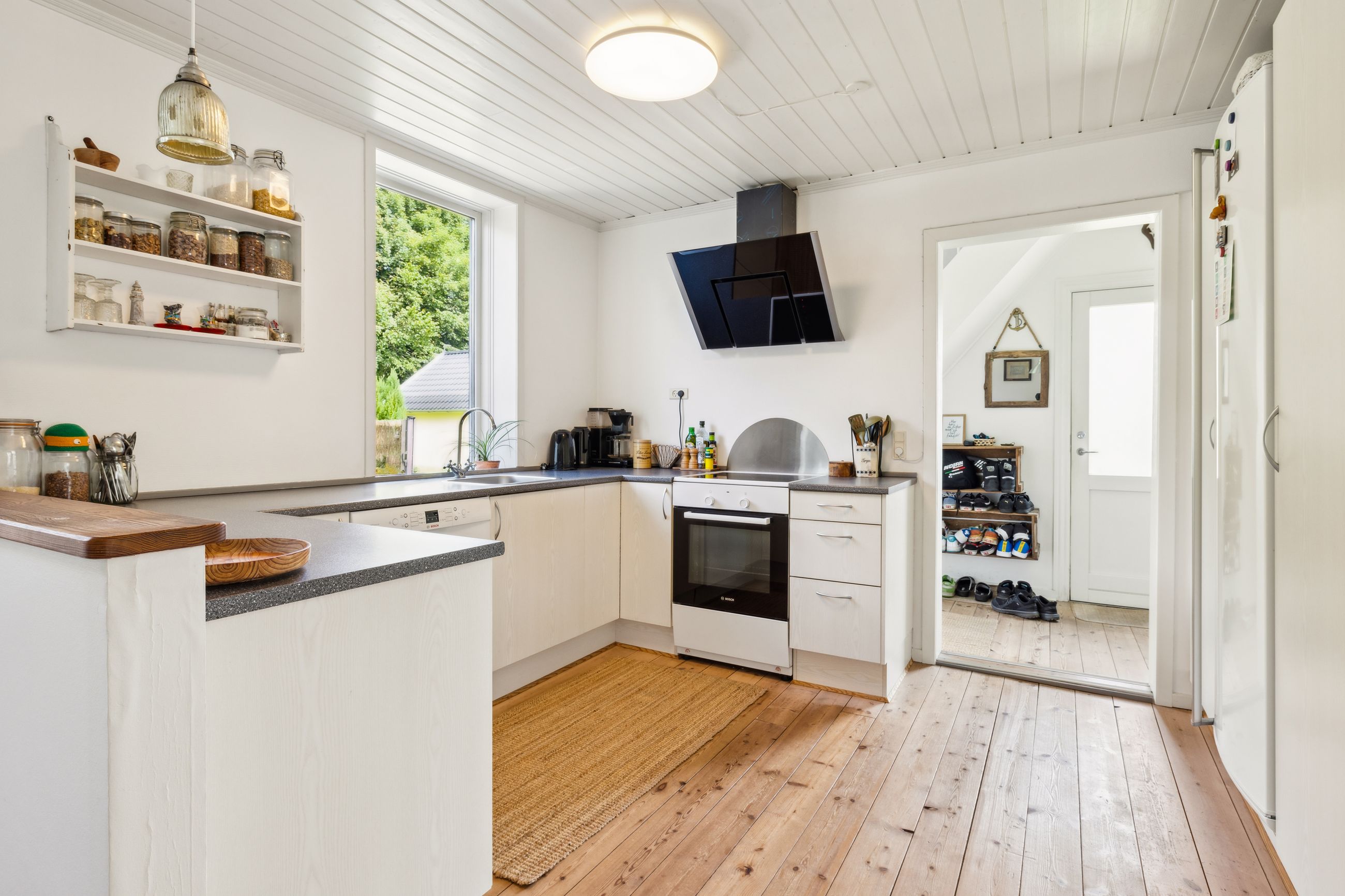 Beboelsen er rummelig og fordelt på to plan med entre med trappe til 1. salen, køkken-/alrum og stue med karnap. På 1. salen er der repos samt tre værelser.