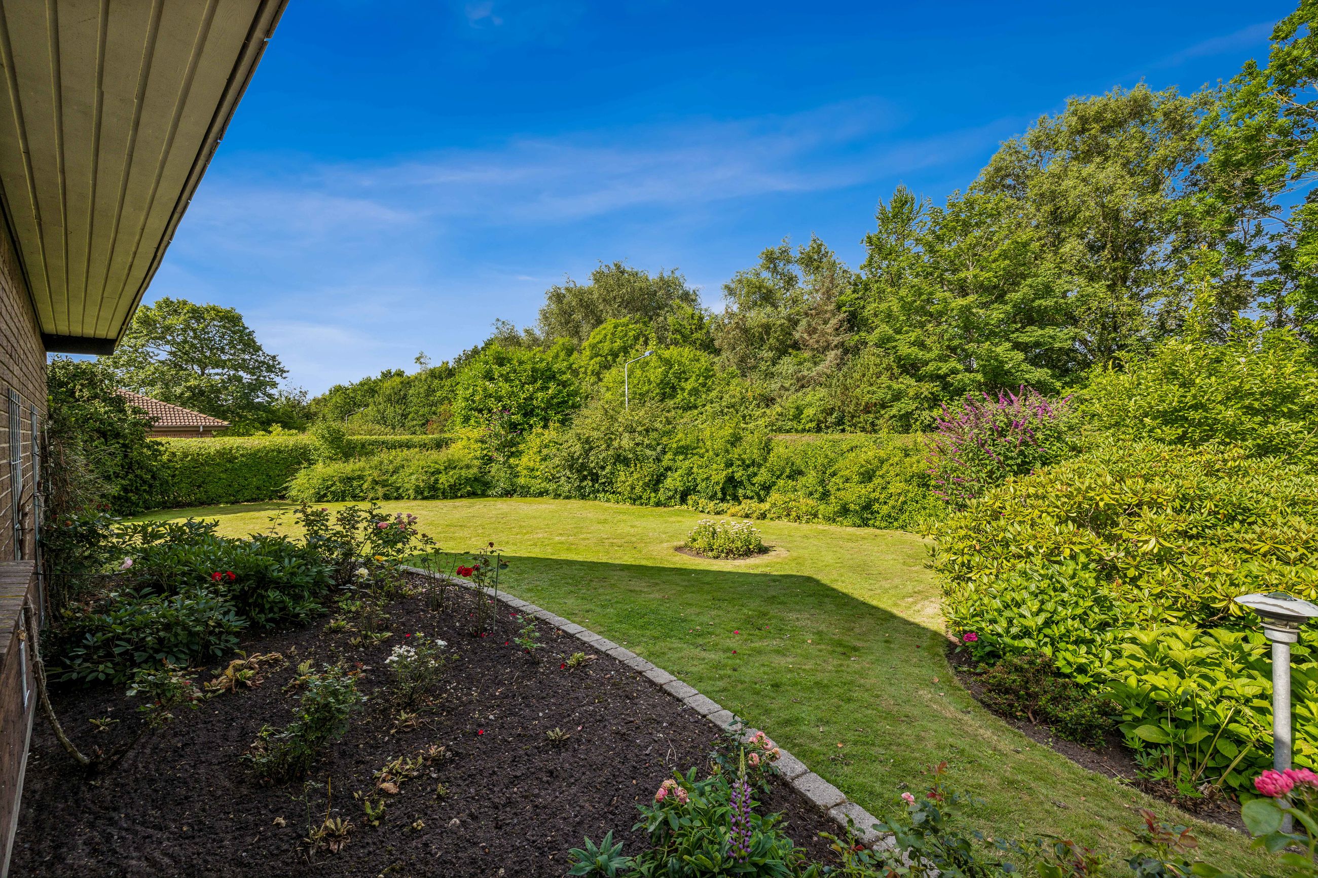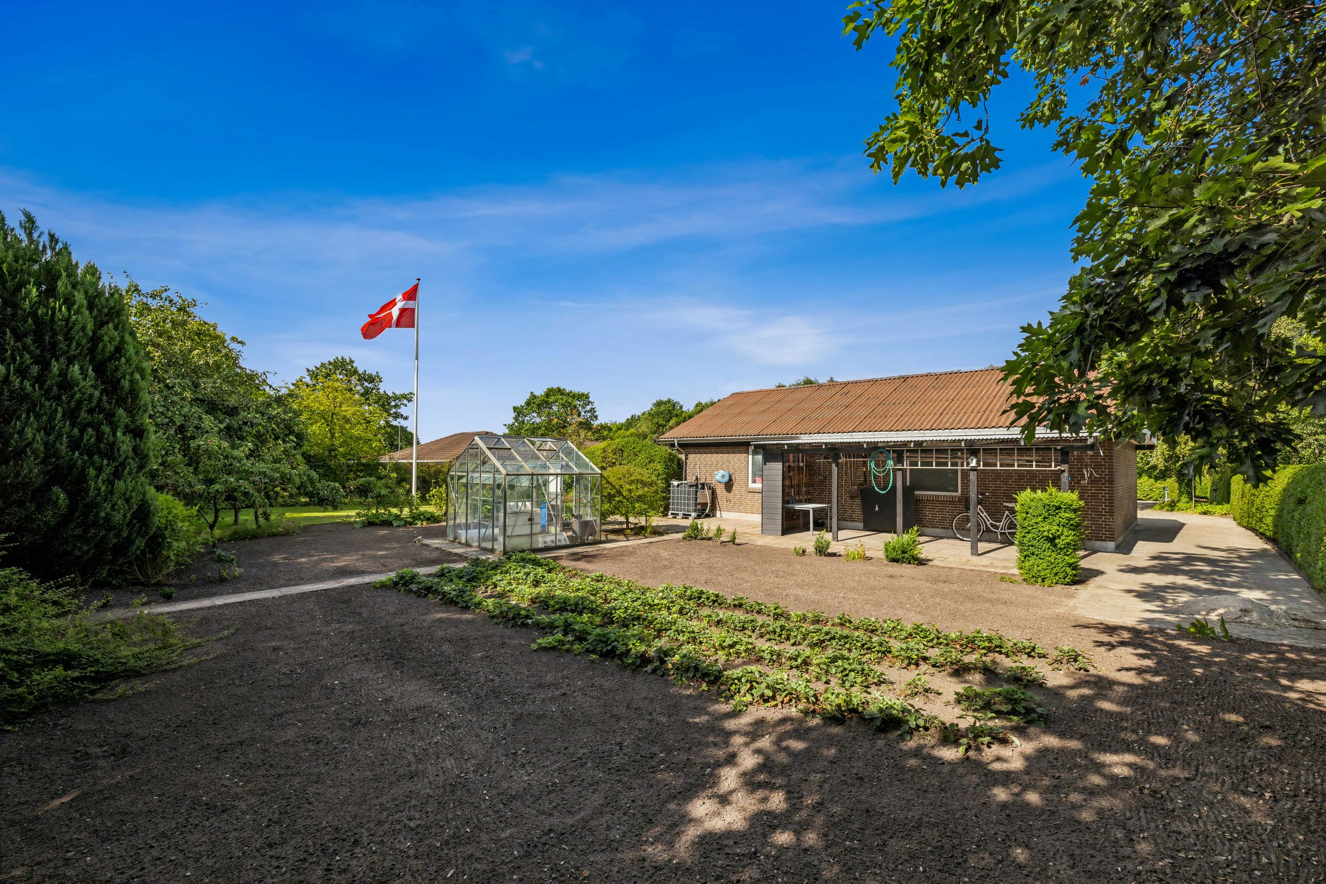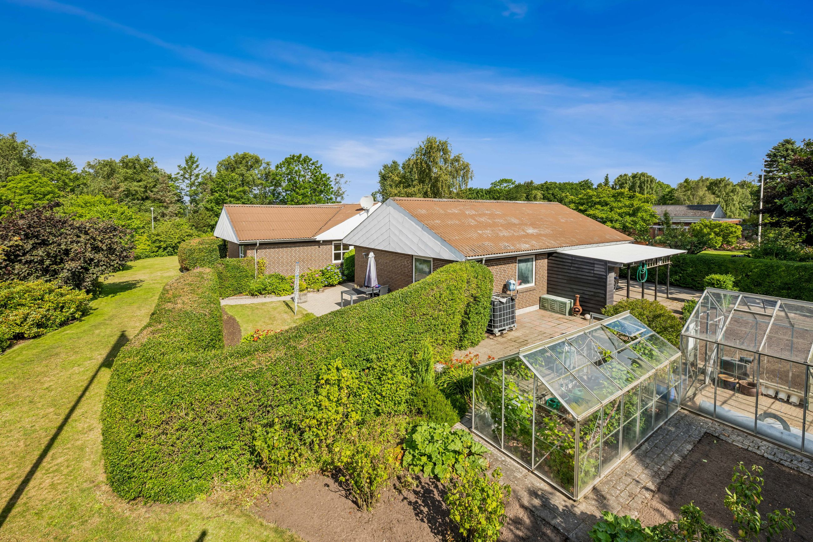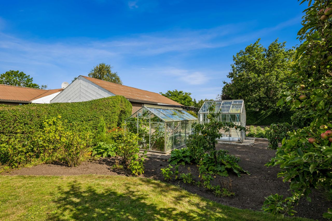 Grunden er på hele 2.010 kvm – noget man sjældent finder midt i byen – og rummer en parklignende have med ugenerte hyggekroge, solrige terrasser, en stor køkkenhave og drivhus. Her er masser af plads til både afslapning og hverdagsliv under åben himmel.