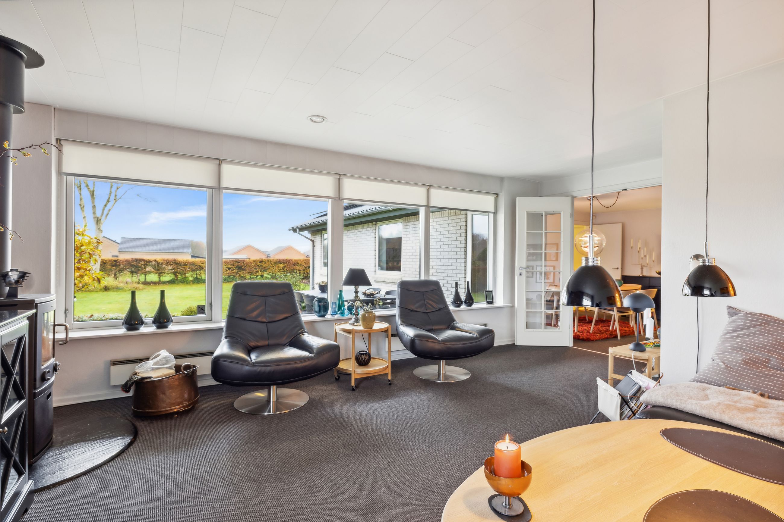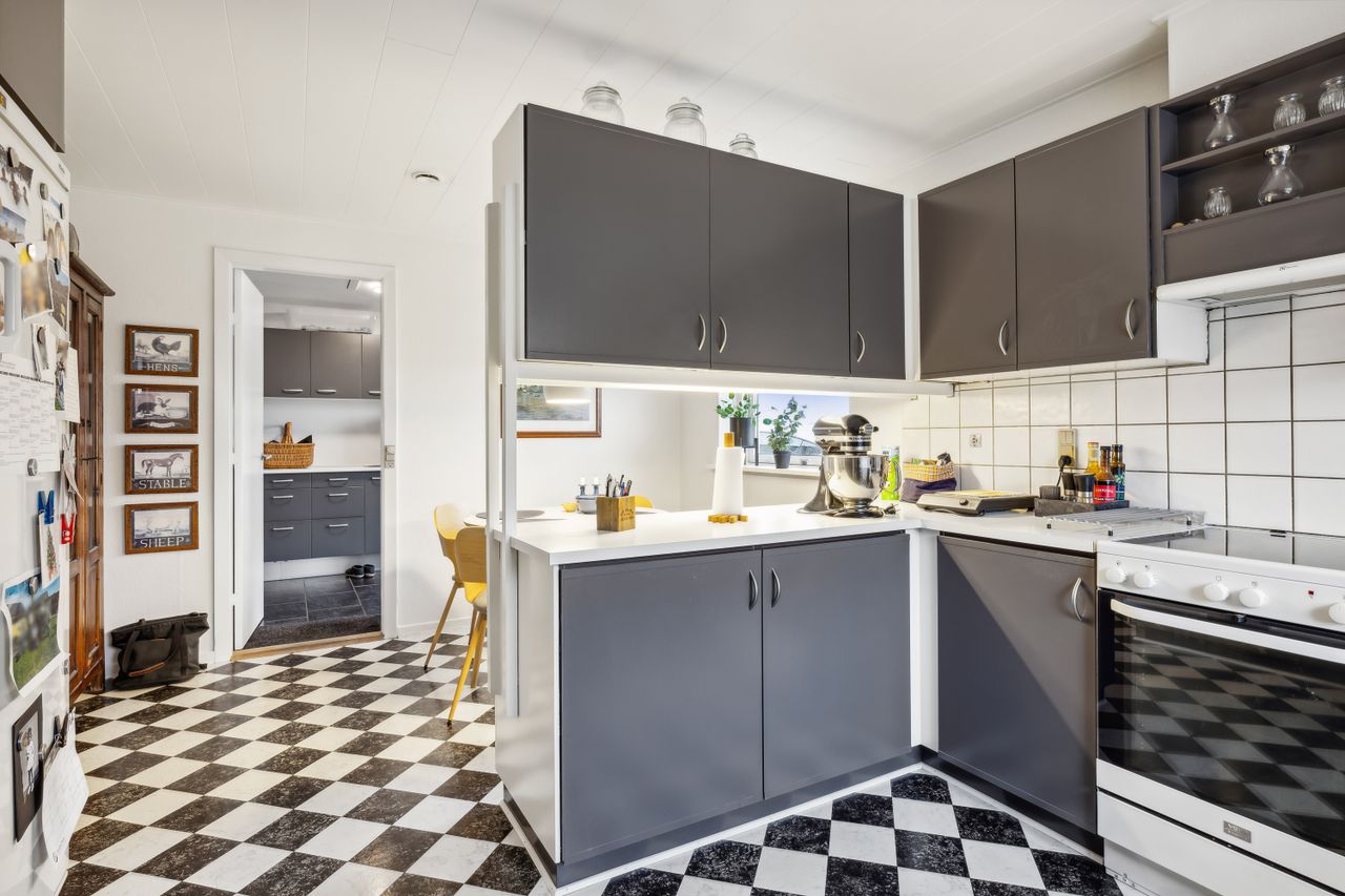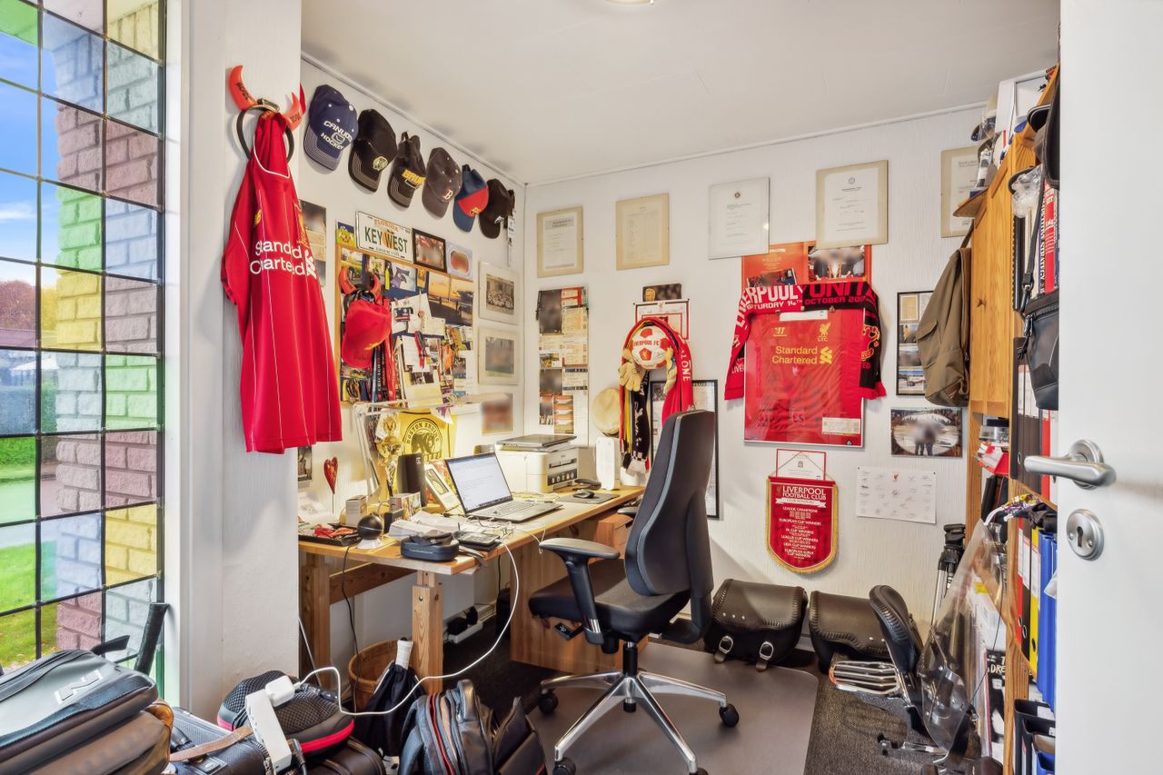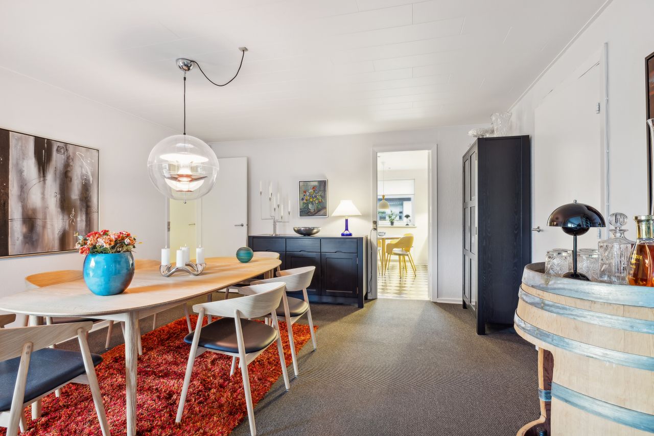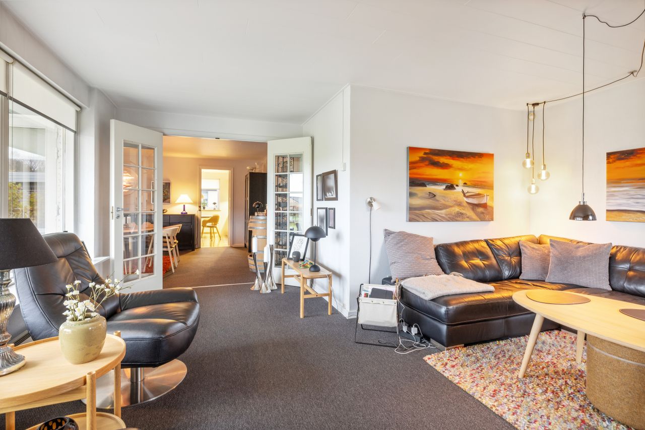 Huset fremstår indbydende og er løbende vedligeholdt, hvilket giver et lyst og imødekommende hjem. Boligen indeholder et praktisk bryggers, et rummeligt køkken-alrum, en hyggelig spisestue og en dagligstue med brændeovn – perfekt til de kolde måneder. Derudover er der en entré med et nyere toilet samt et kontor, som giver plads til hjemmearbejde eller studie. Huset byder også på tre store værelser med indbyggede skabe og et flot moderniseret badeværelse. Såfremt det har interesse for en køber kan en del af møbler i huset medforhandles.