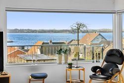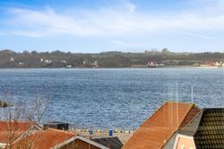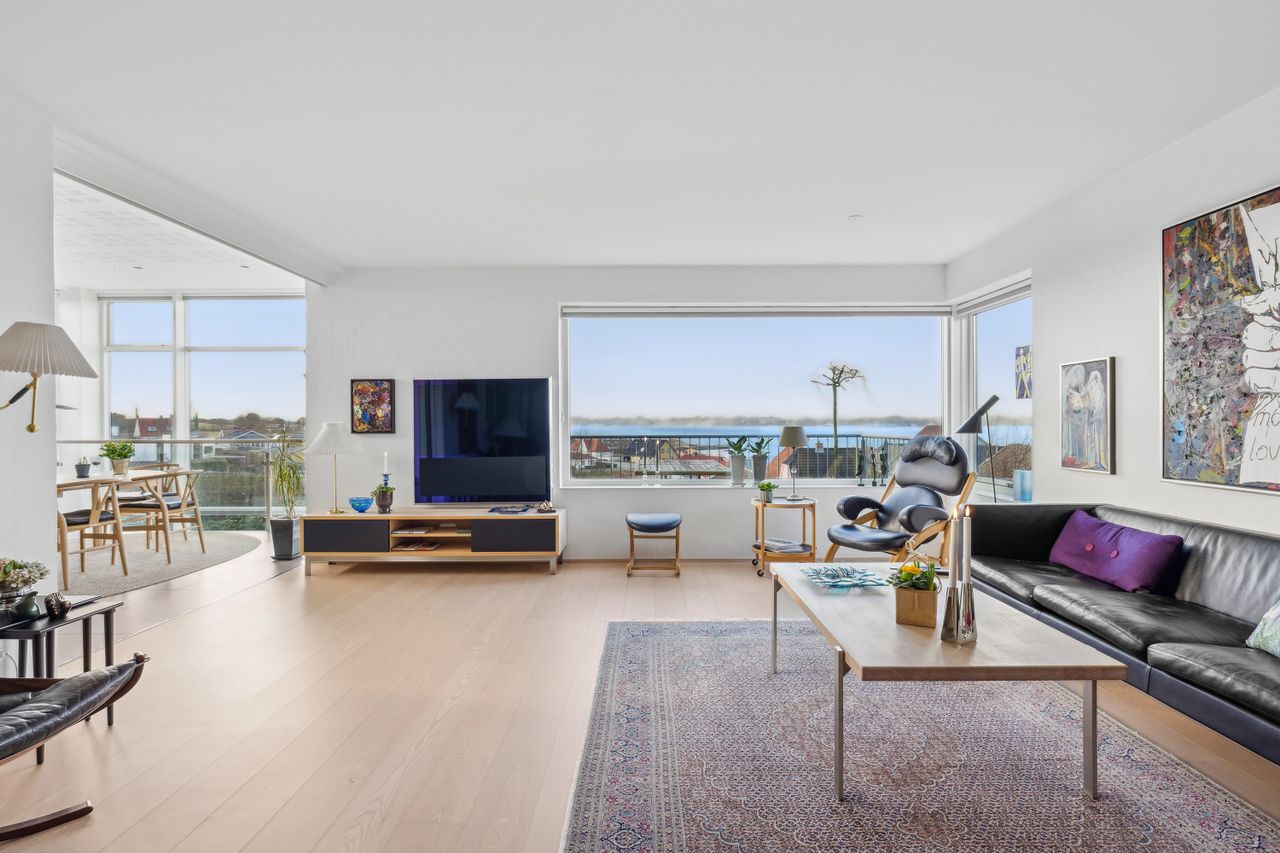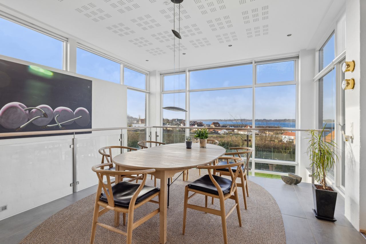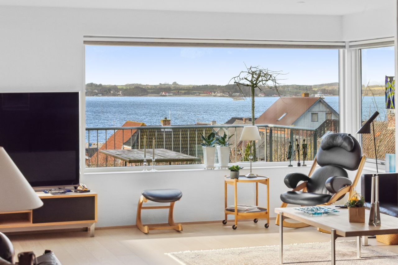 Entre med garderobeplads og adgang til bryggers, køkken-/alrum med trappe til kælderplan, rummelig stue med panoramavinduesparti mod fjorden, soveværelse med adgang til walk-in samt badeværelse, to værelser samt gæstebadeværelse.