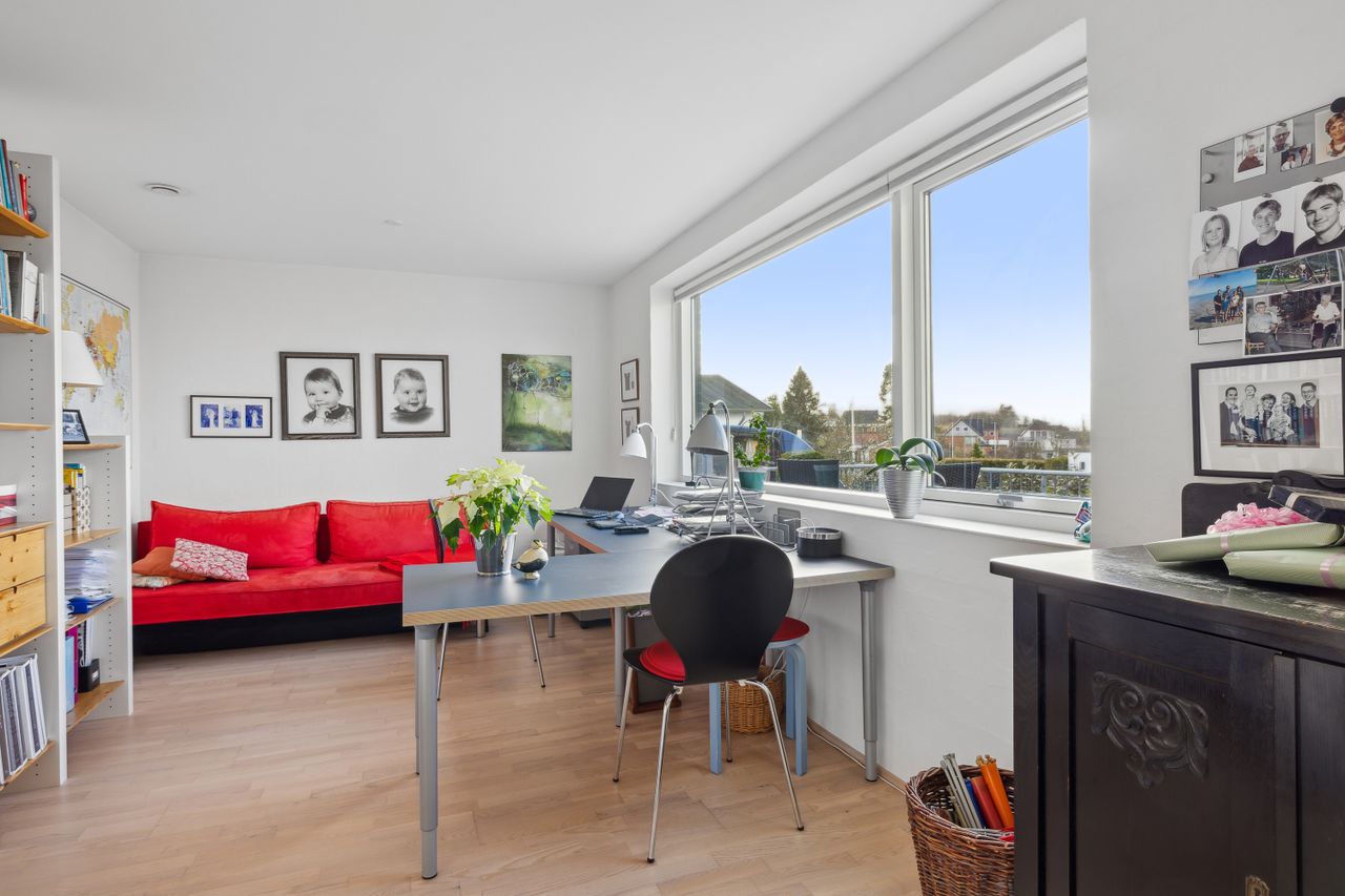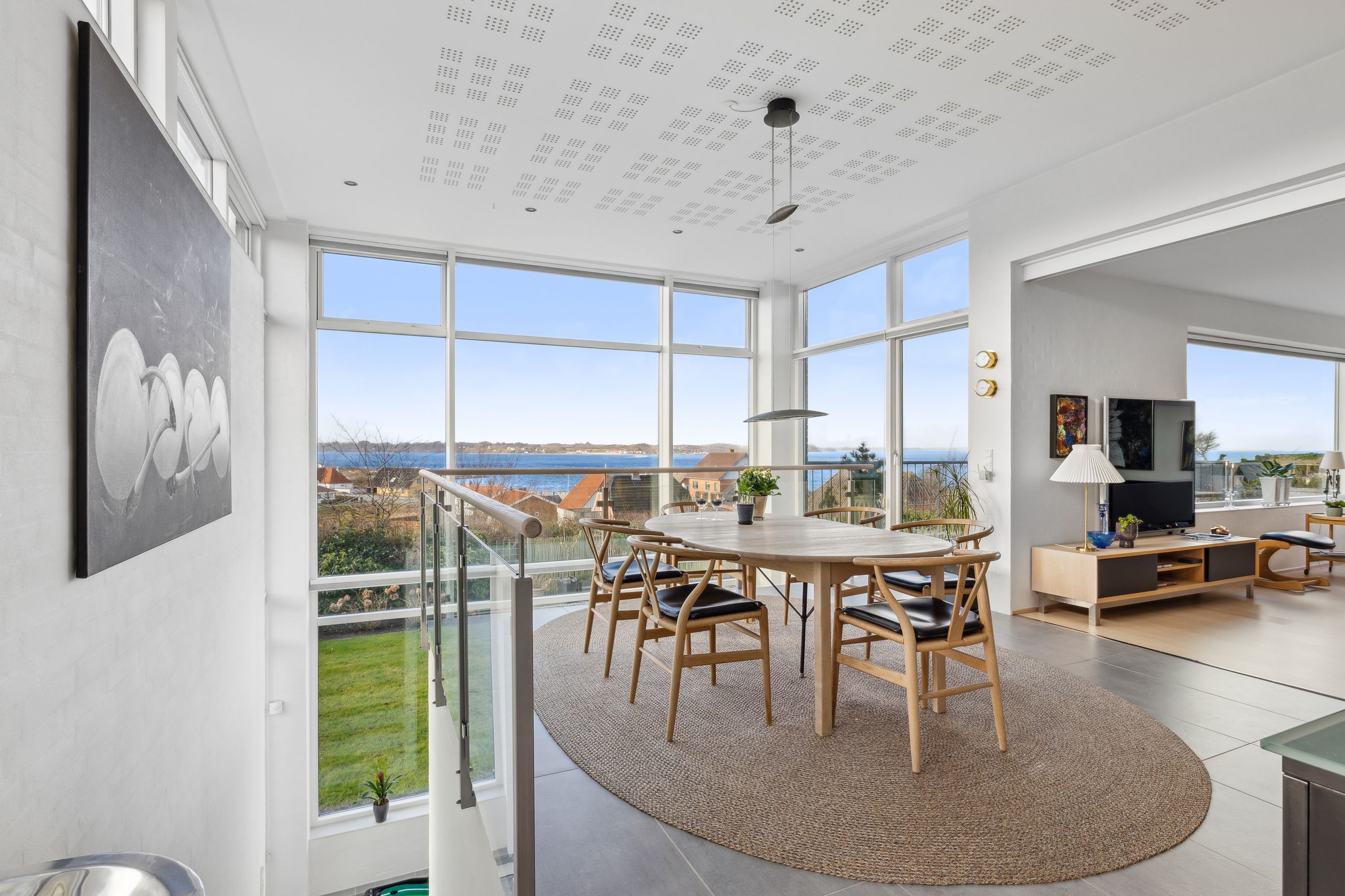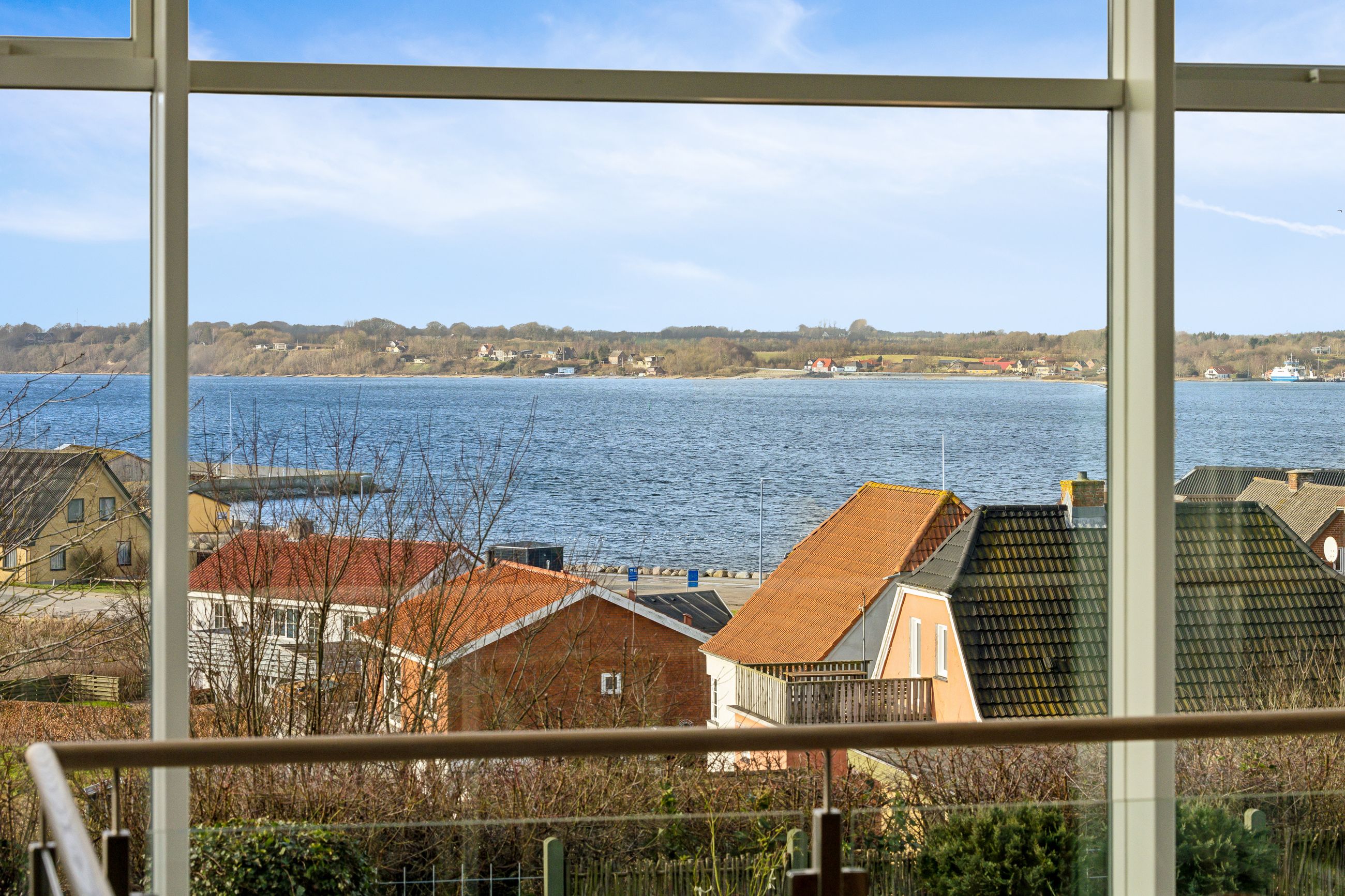 Entre med garderobeplads og adgang til bryggers, køkken-/alrum med trappe til kælderplan, rummelig stue med panoramavinduesparti mod fjorden, soveværelse med adgang til walk-in samt badeværelse, to værelser samt gæstebadeværelse.