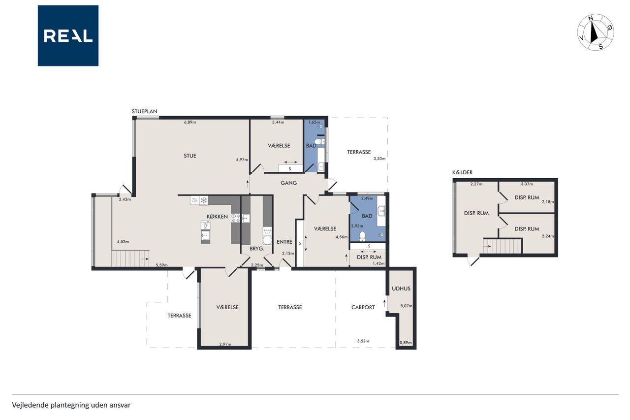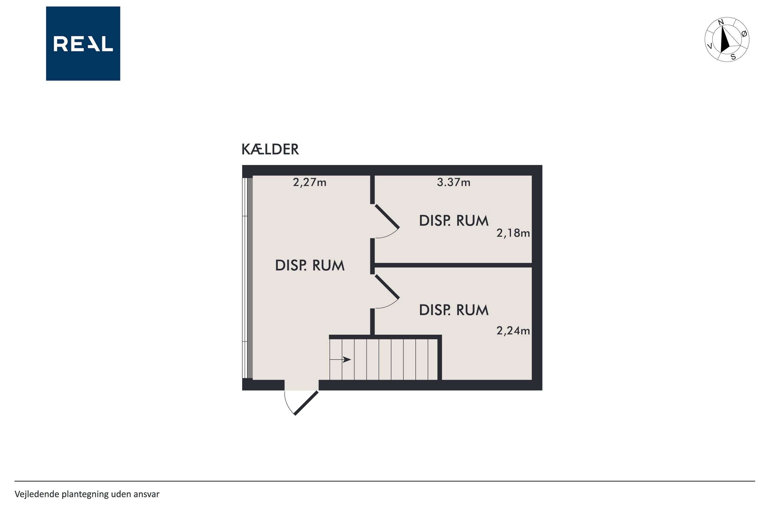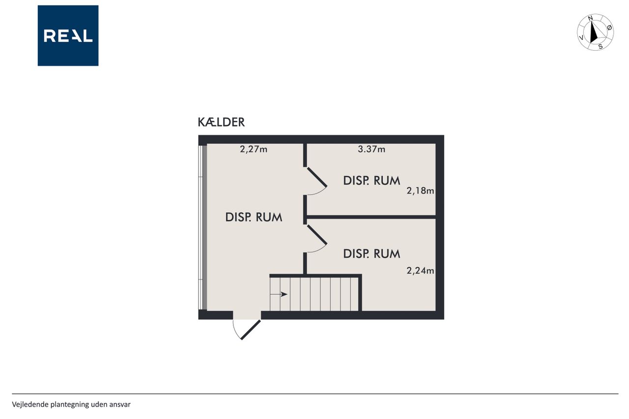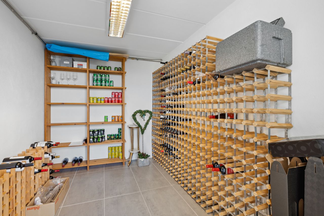 Kælderplan indeholder to store selvstændige disponible rum samt stort åbent rum, der ligger i åben forbindelse med stueplan og hvortil der er særskilt indgang fra haven.