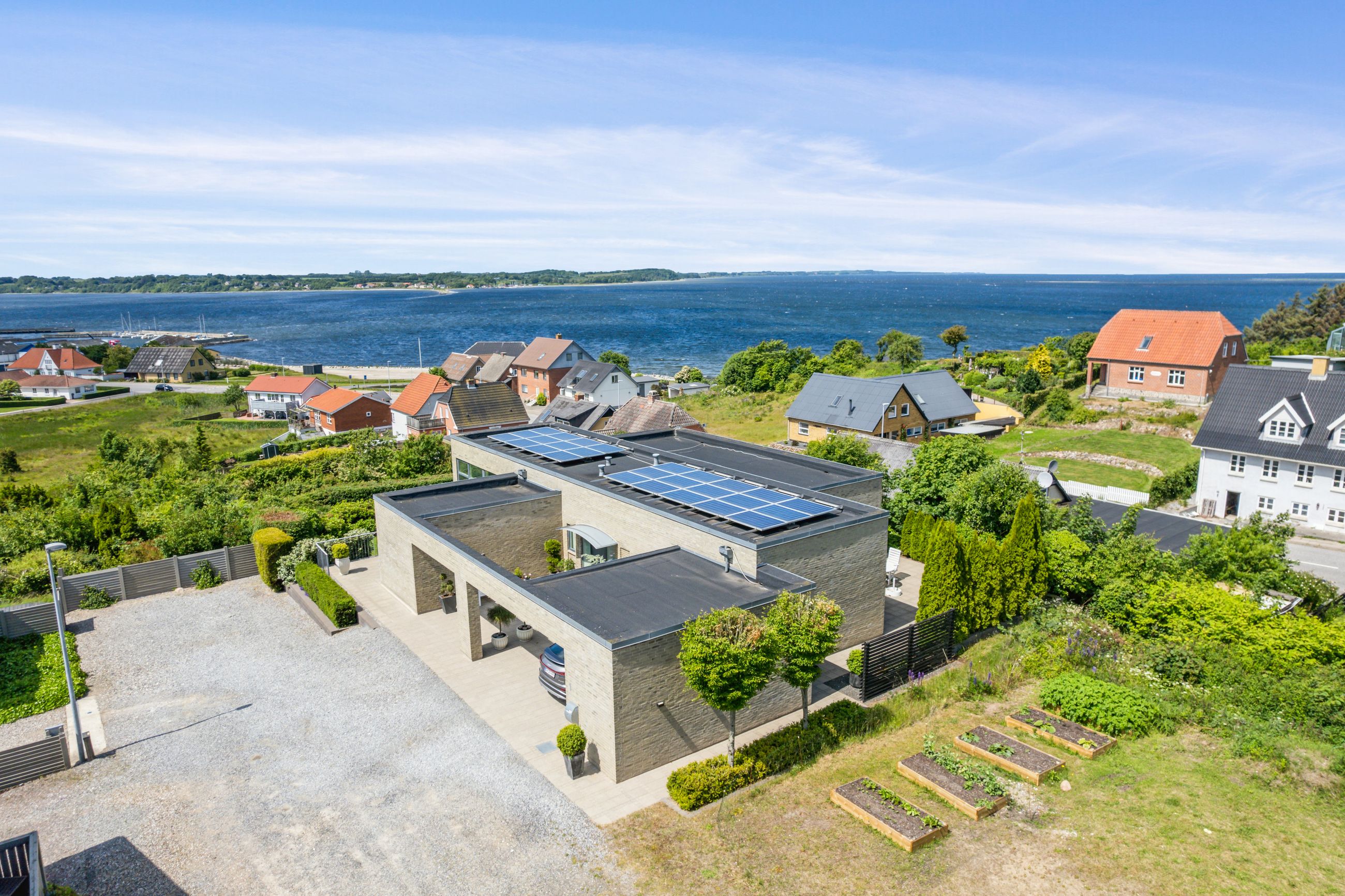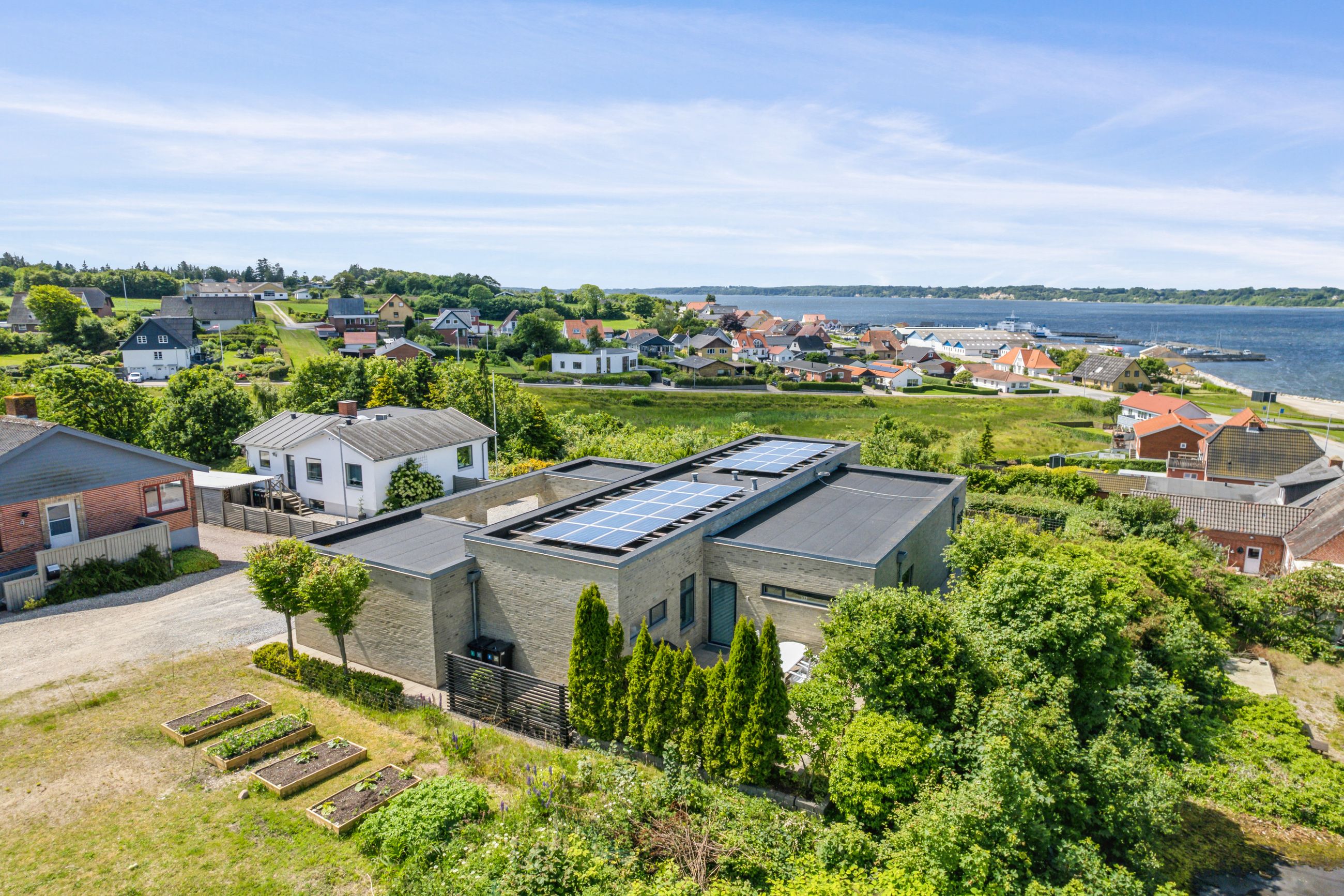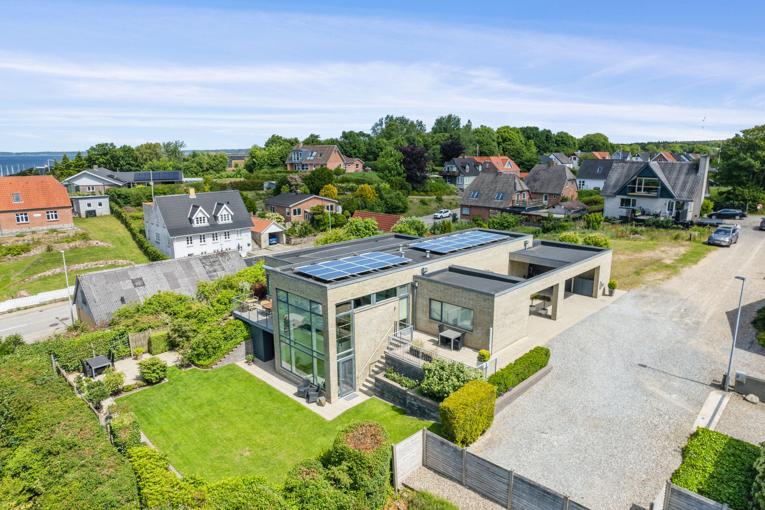 Lavt varmeforbrug og 6 kw solcelleanlæg diskret placeret på den flade taghældning.