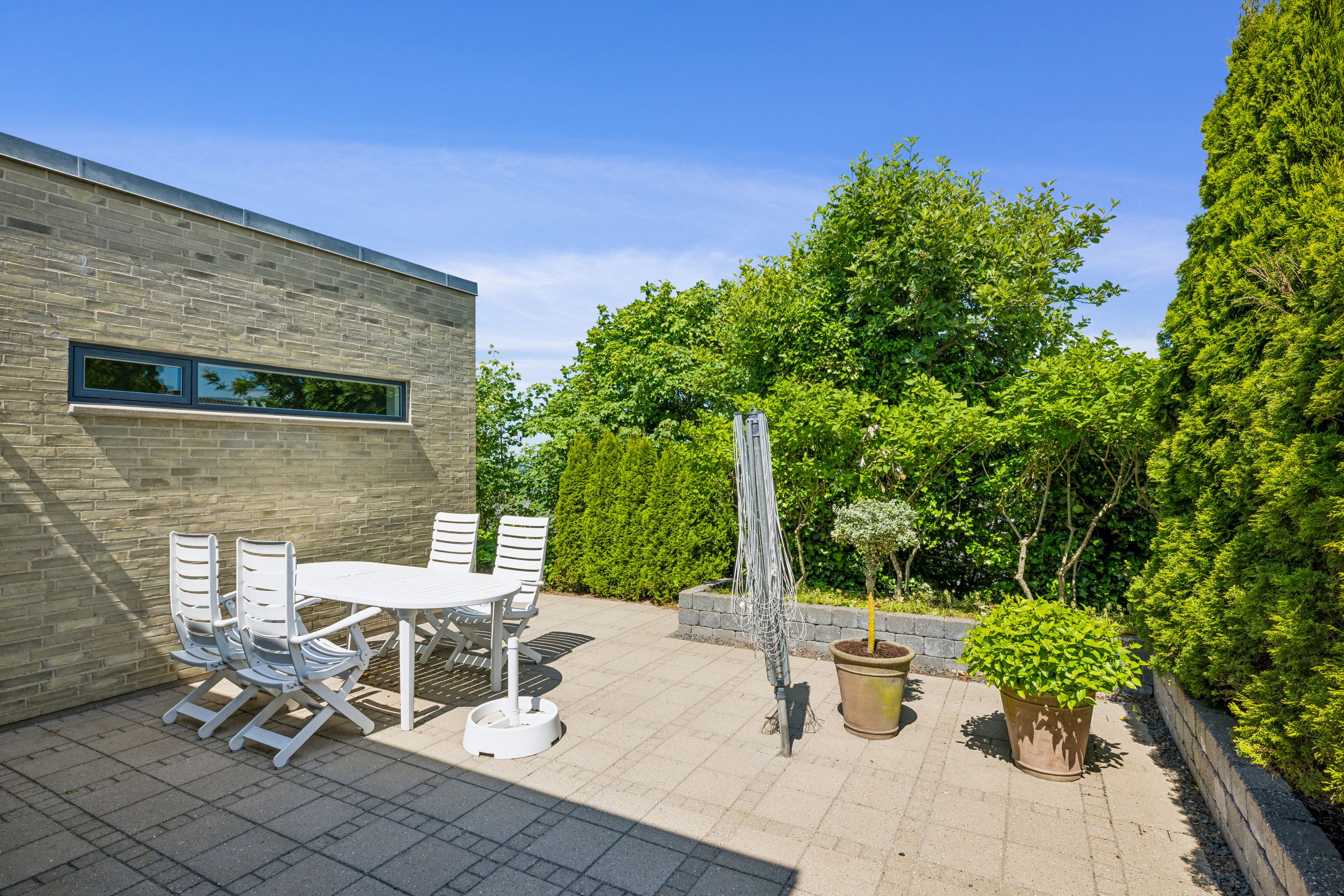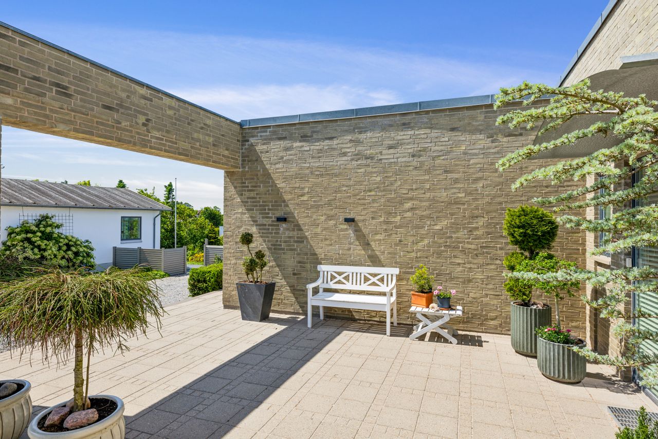 Der er morgenterrasse mod øst, flisebelagte terrassearealer mod syd og flot hævet terrasseareal i galvaniseret stål med gulvbelægning i træ mod vest, der kan tilgås fra køkken-/alrummet. Der er således mulighed for at finde sol hele dagen på rigtig skønne terrassearealer i tæt tilknytning til beboelsen.