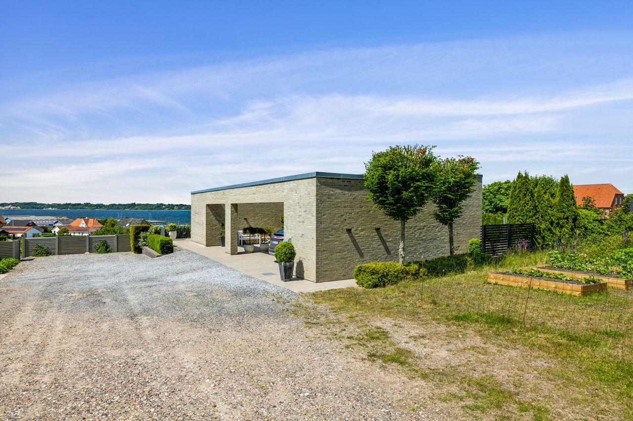 Der er dobbelt carport til bilparkering samt udhus til cykler, plæneklipper mv..