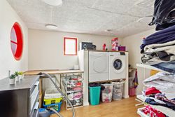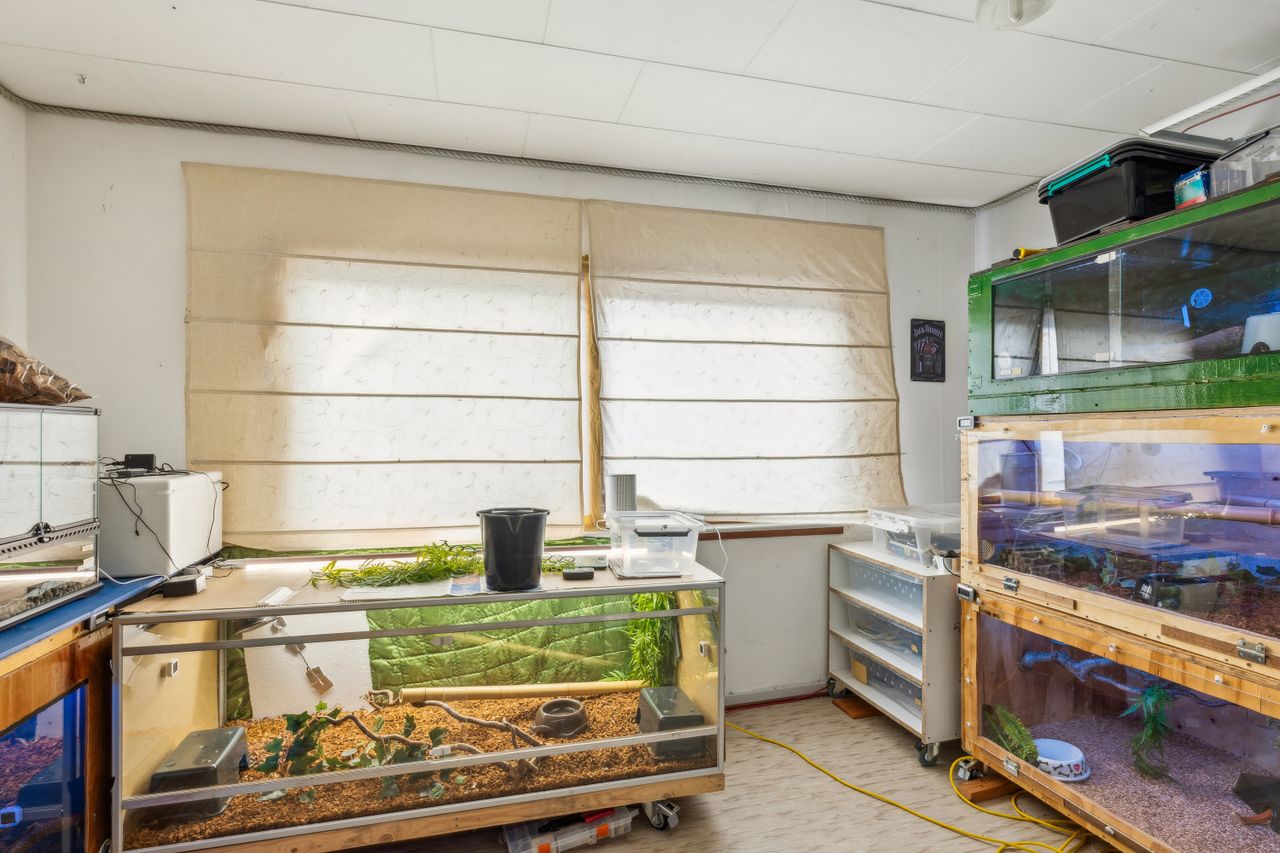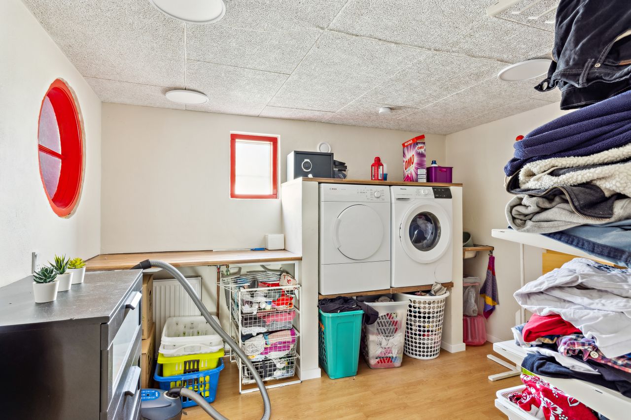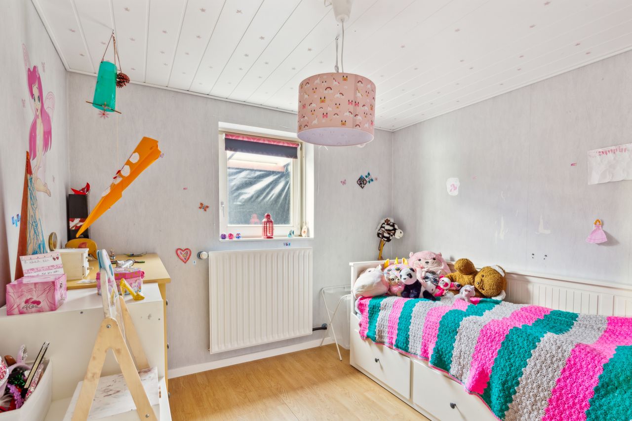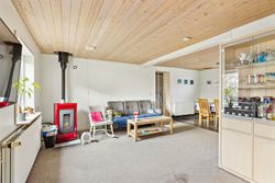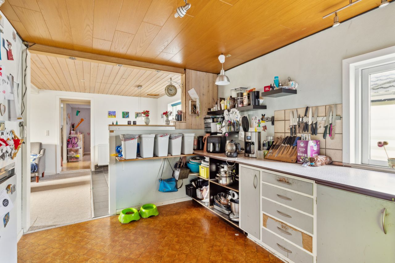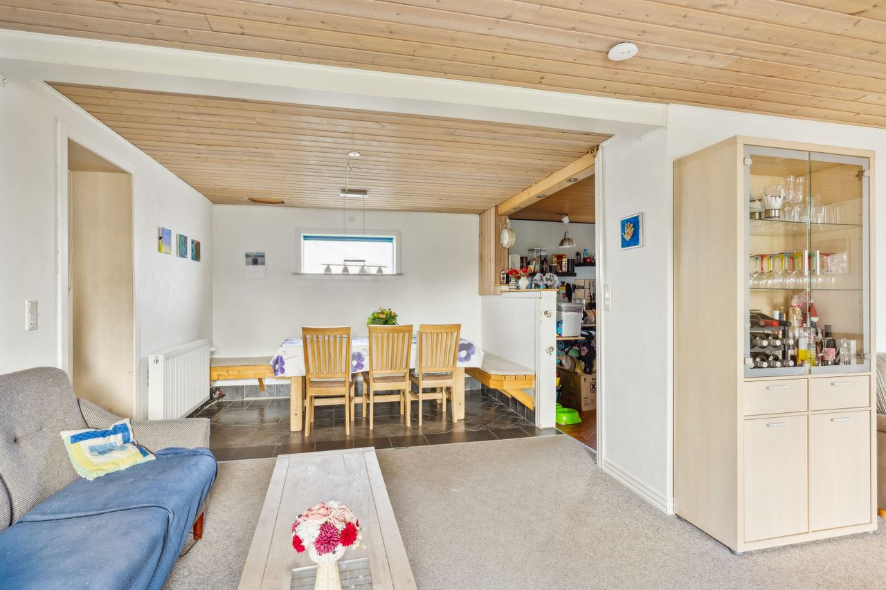 Indretningen består af et stort køkken og en stor, åben stue med udgang til terrasse. Herudover finder du hele syv værelser, et badeværelse og et praktisk vaskerum.