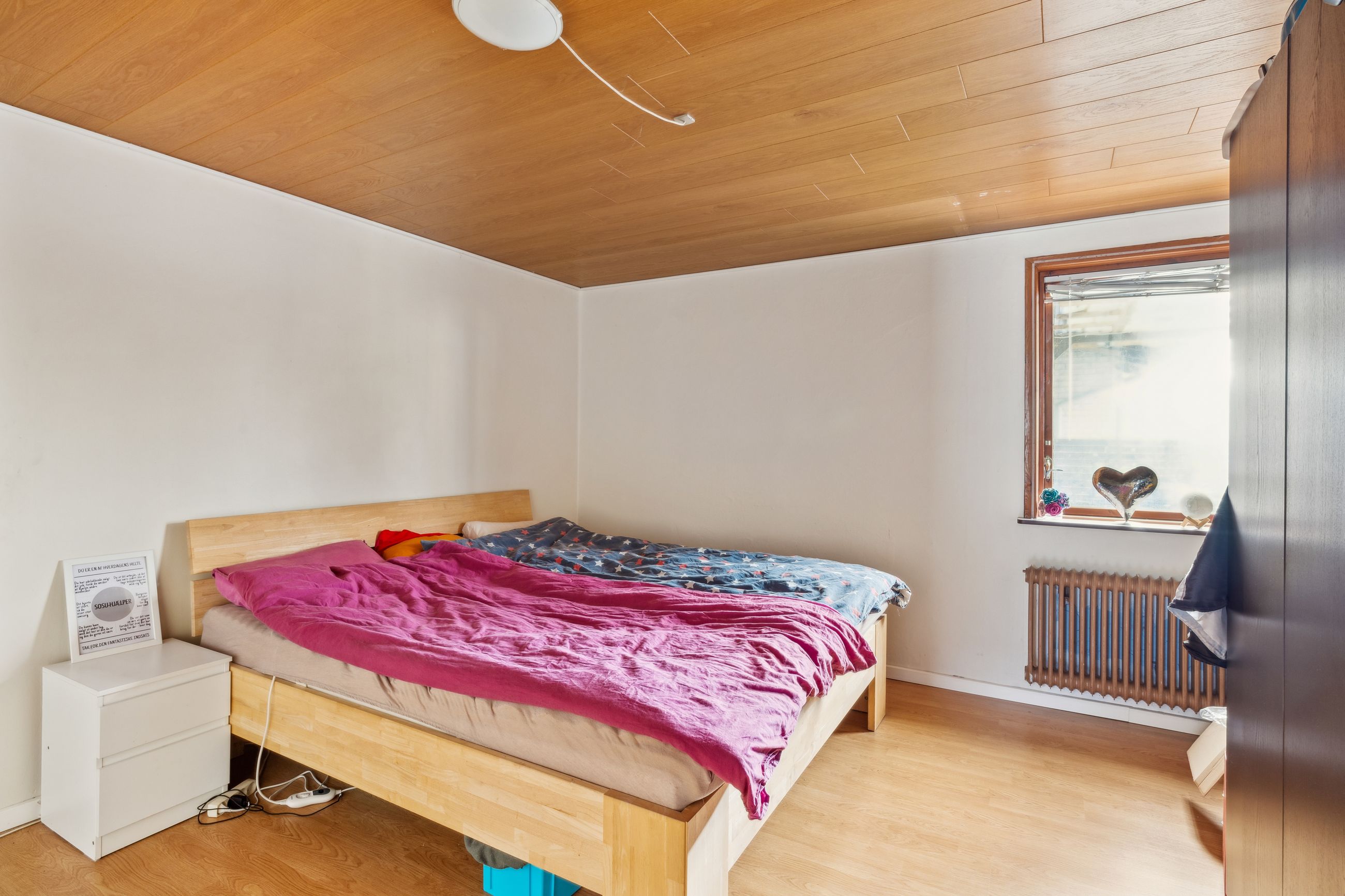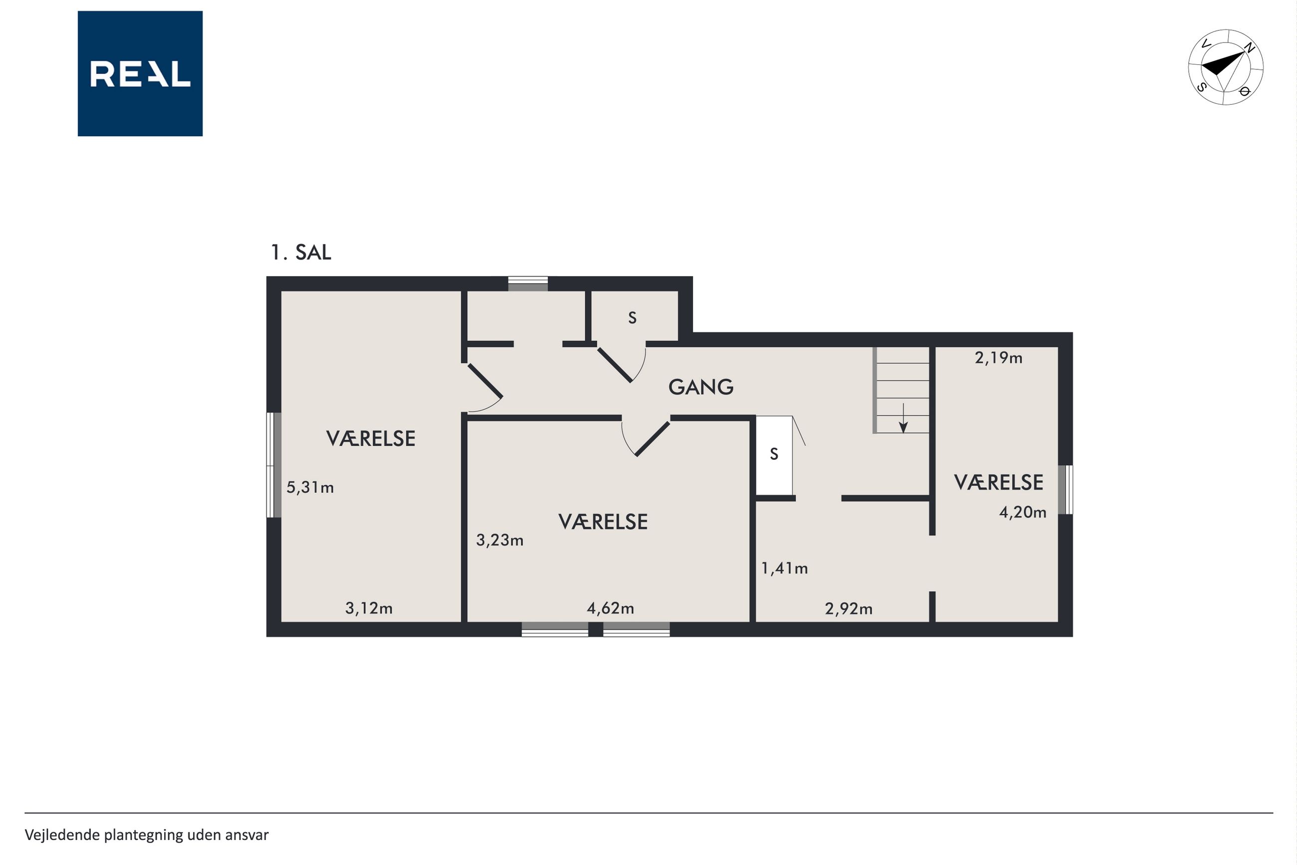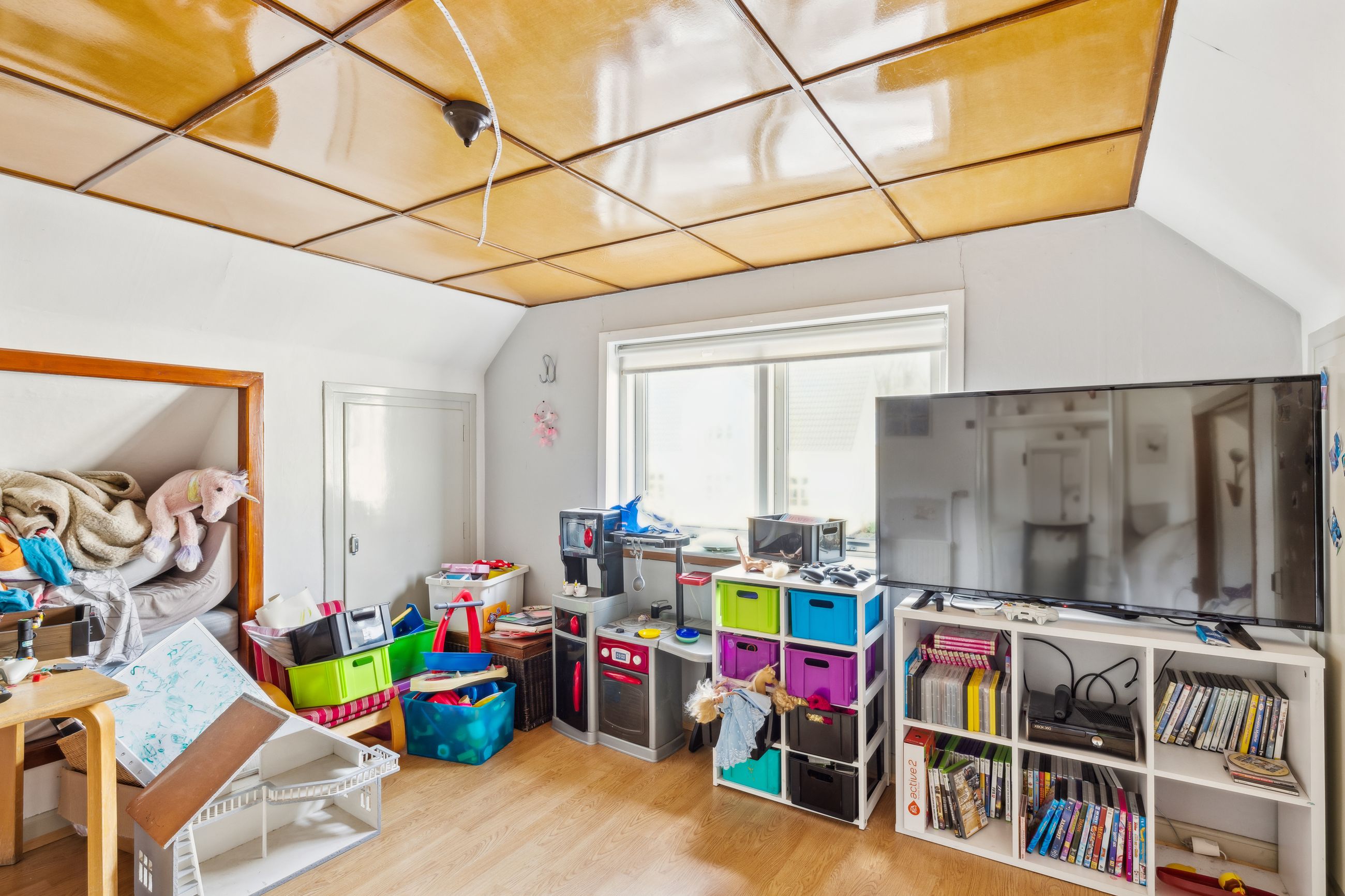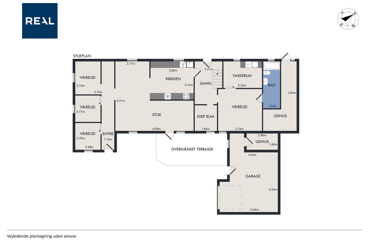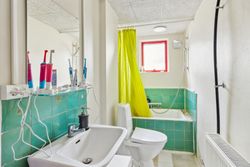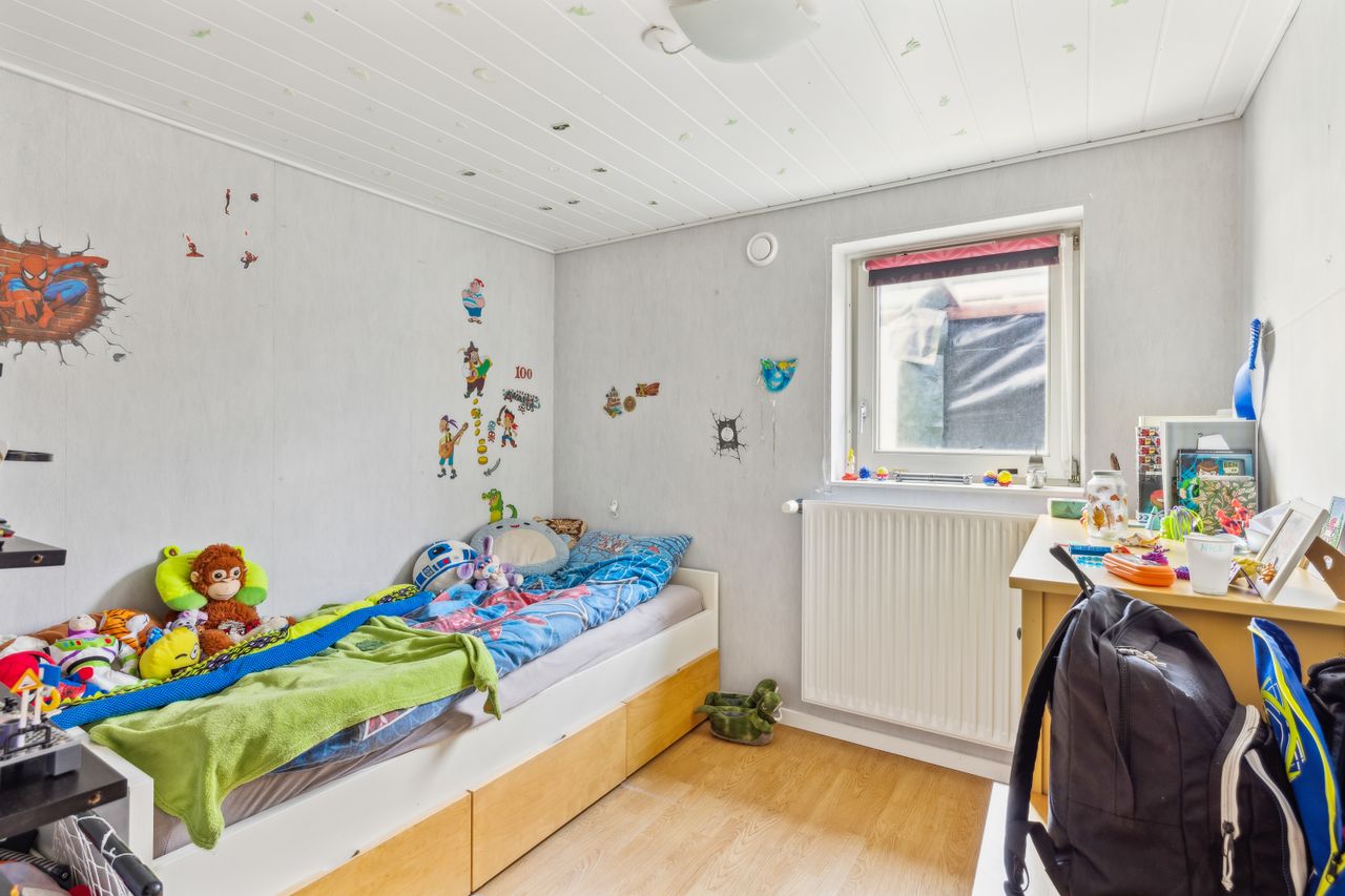 Indretningen består af et stort køkken og en stor, åben stue med udgang til terrasse. Herudover finder du hele syv værelser, et badeværelse og et praktisk vaskerum.