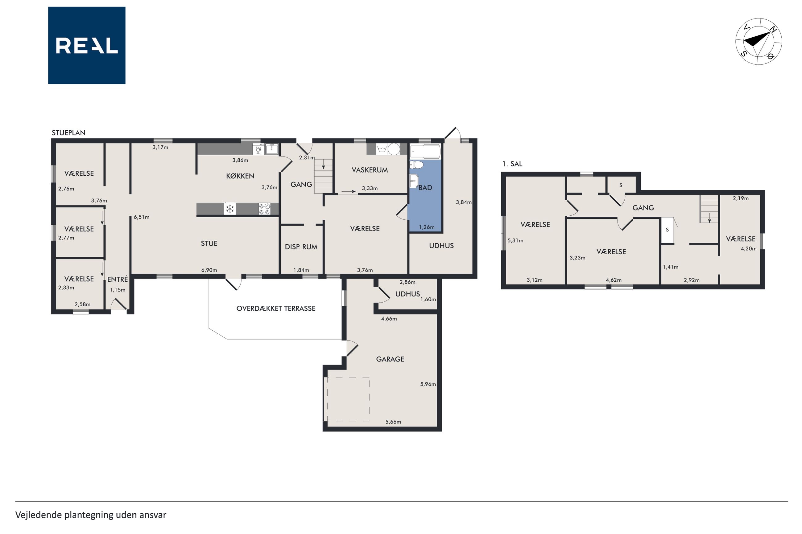 Udendørs venter en stor have og rummelig garage med tilhørende udhuse til opbevaring, værksted eller andre hobbyaktiviteter.