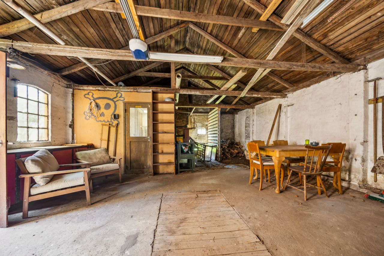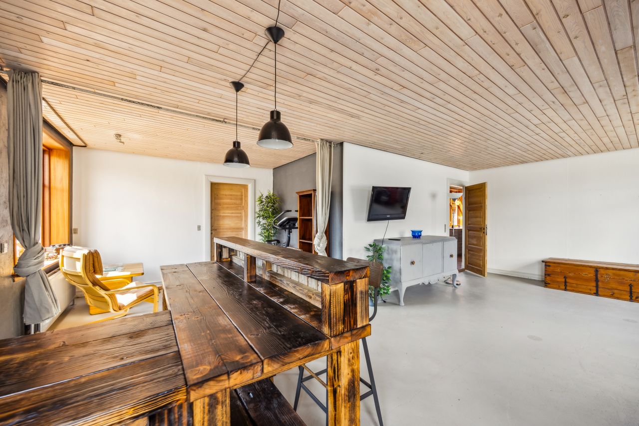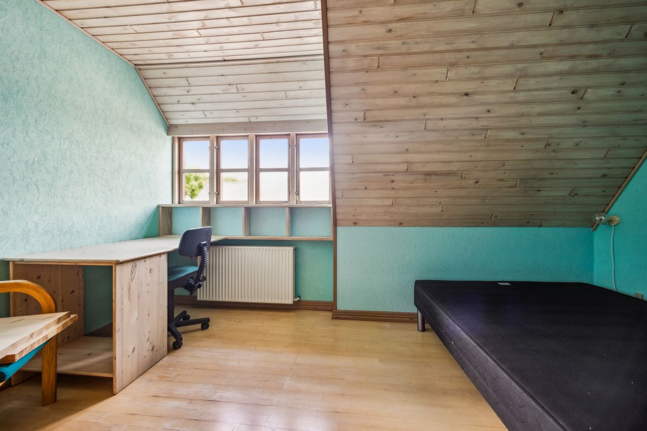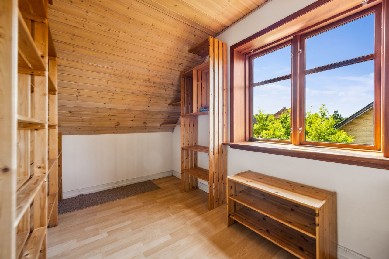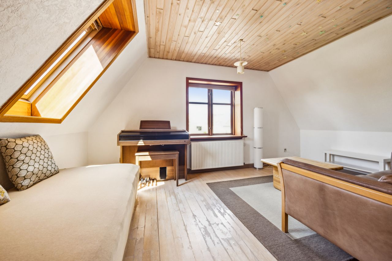 På første sal er der en rummelig repos og en opholdsstue, et badeværelse med toilet, bruserum og sauna, et soveværelse med masser af skabsplads samt yderligere tre værelser – alle med faste skabe – og et depotrum.