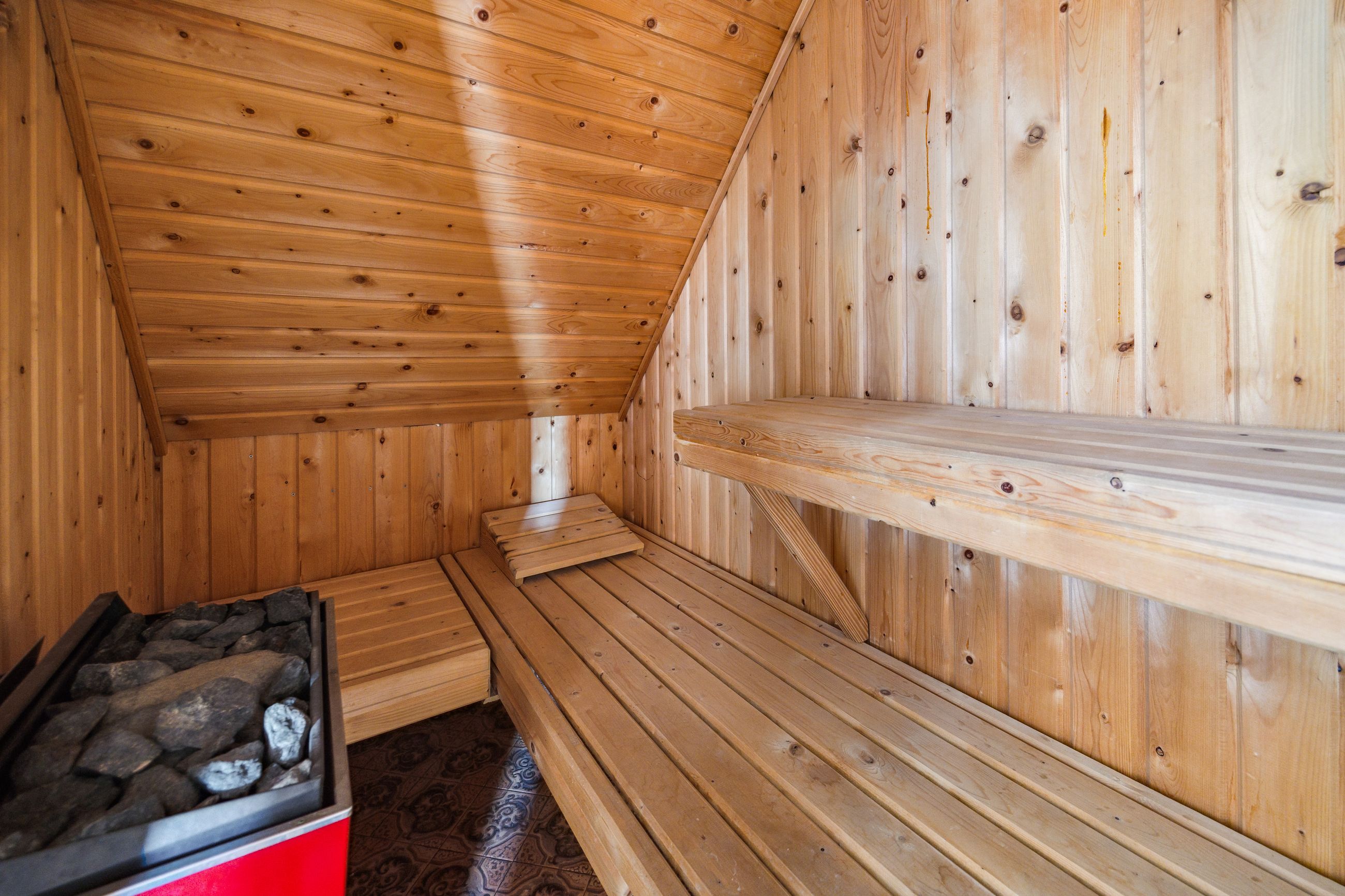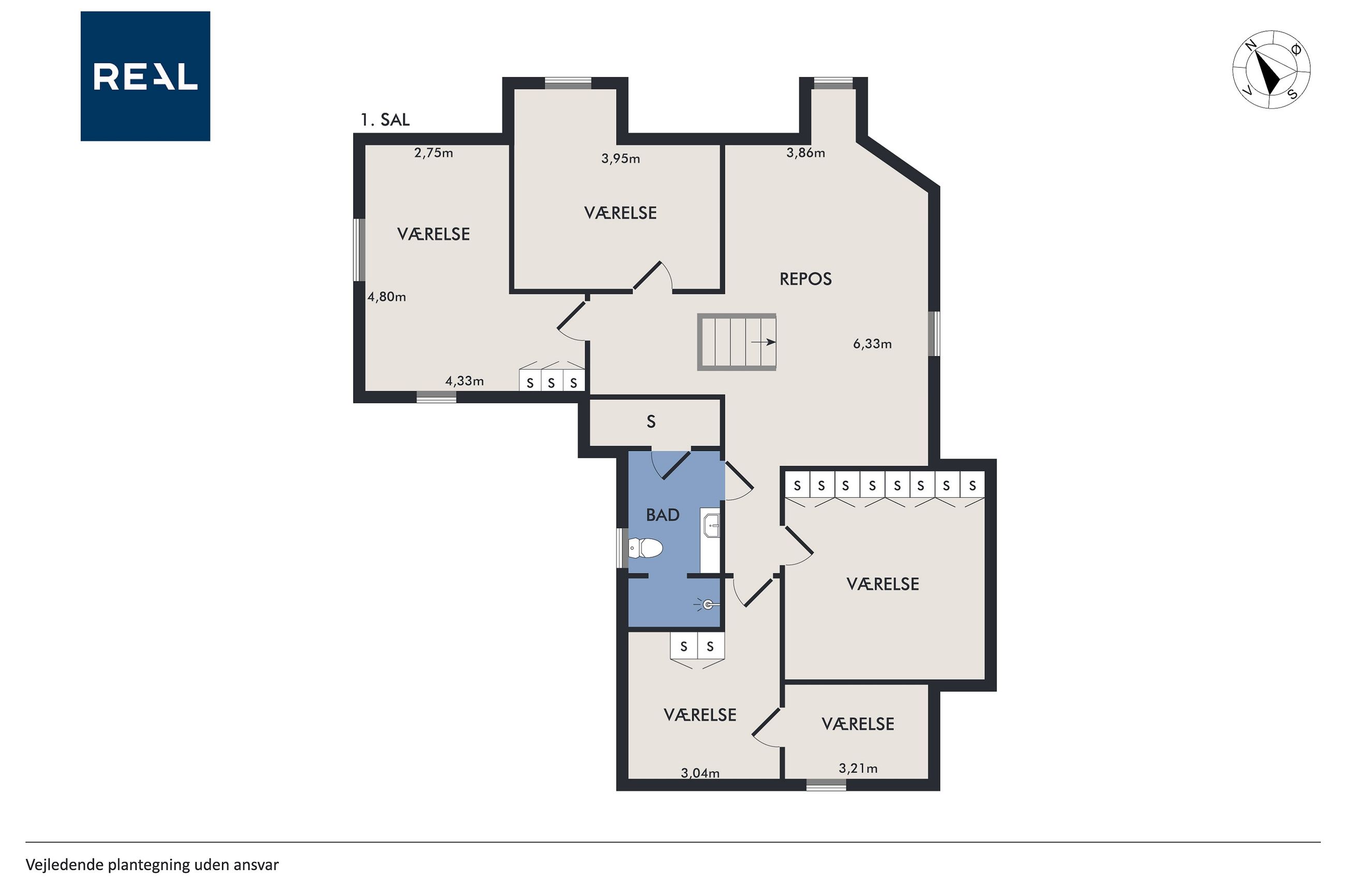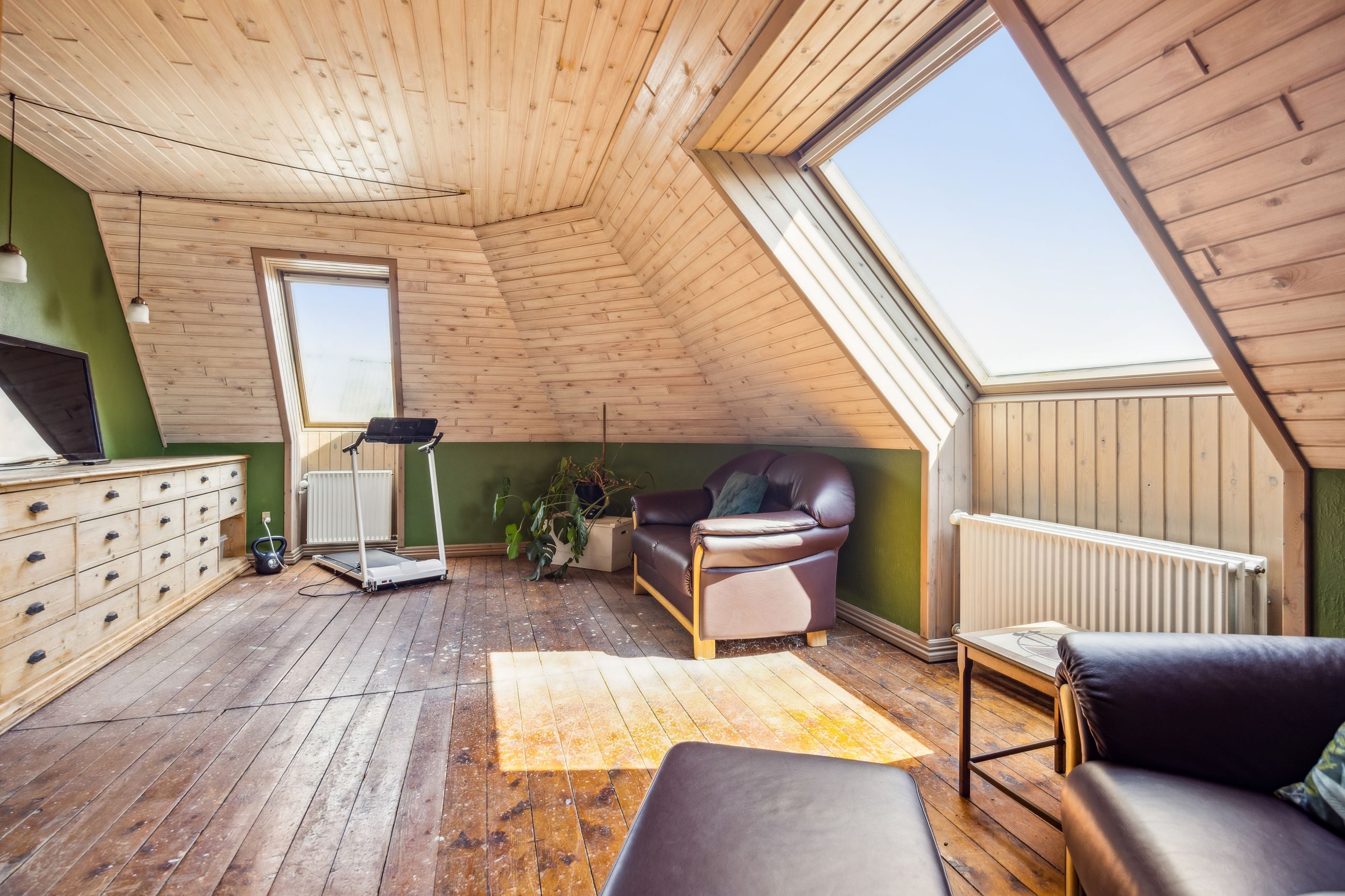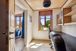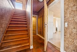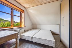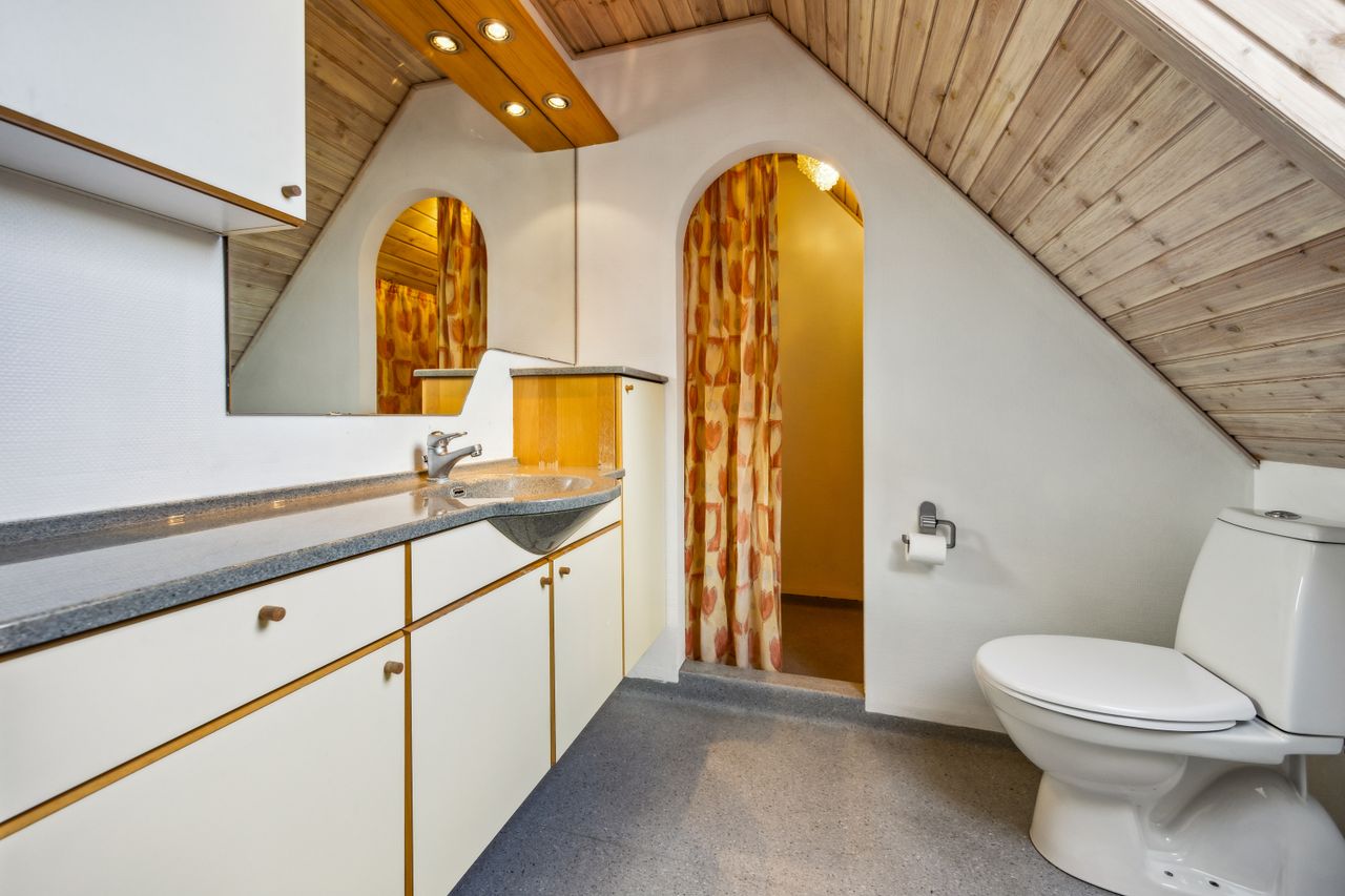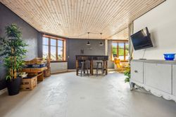 På første sal er der en rummelig repos og en opholdsstue, et badeværelse med toilet, bruserum og sauna, et soveværelse med masser af skabsplads samt yderligere tre værelser – alle med faste skabe – og et depotrum.