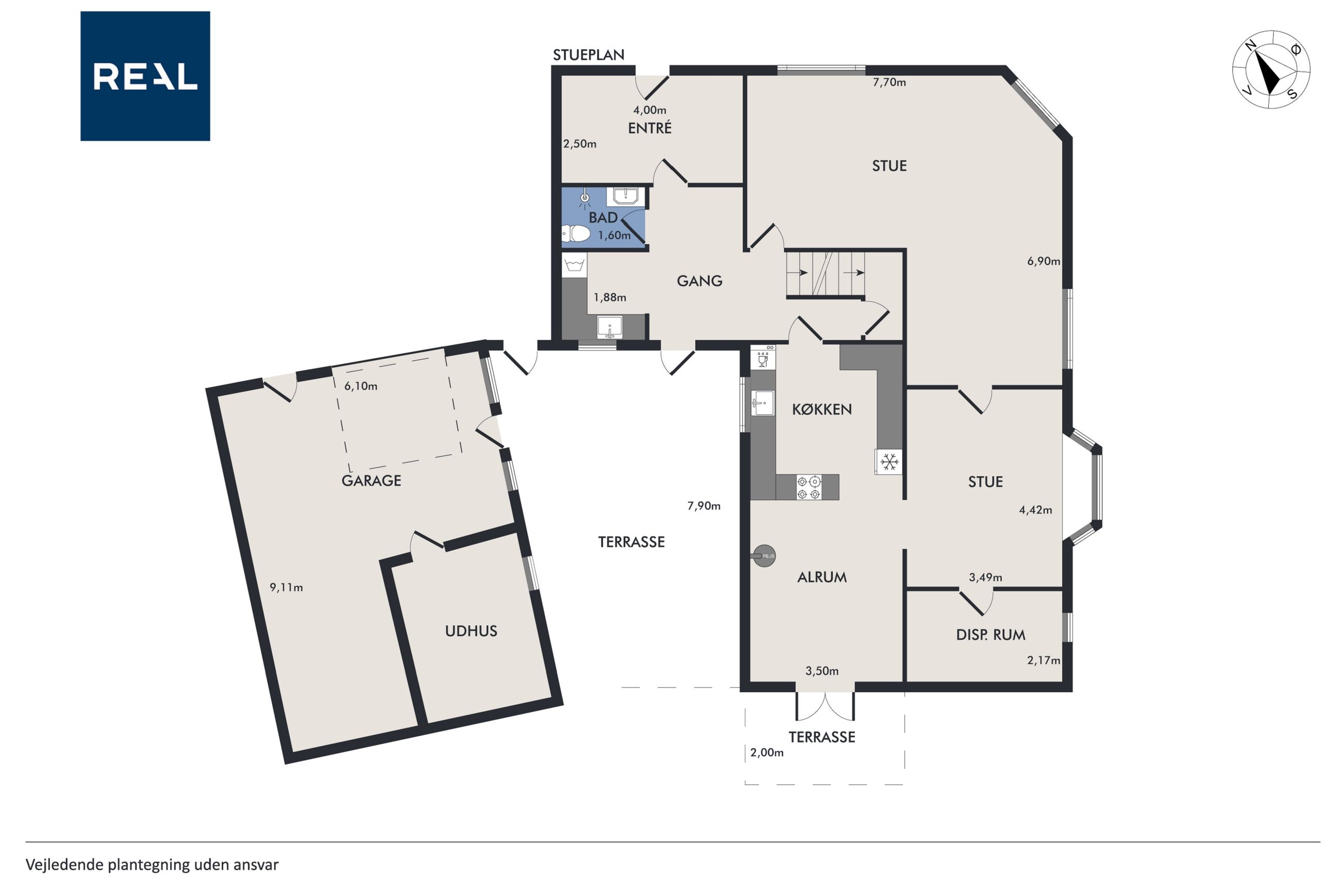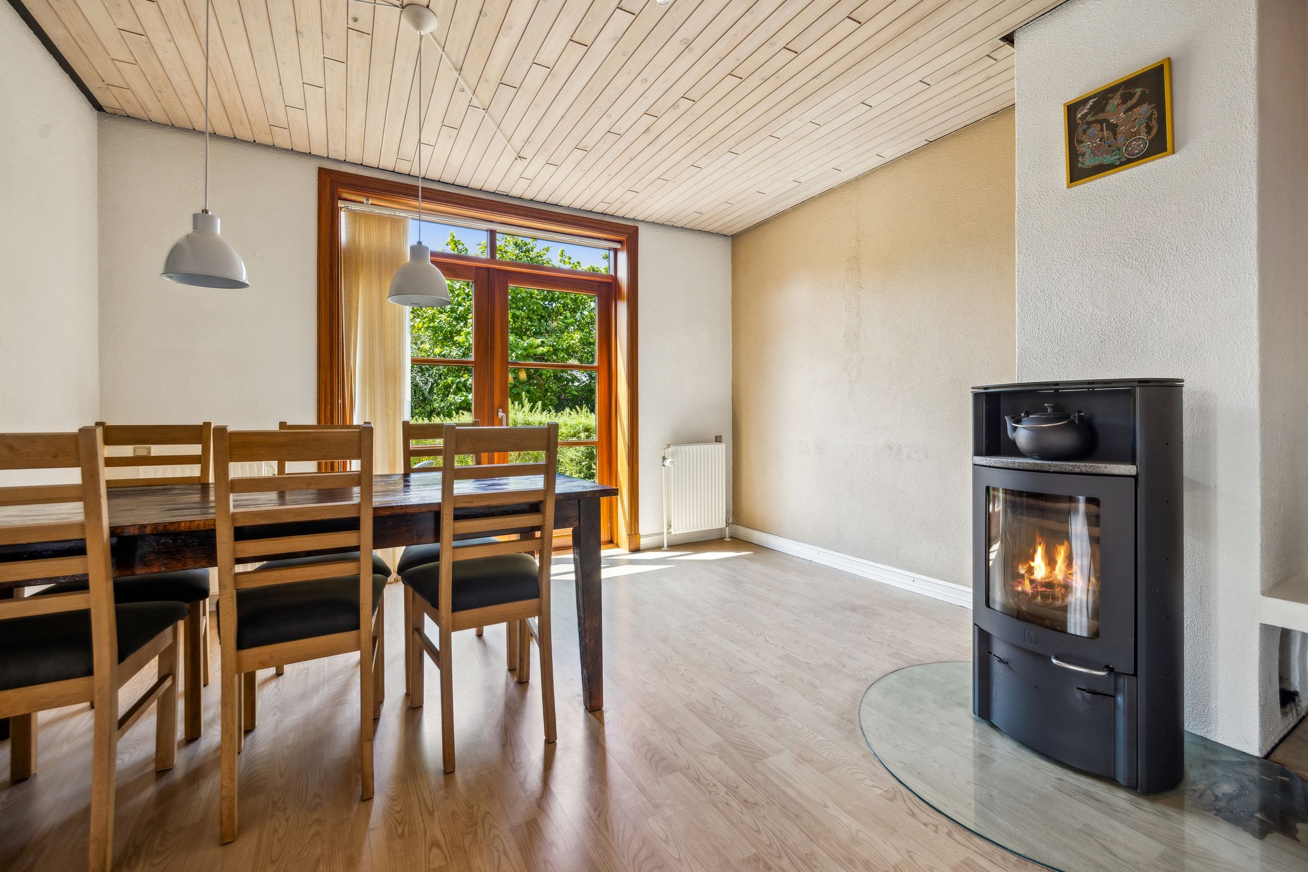 Indretningen i stueplan består af en entre og baggang med nyere skabselementer, et badeværelse med bruser, toilet og vask i skabsarrangement samt gulvvarme. Herudover finder du en stor vinkelstue, en dagligstue med god plads, et kontor/værelse og et dejligt køkken-alrum med brændeovn og direkte udgang til terrasse og have.