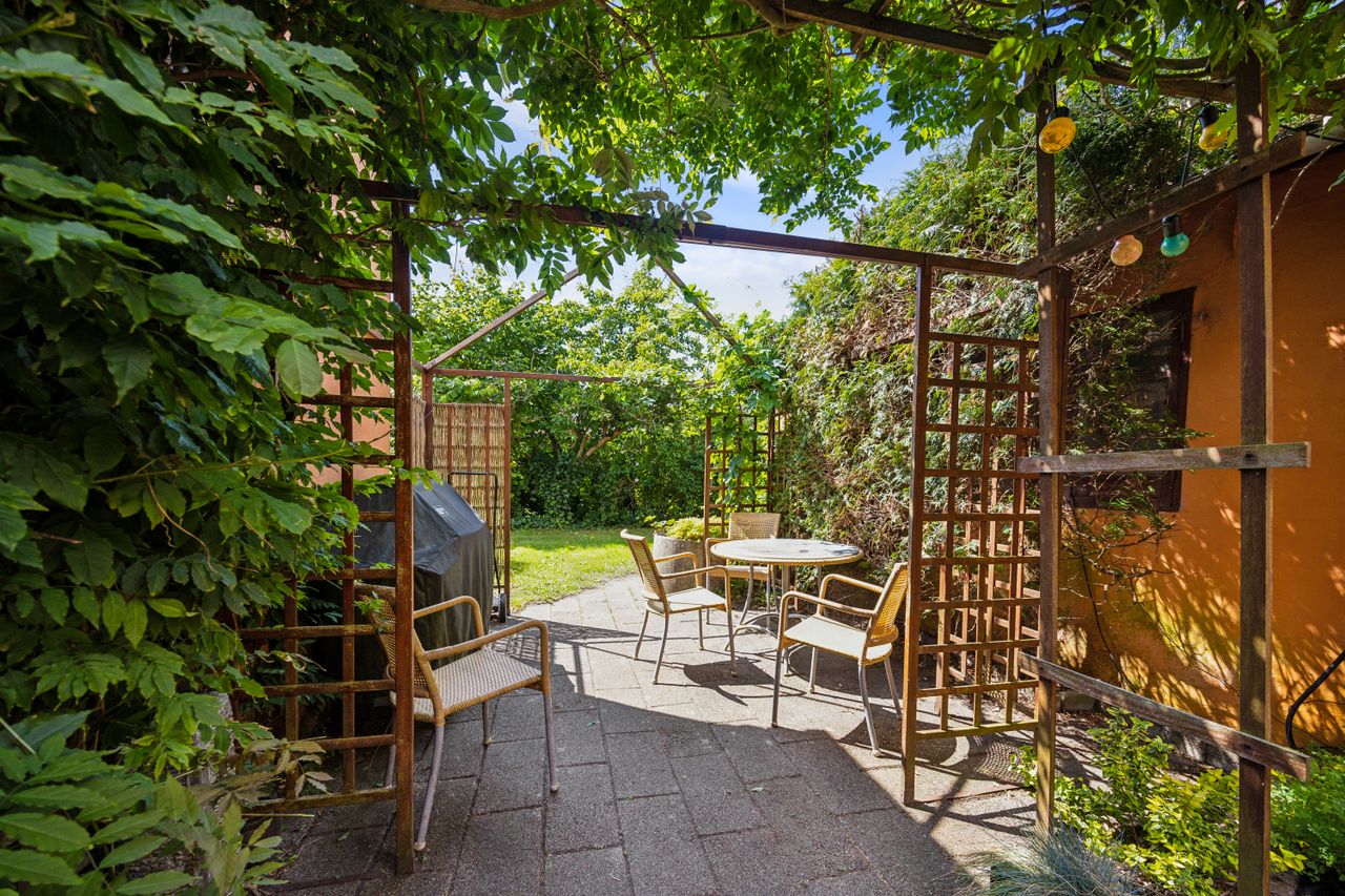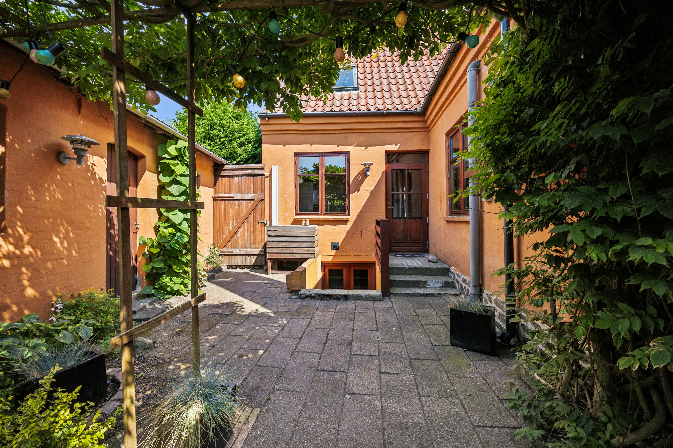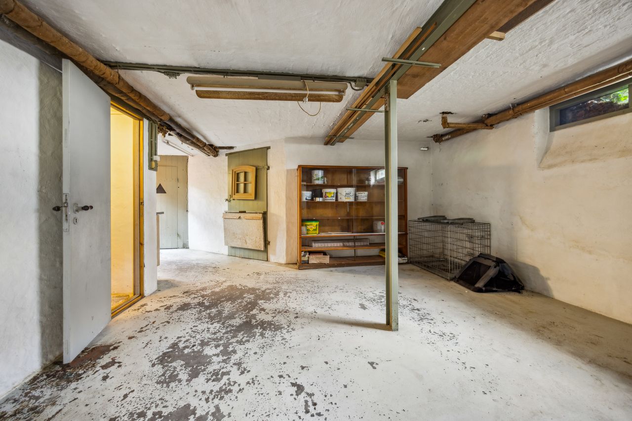 Villaen byder på en lukket og ugeneret gårdhave samt et garageanlæg på 60 m2. Kælderen er godt indrettet og anvendelig, og her har sælger indrettet et funktionelt værksted. Derudover er der olietank og oliefyr, men der er også mulighed for tilslutning til gas, hvis det ønskes.