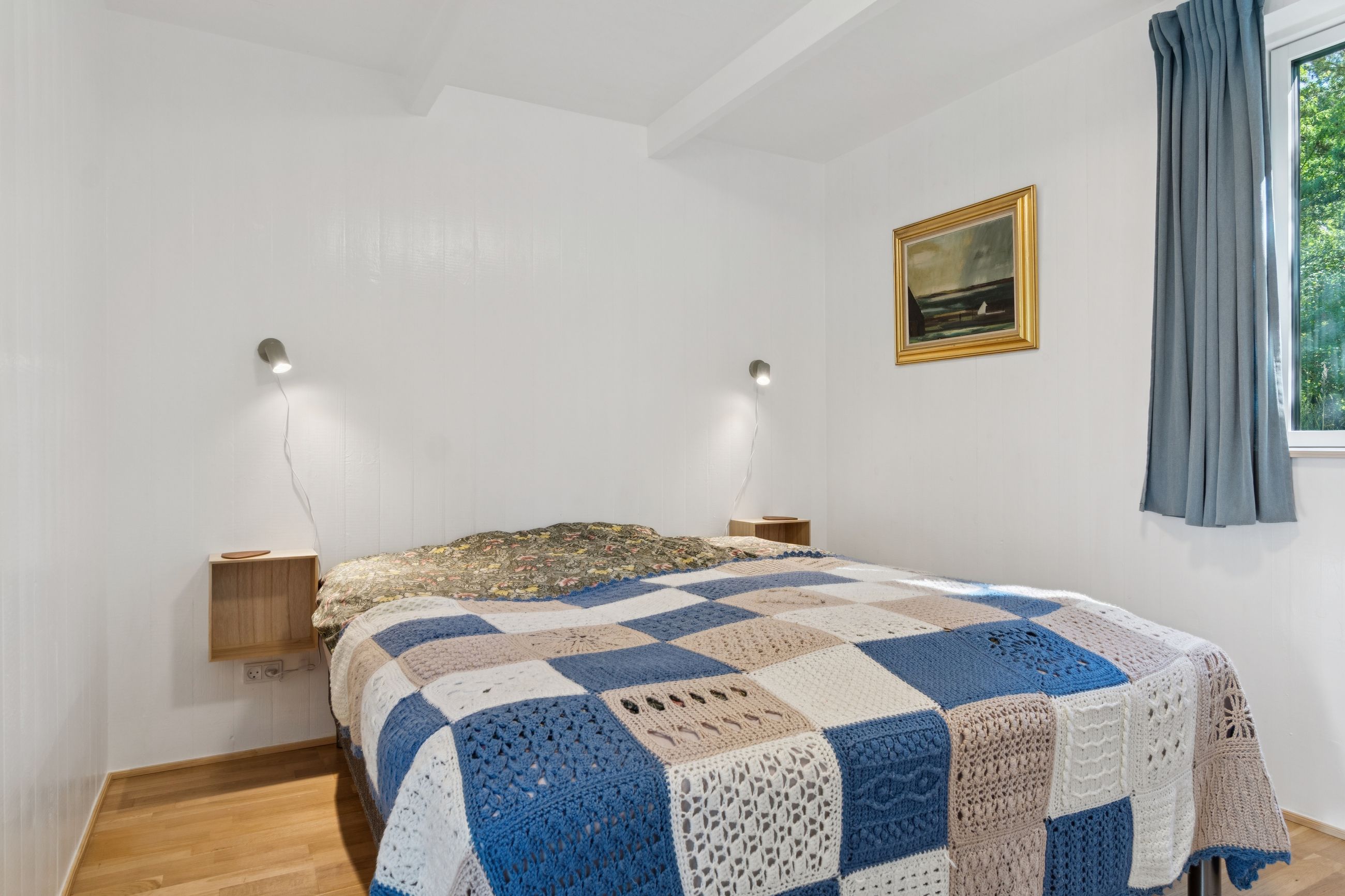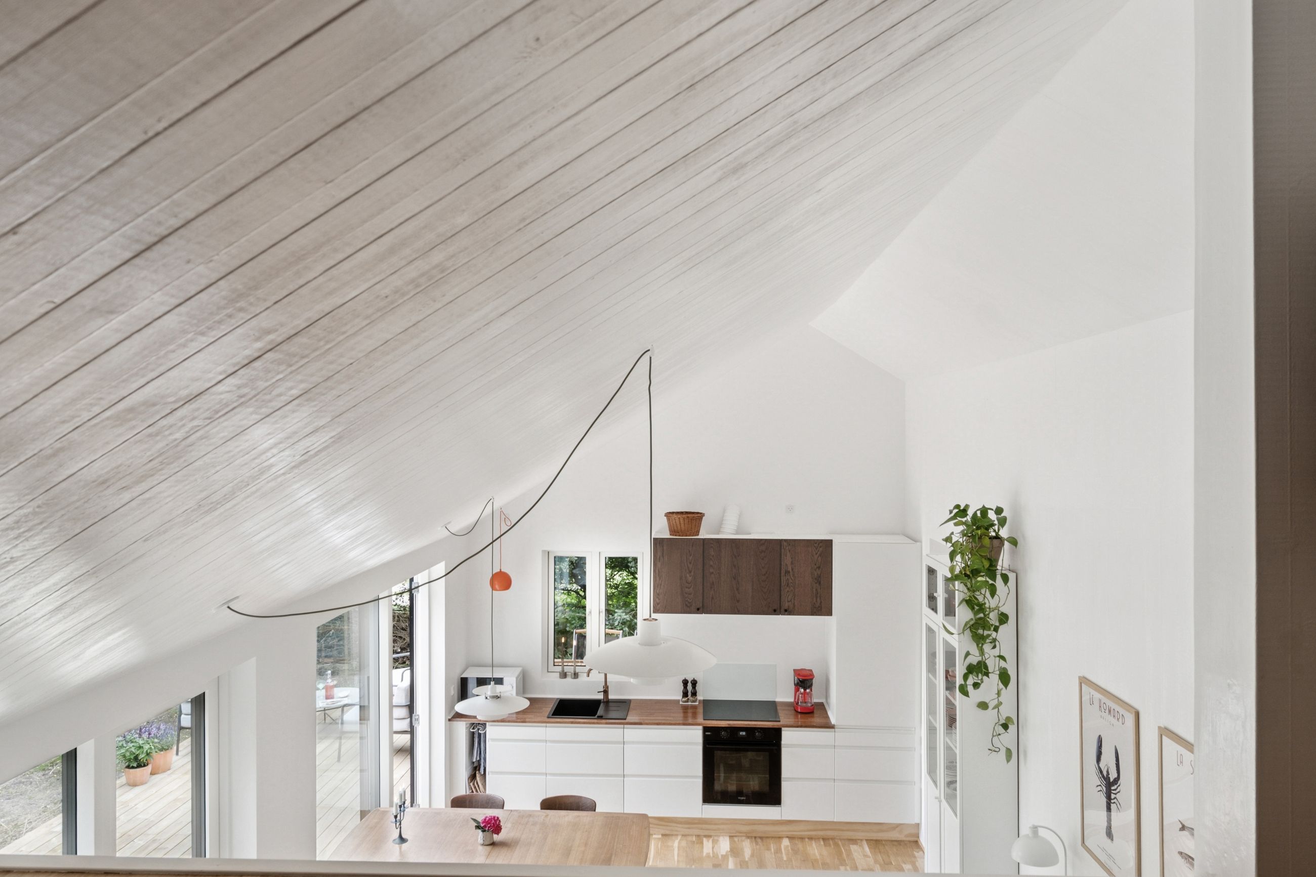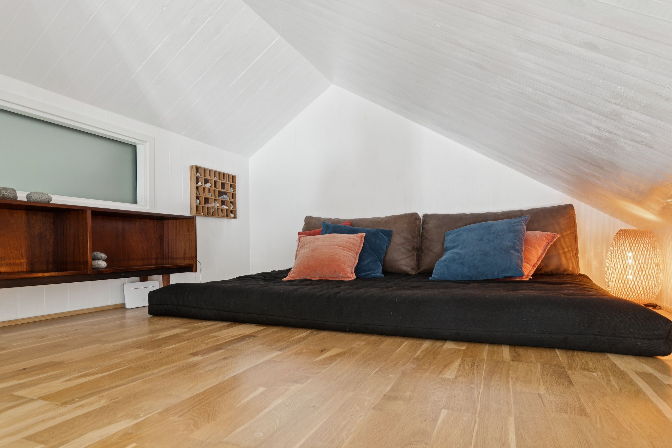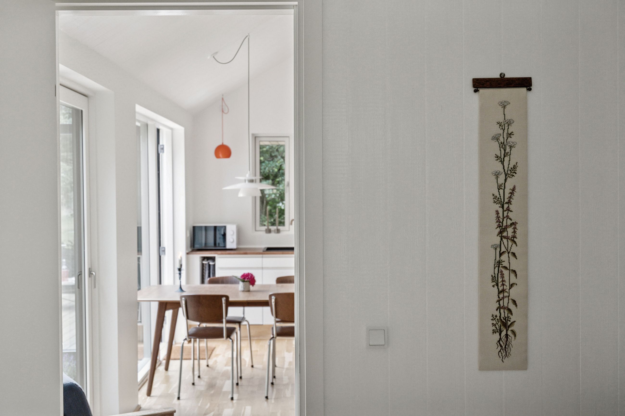 Indenfor mødes du af lyse træbeklædte vægge og et naturligt lysindfald, der giver huset en varm og afslappet atmosfære. Indretningen er åben og gennemtænkt, og sælger har indrettet med 70’er-inspirerede møbler som passer perfekt til husets enkle, nordiske udtryk.