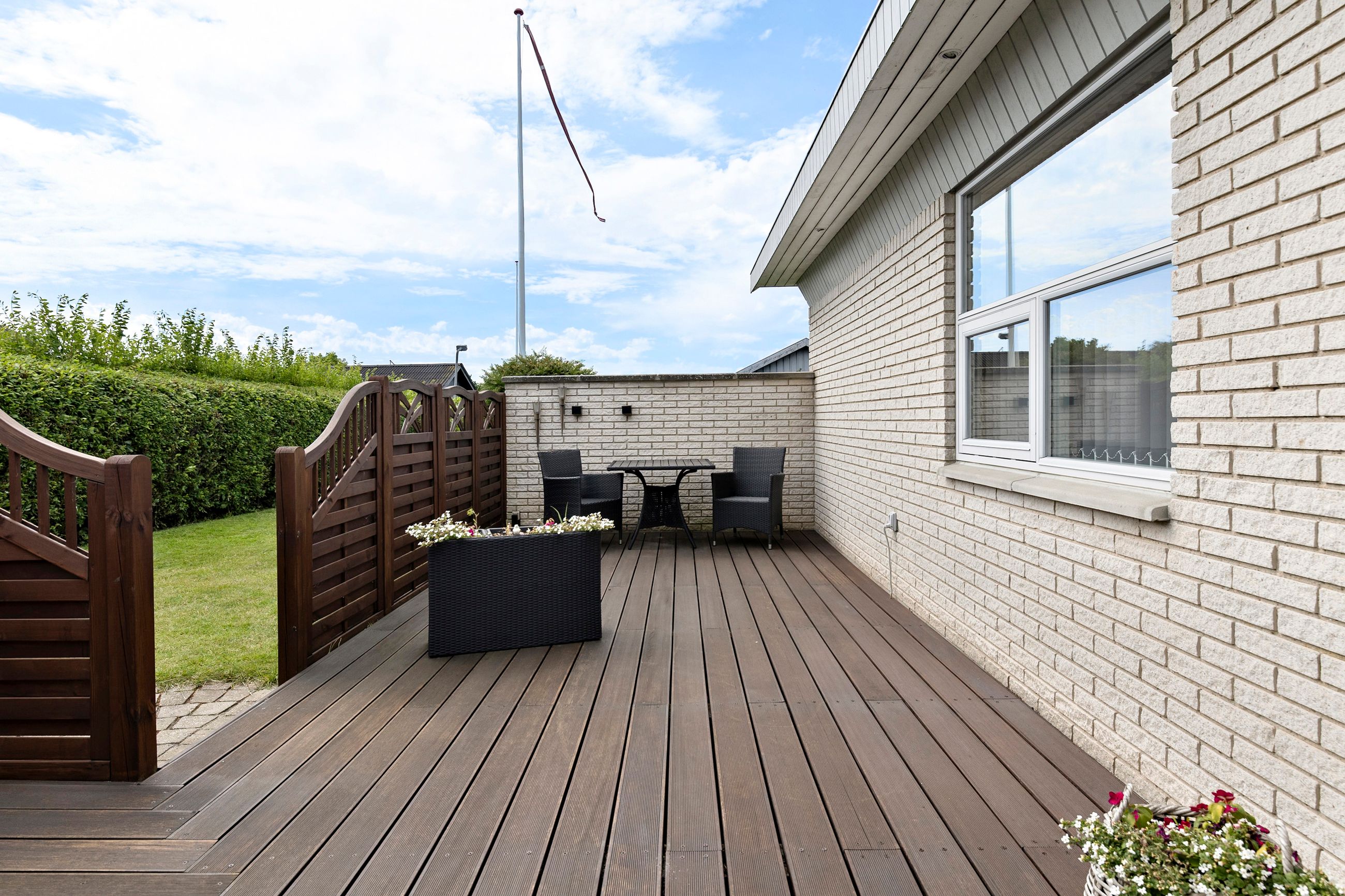 Haven er overskuelig og velanlagt med græsplæne, terrasse og hyggelige kroge, hvor du kan slappe af, grille eller lade børnene lege frit.