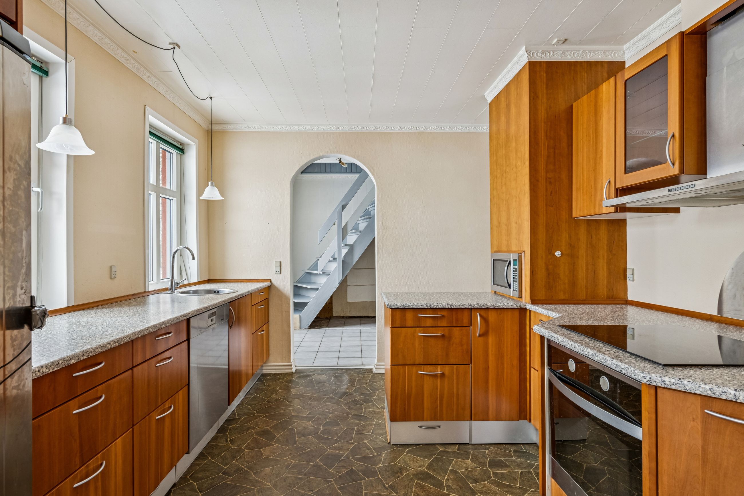 Køkkenet fremstår funktionelt med god bord- og skabsplads samt direkte forbindelse til stueområderne.