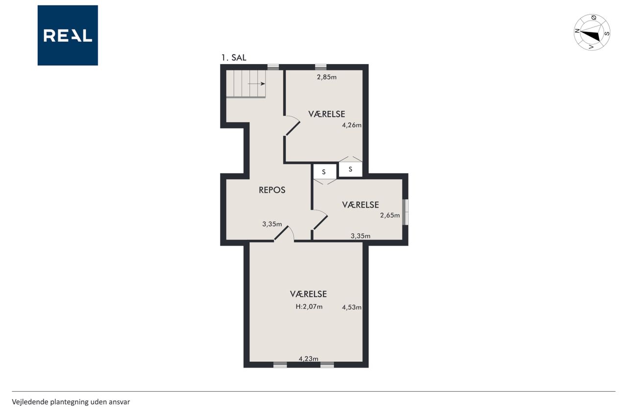 På 1. sal finder du repos samt tre værelser. Her er god plads til børneværelser, kontor eller hobbyrum. Fra værelserne er der en flot udsigt over det omkringliggende landskab.