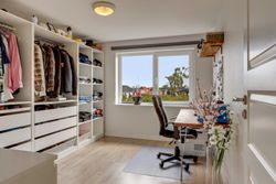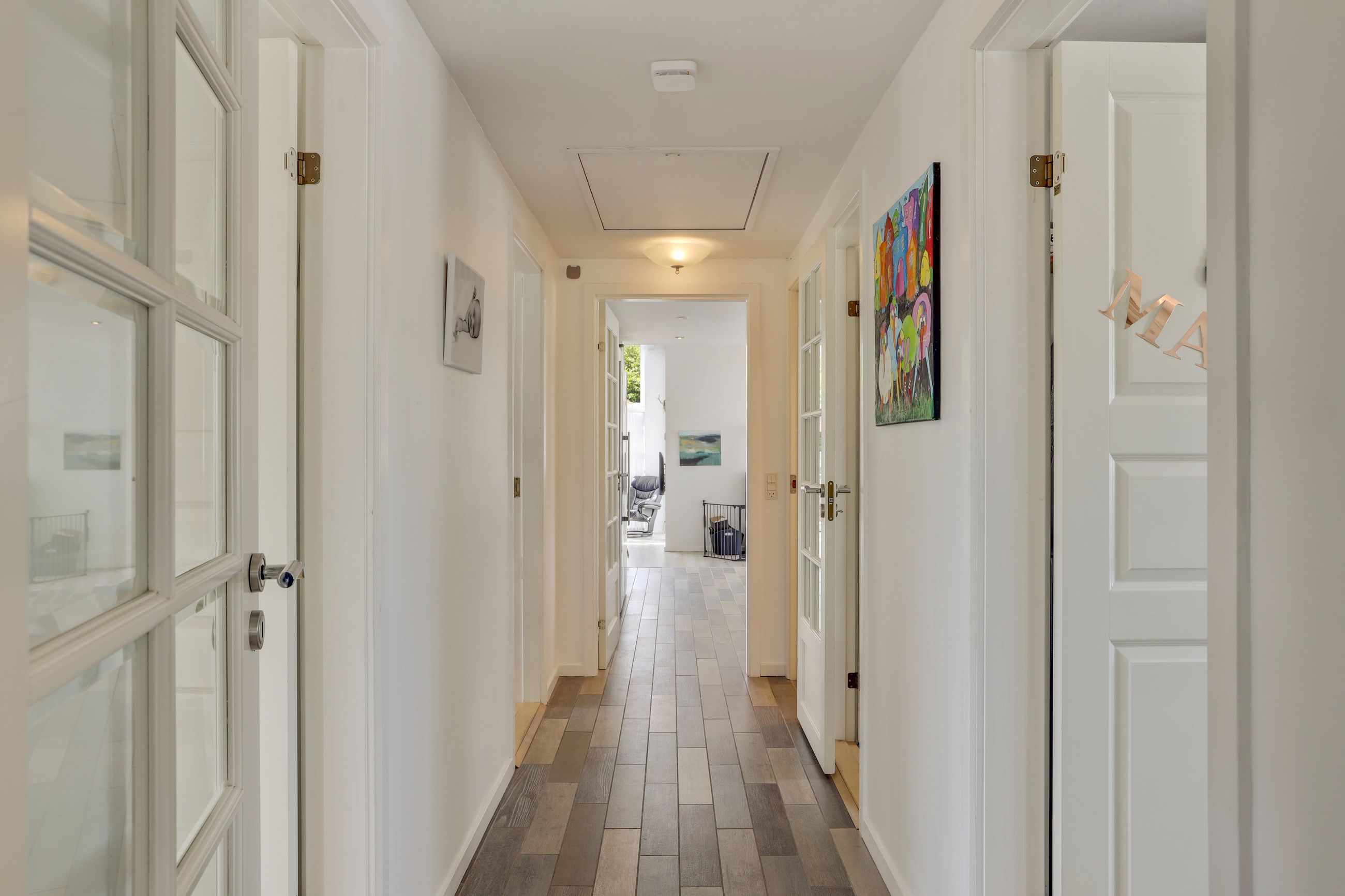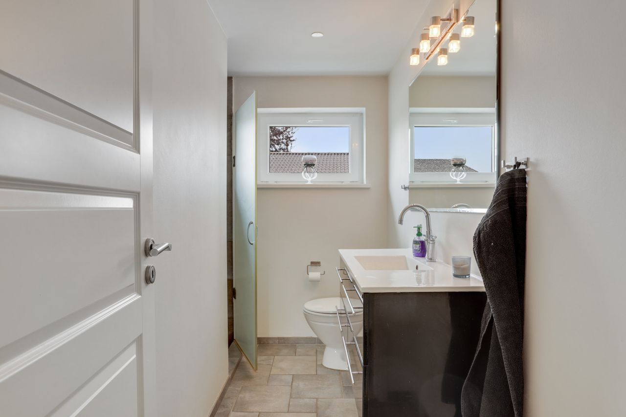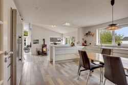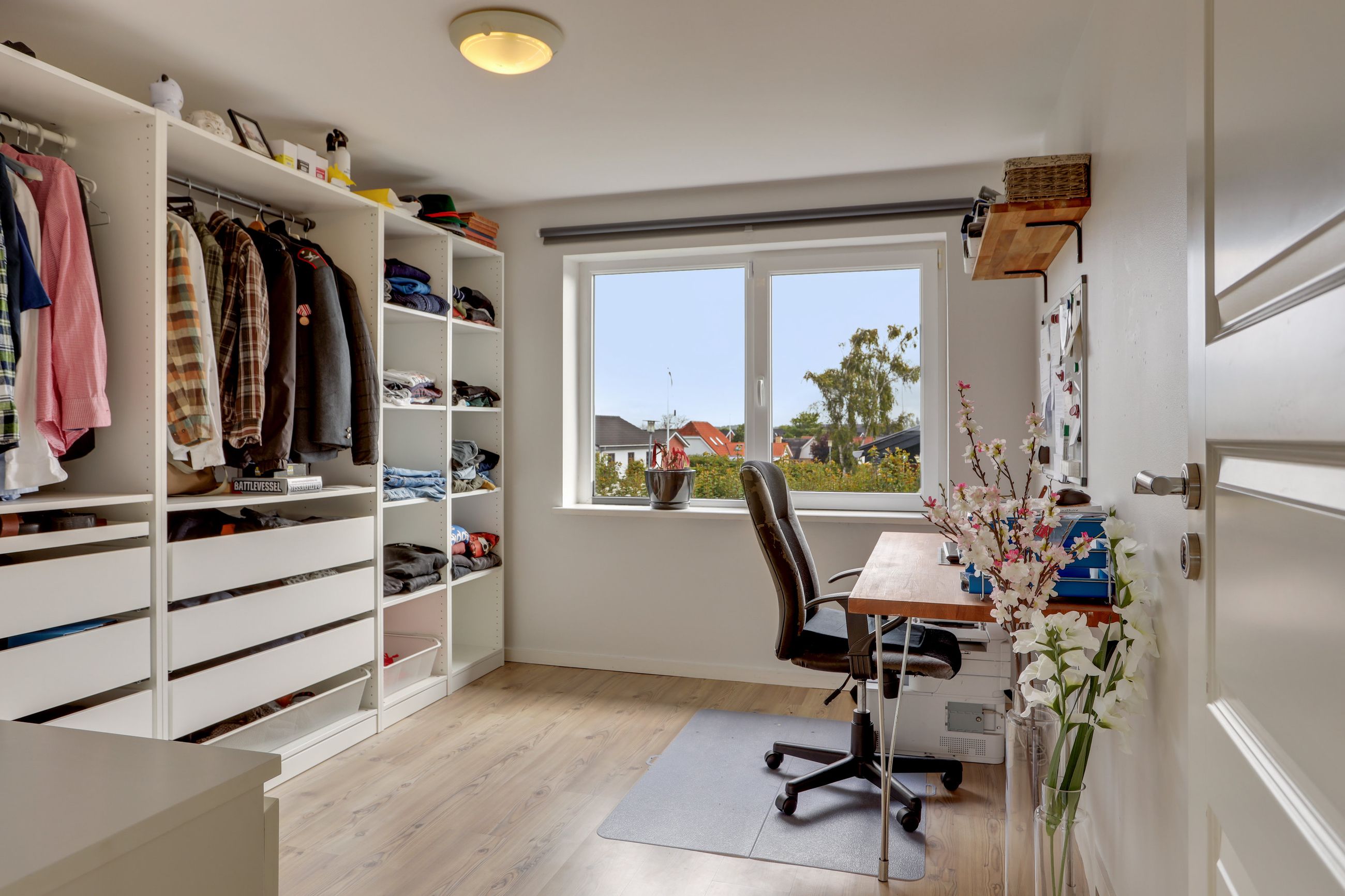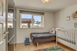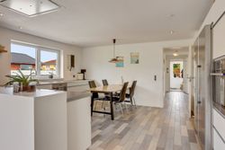 Køkkenet fremstår moderne og funktionelt med god skabsplads og en naturlig forbindelse til både spiseplads og stue. Herudover rummer boligen tre gode værelser, herunder et lyst forældresoveværelse, to rummelige børneværelser samt yderligere et værelse/kontor. Badeværelset er pænt og tidløst med lyse materialer.