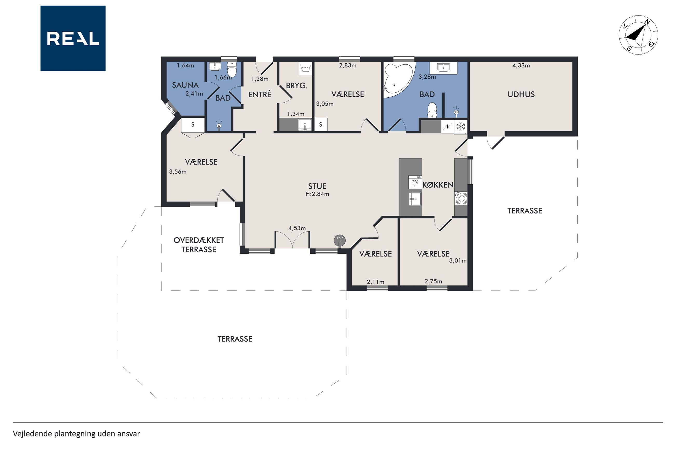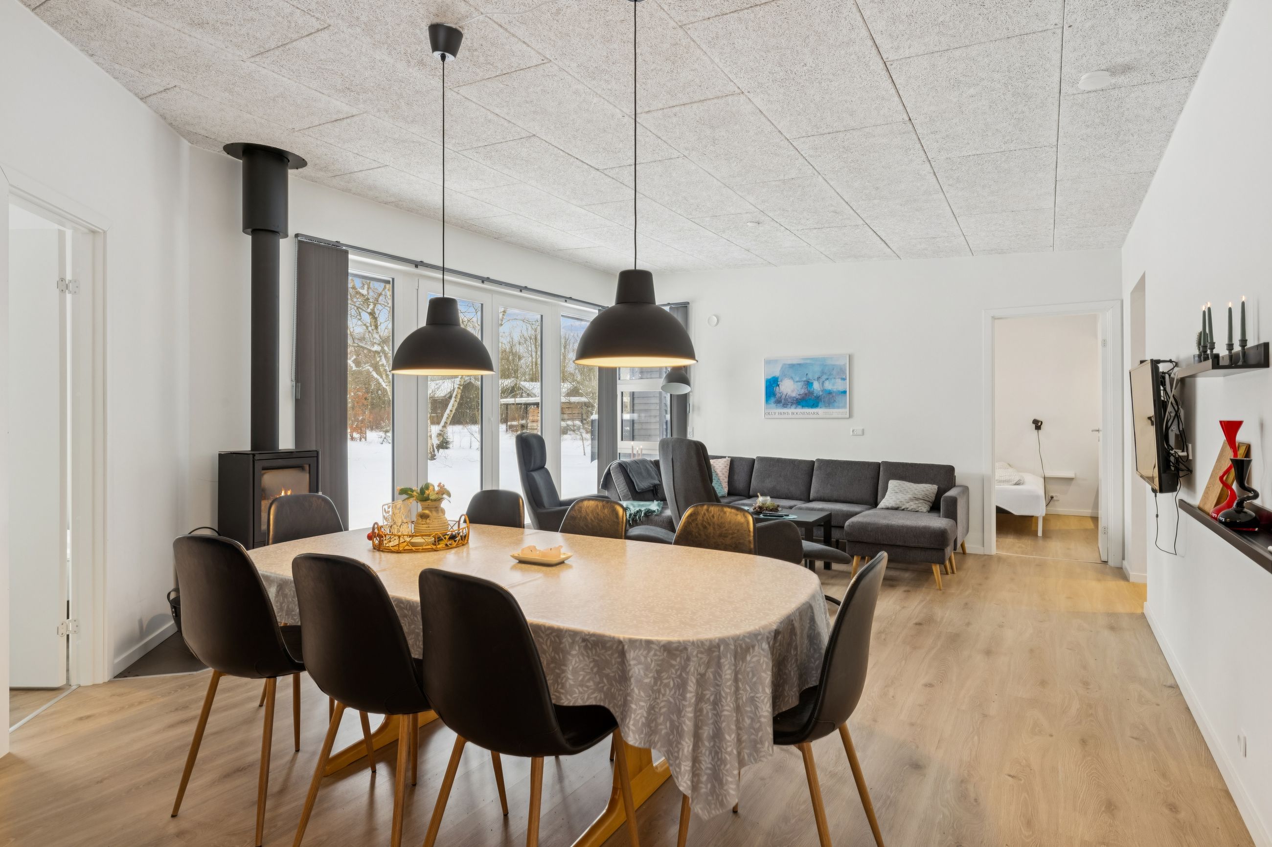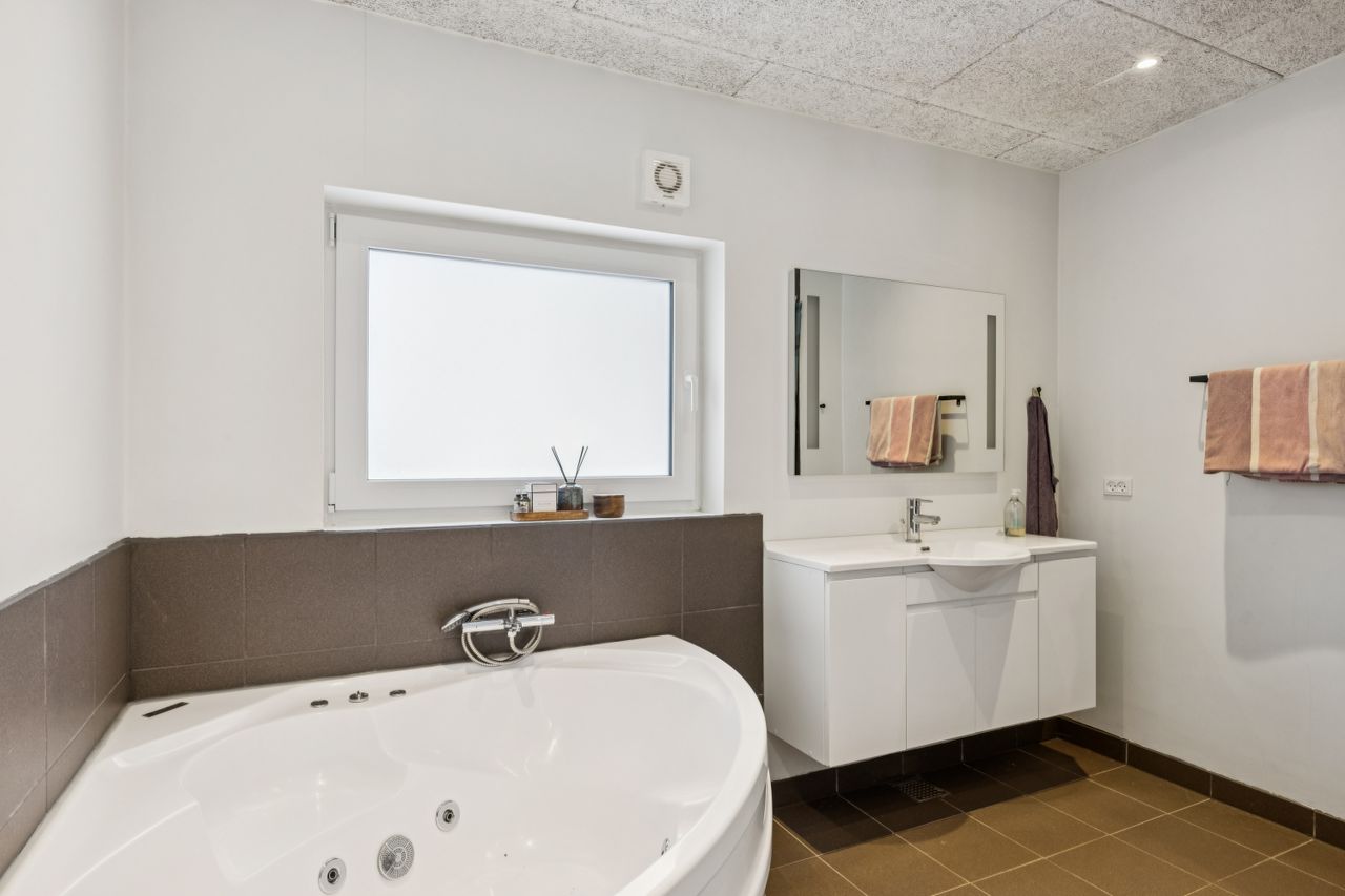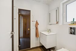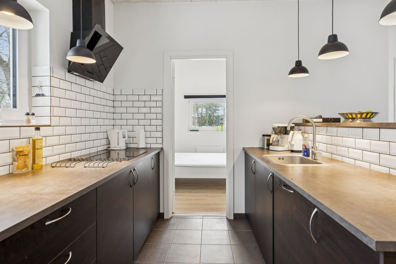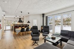 Husets naturlige samlingspunkt er den lyse opholdsstue i åben forbindelse med køkkenet. Her er der et behageligt lysindfald fra de store vinduespartier samt god plads til både ophold og spisearrangement. Køkkenet er moderne indrettet med god skabs- og bordplads samt integrerede hårde hvidevarer. Boligen indeholder i alt 4 værelser, hvilket giver fleksible indretningsmuligheder og god plads til overnattende gæster. Hertil kommer to pæne badeværelser, hvoraf det ene er indrettet med spa og det andet med sauna, som giver mulighed for afslapning året rundt.