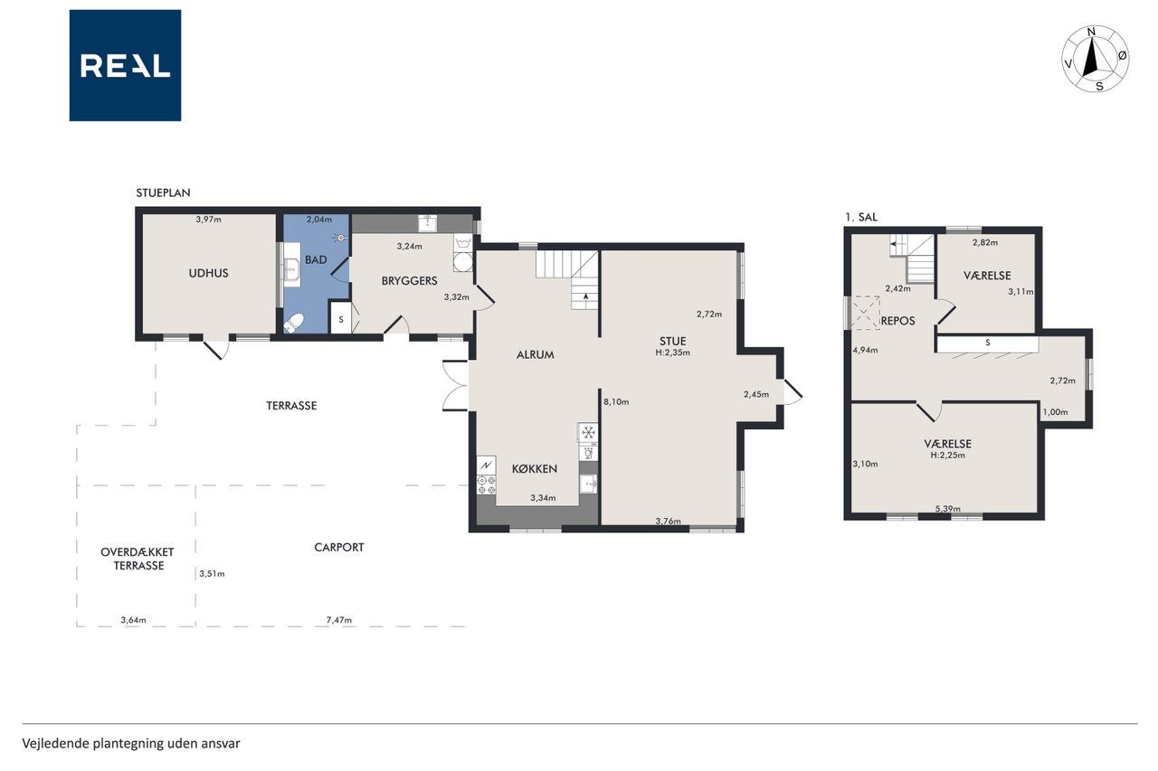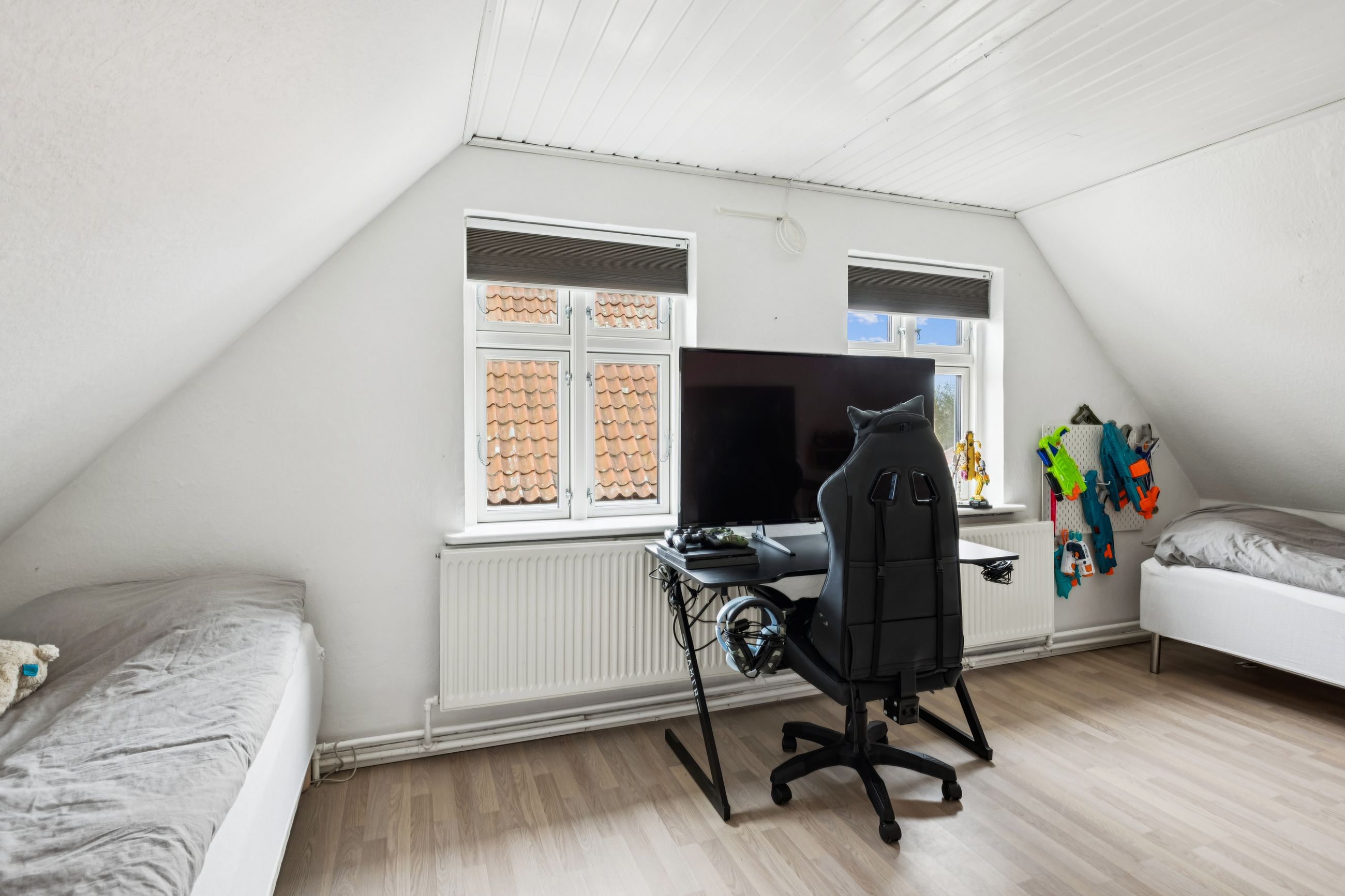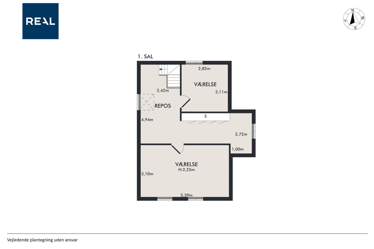 Fra spisekøkkenet fører trappen op til førstesalen, som rummer to store værelser samt et rummeligt repos med plads til opbevaring, kontor område og en lille hems. Det ene værelse kan nemt opdeles i to, som det tidligere har været – perfekt til den voksende familie eller hjemmekontor.