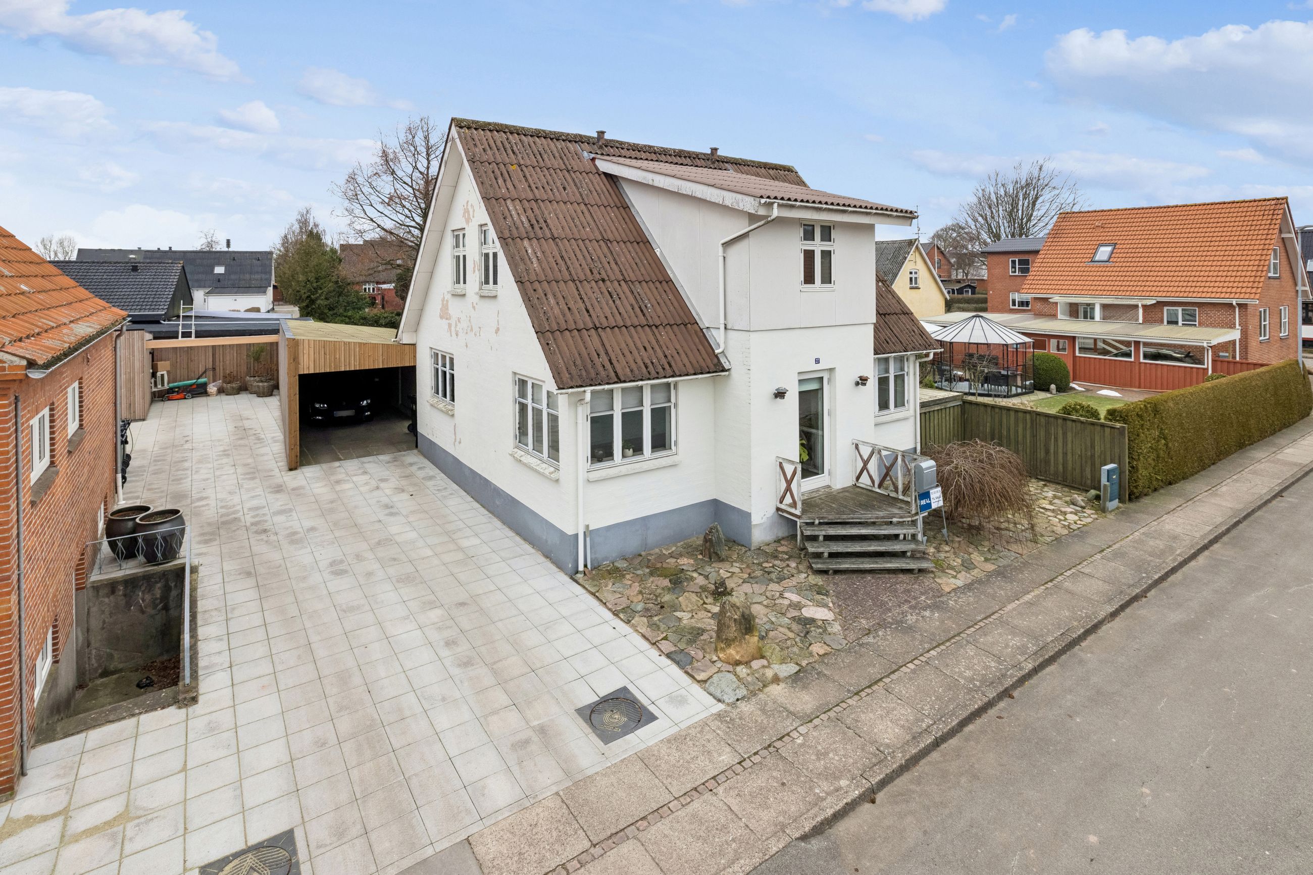 Udenfor venter et dejligt og privat havemiljø med hyggelig gårdhave, solterrasse, overdækket terrasse og grøn græsplæne – ideelt til både afslapning og sommerens hyggelige stunder. Hertil kommer redskabsrum samt flisebelagt indkørsel med carport.