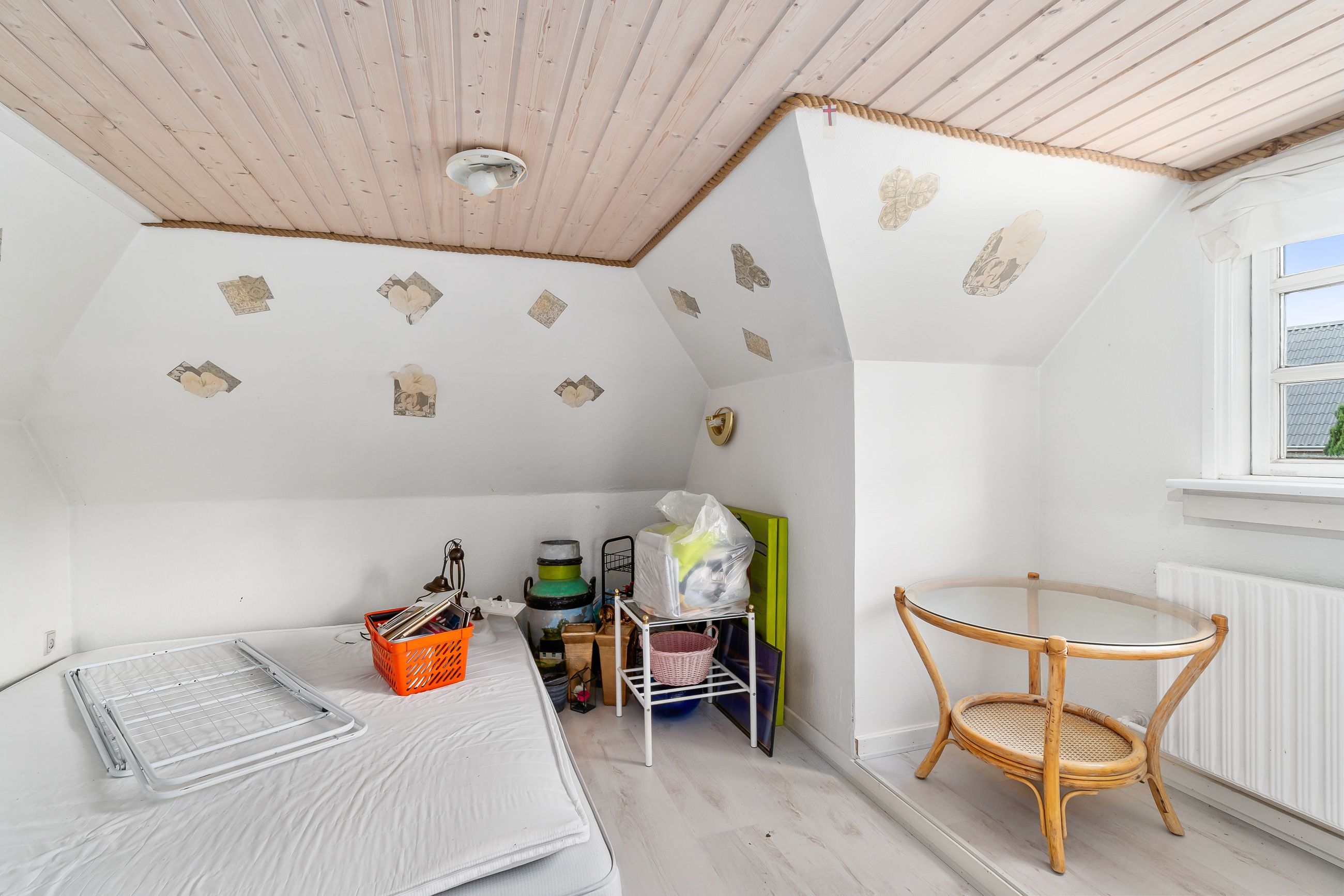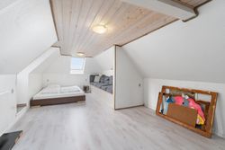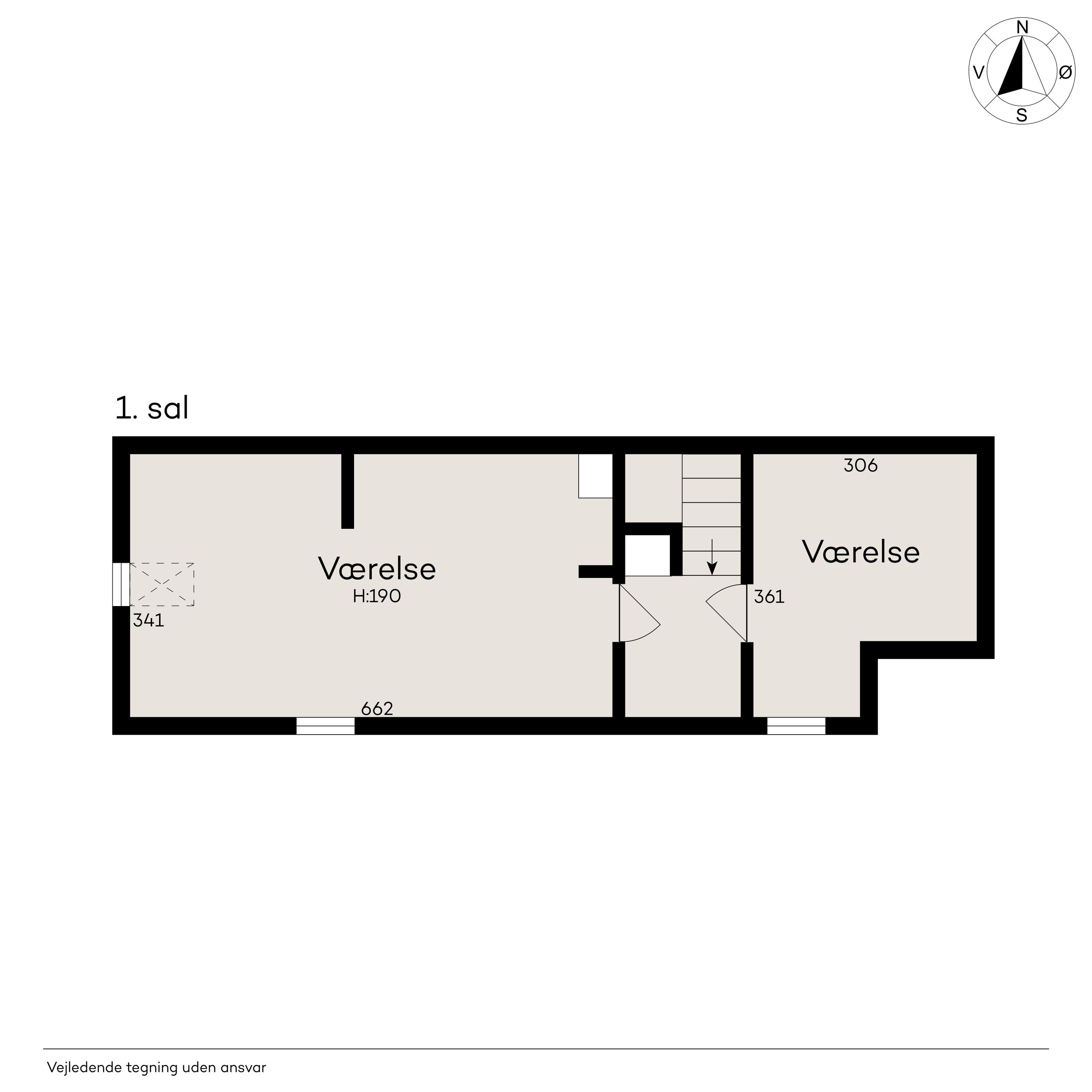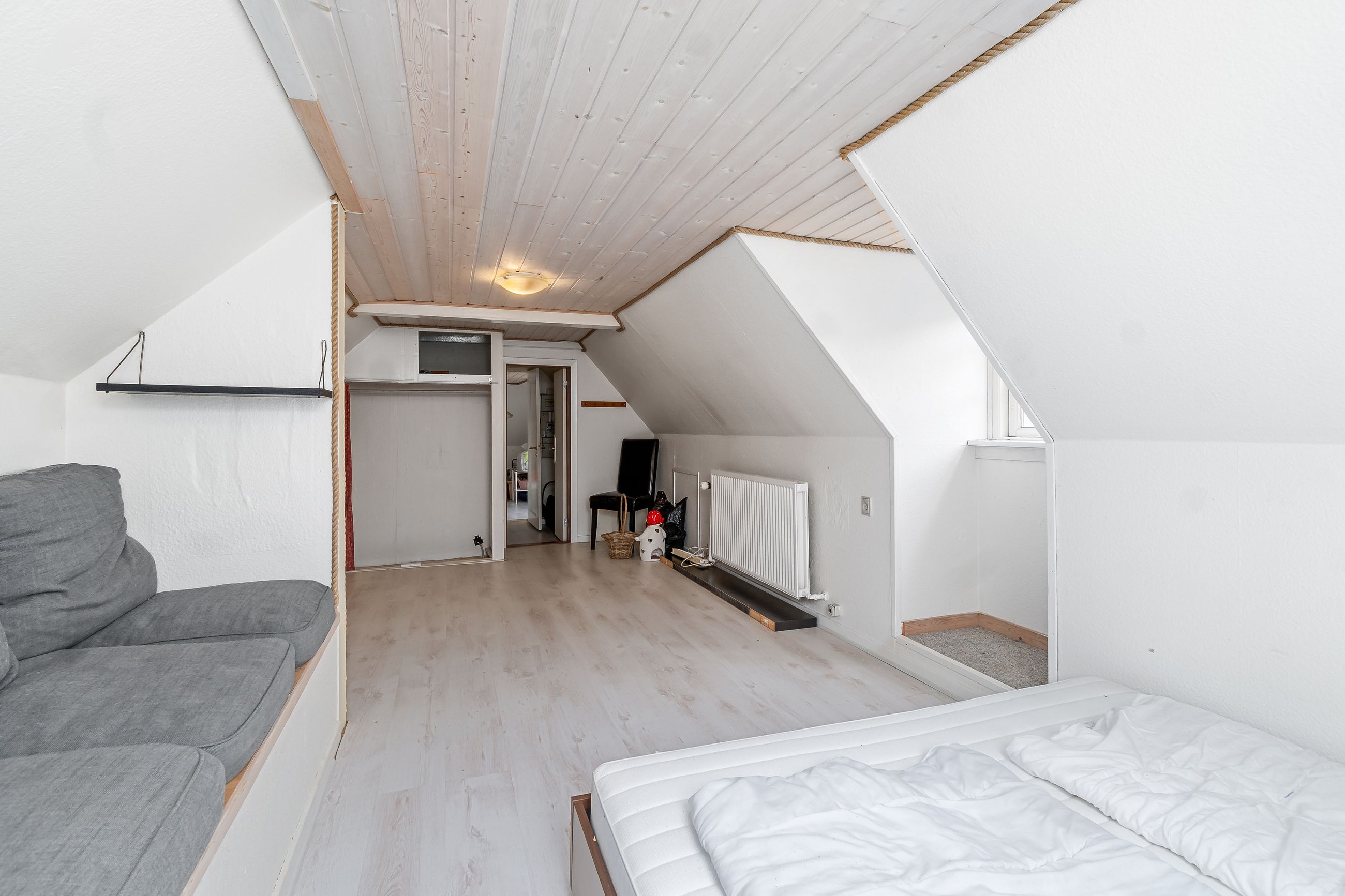 Entreen giver via trappe, adgang til 1. sal med lille repos samt hhv mindre gavlværelse mod øst samt stort