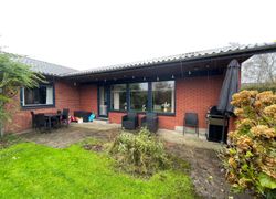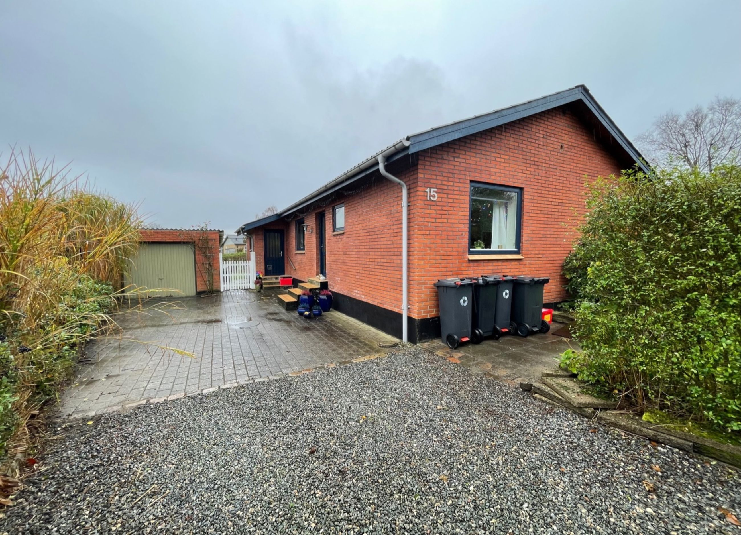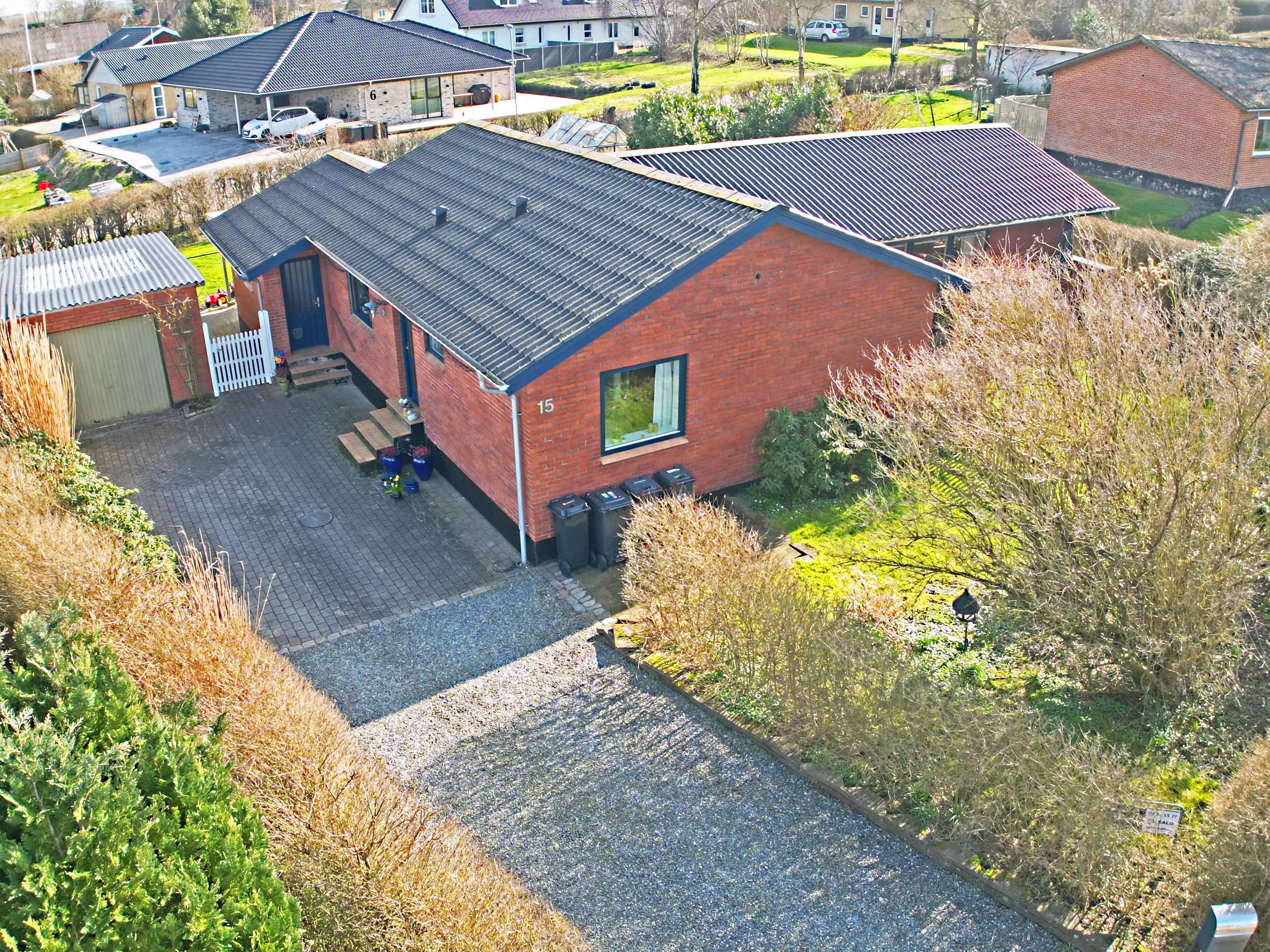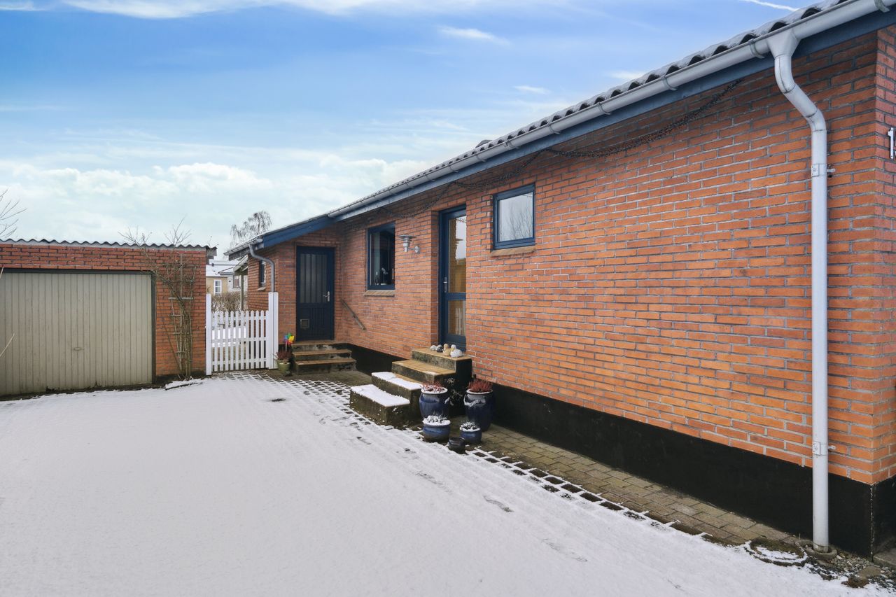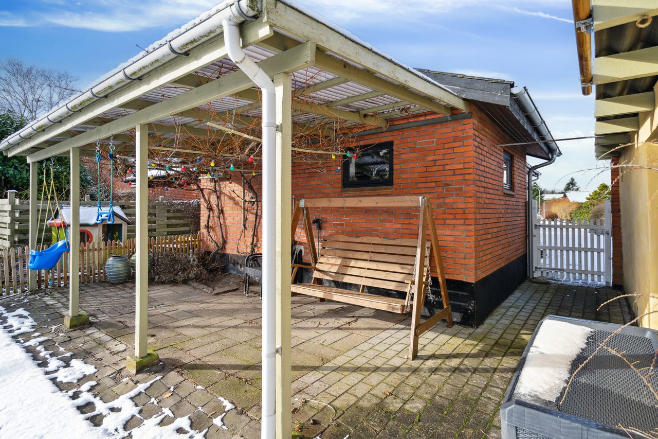 Til ejendommen hører 28 m2 muret garage samt 24 m2 udhus. Gode overdækninger med terrasse mod