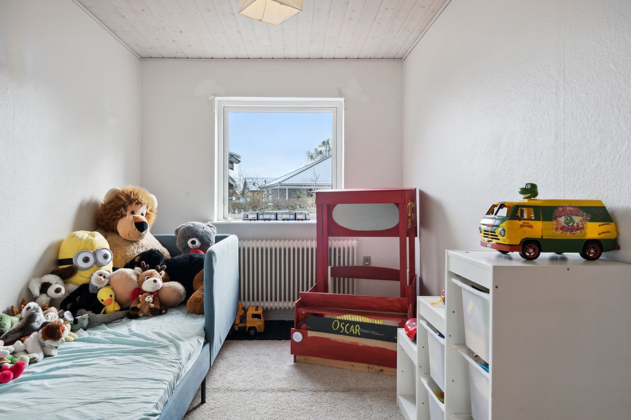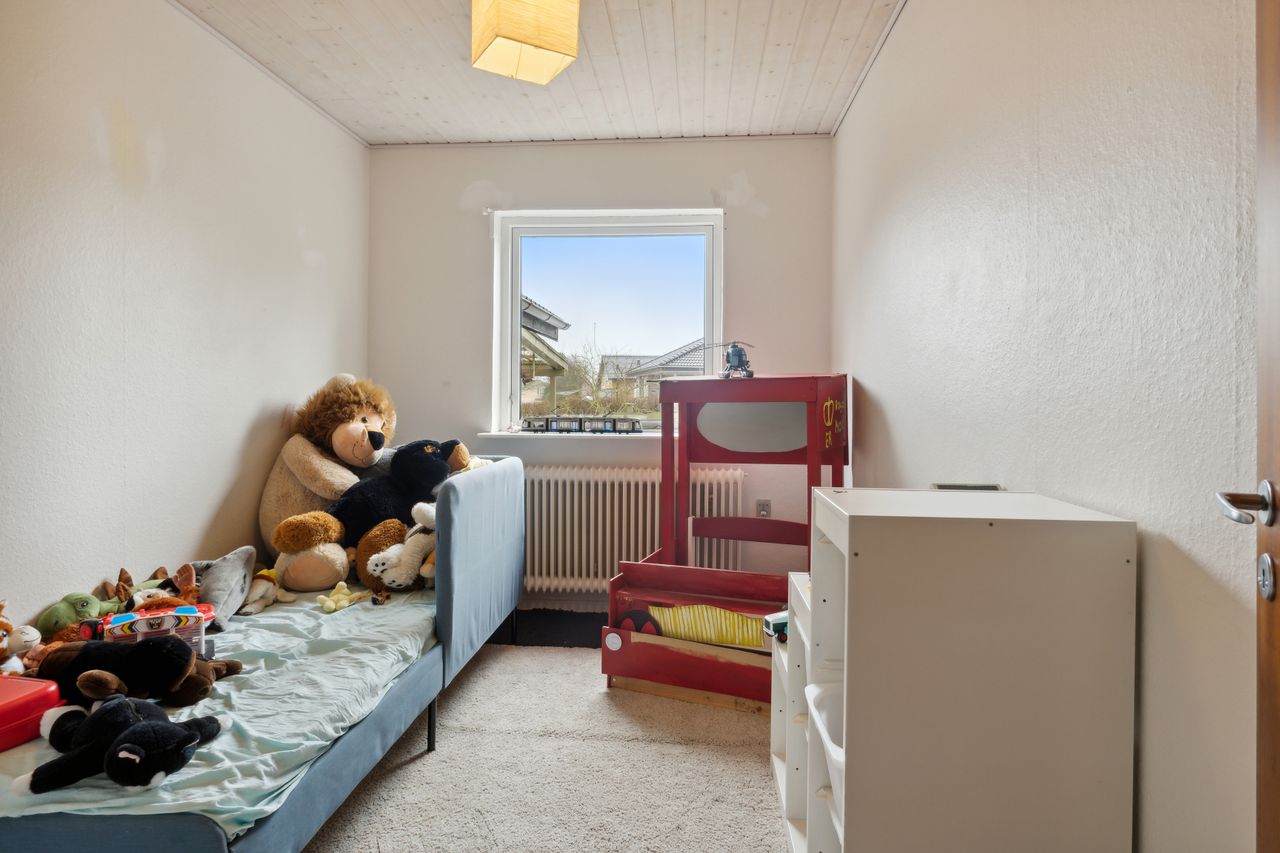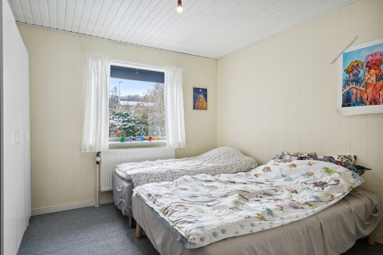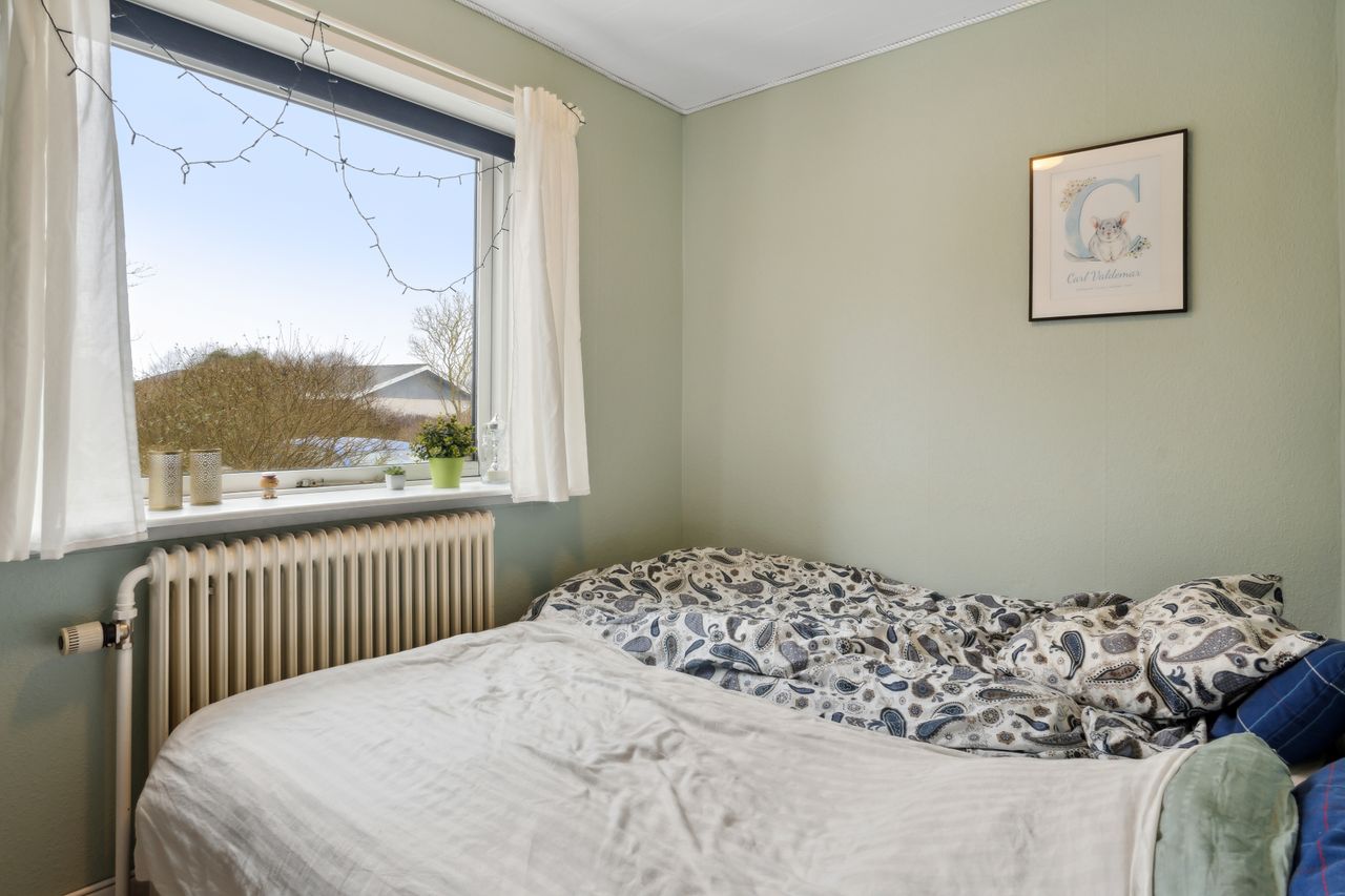 adgang via lille vindfang. Stort lyst soveværelse med skabsvæg.Udover soveværelset er der 2 gode