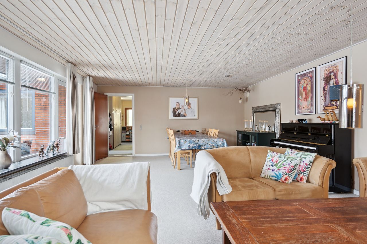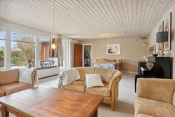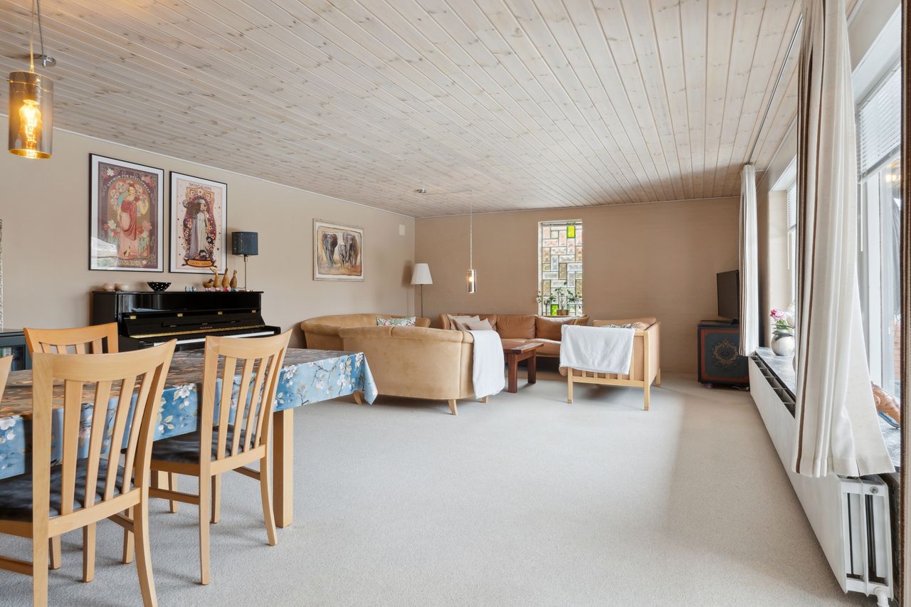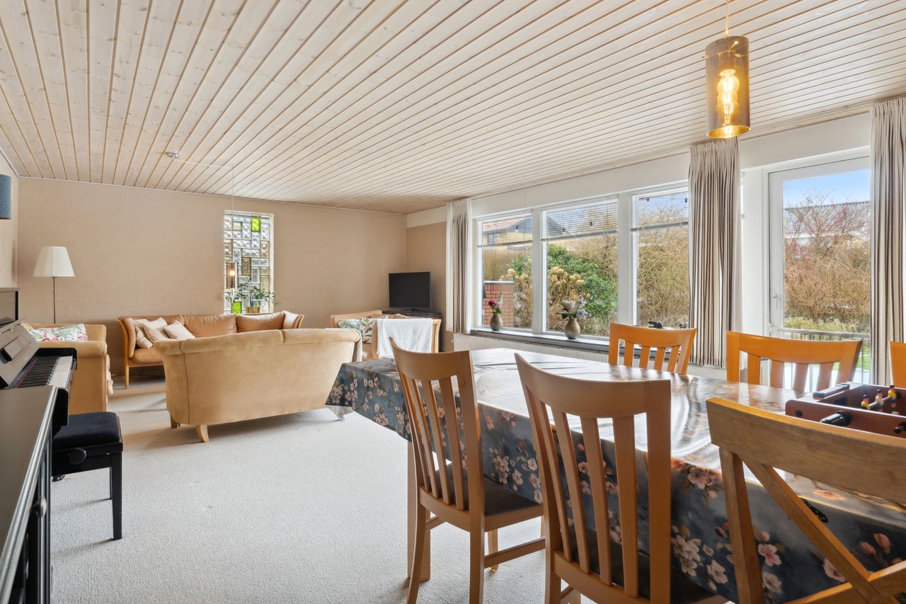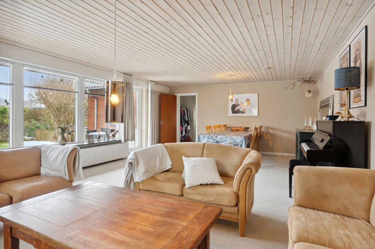 sydvendt stue med vinduesparti samt adgang til sydvendt delvis overdækket terrasse. Huset opvarmes