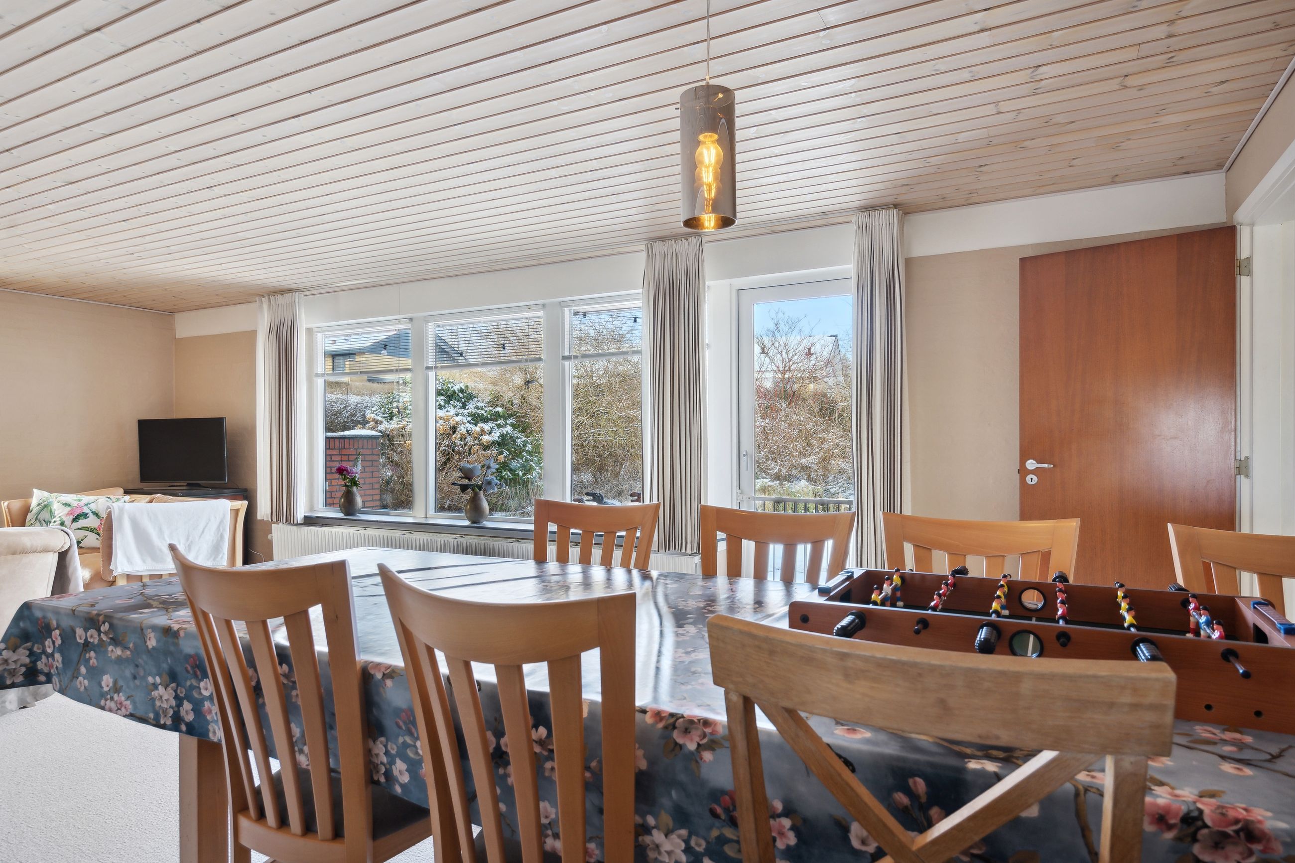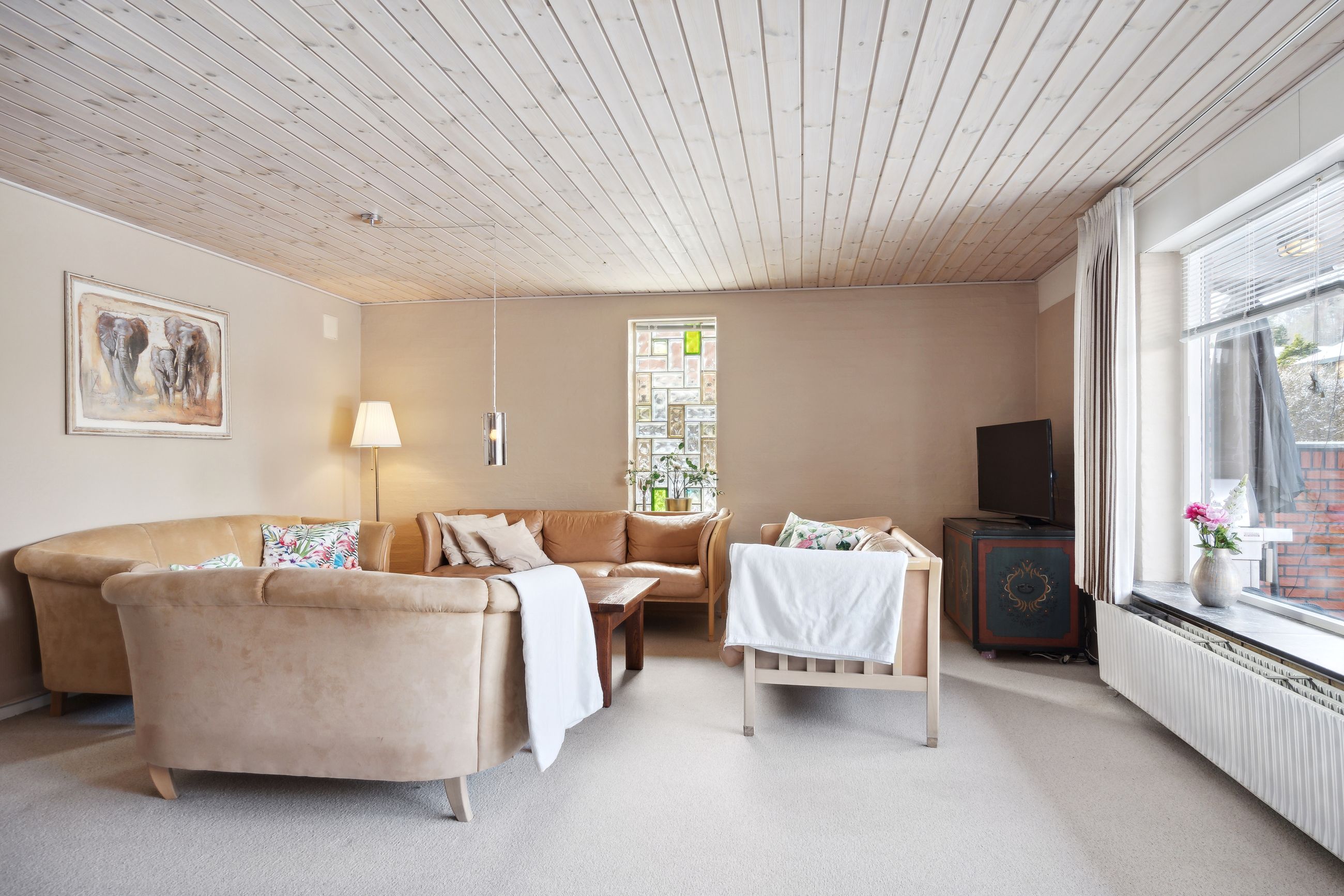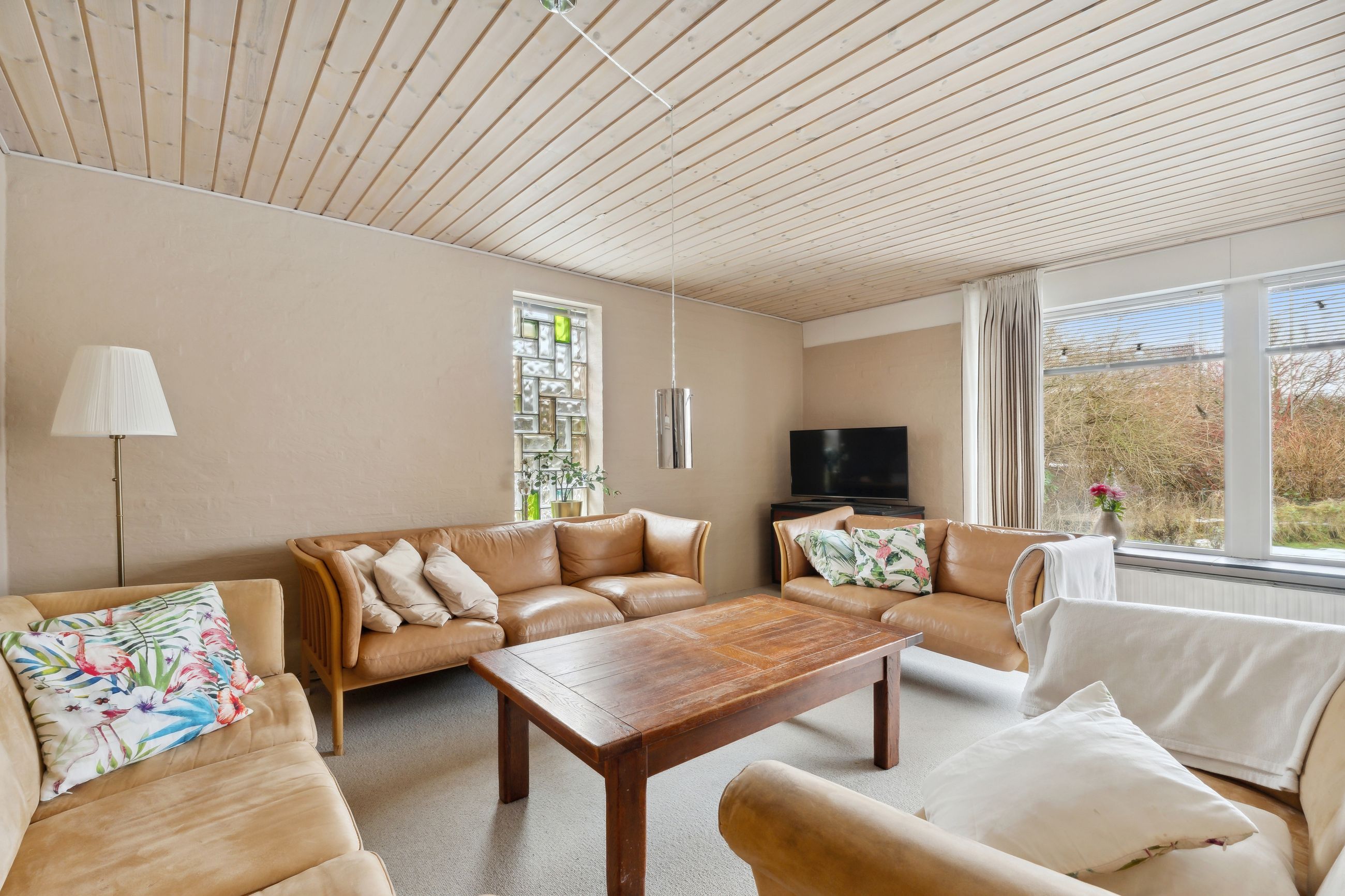 sydvendt stue med vinduesparti samt adgang til sydvendt delvis overdækket terrasse. Huset opvarmes