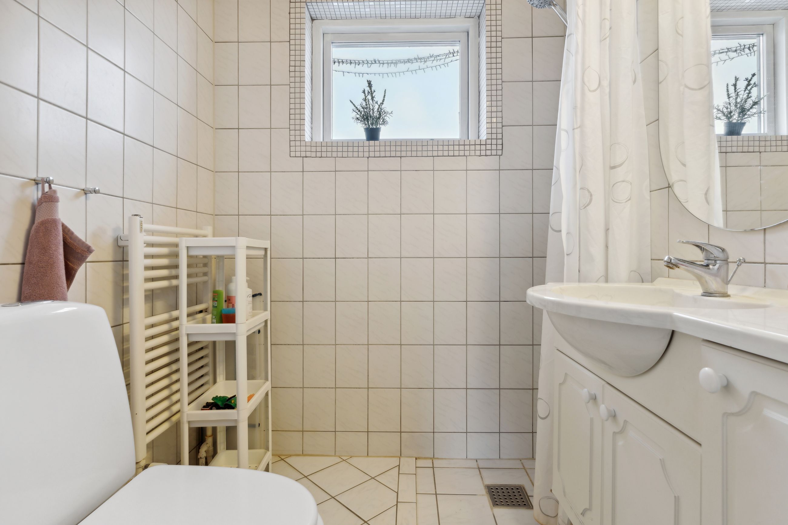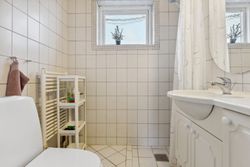 værelser. Badeværelse med lyse fliser , brusehjørne samt miljø. Fra fordelingsgang er adgang til stor
