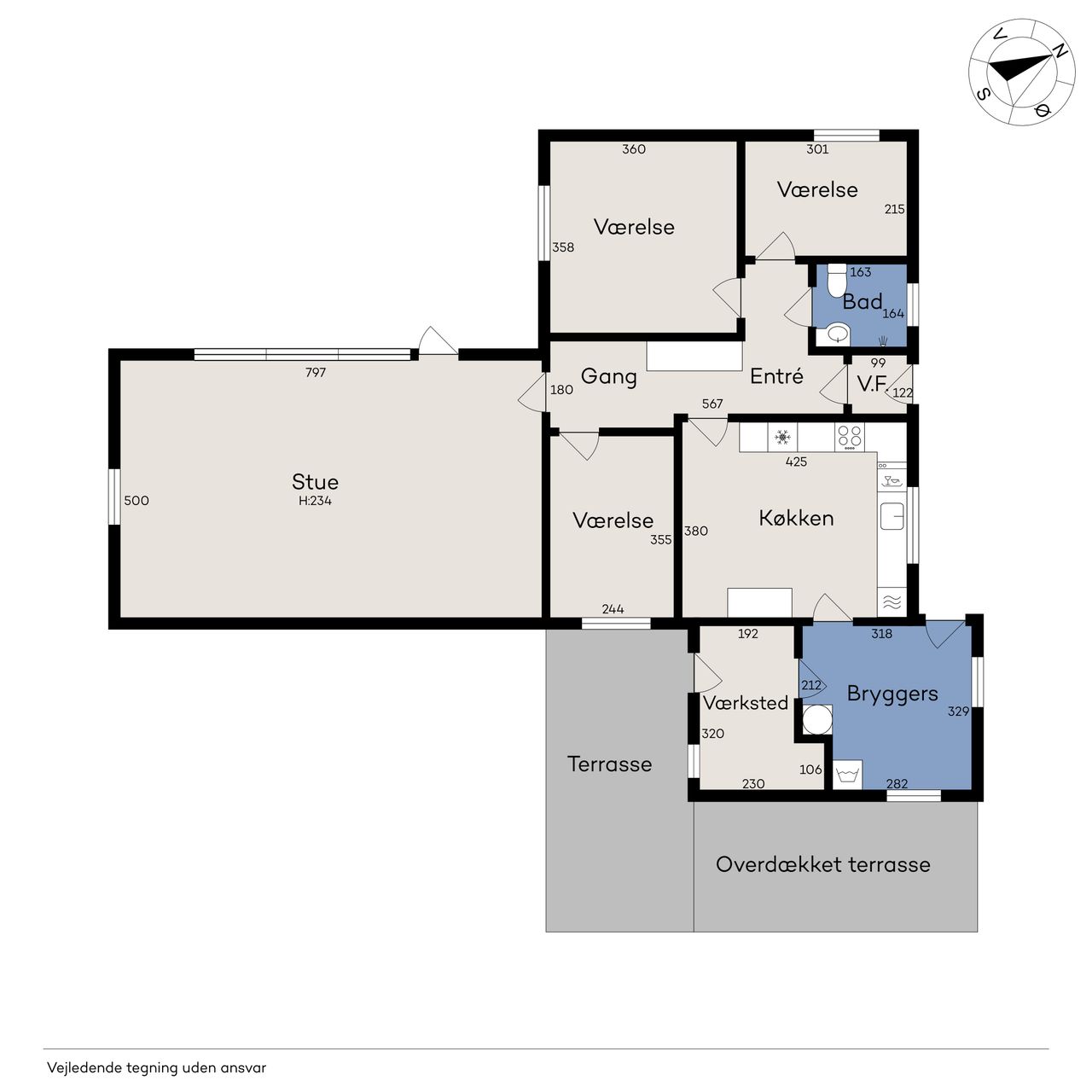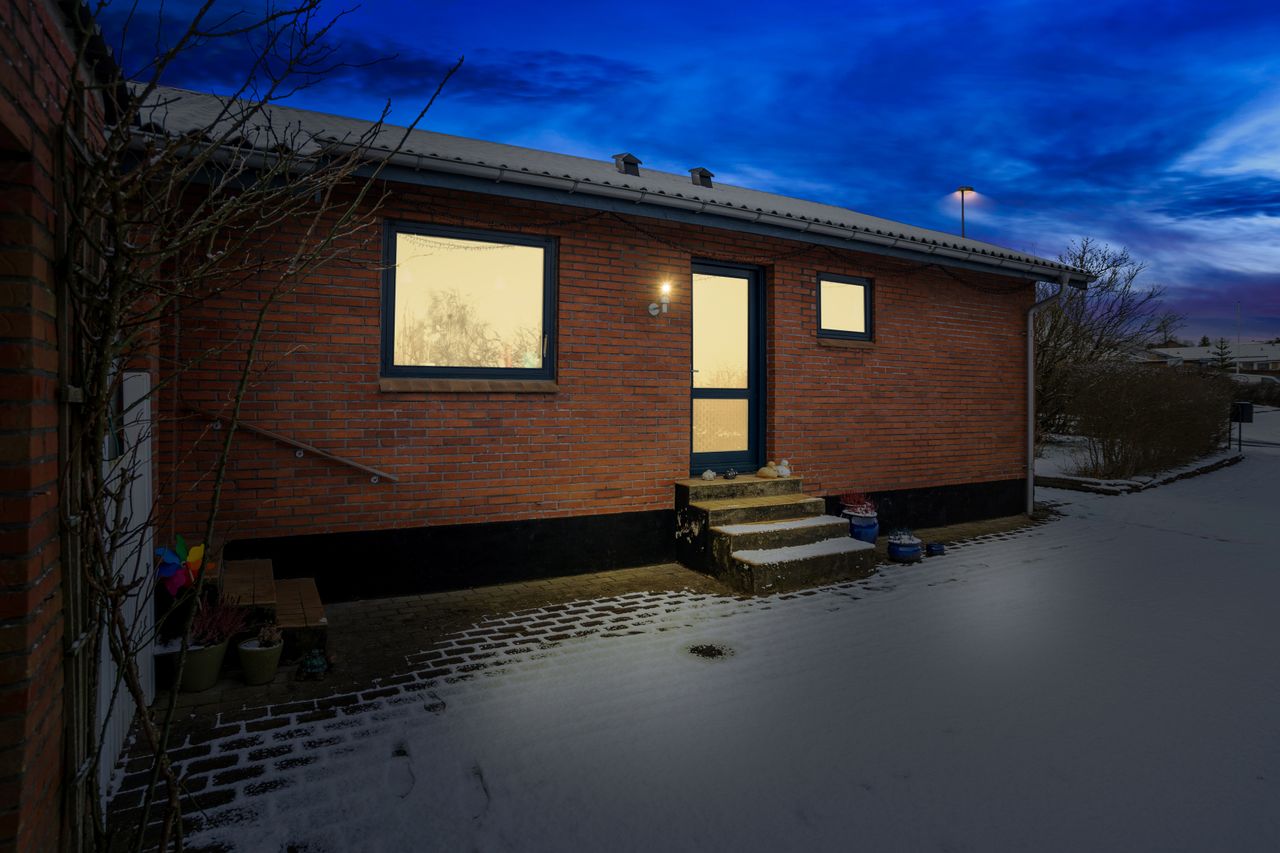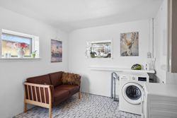 Beboelsen er indrettet med : Indgang til stort bryggers med vaskemaskine og teknikafdeling. Fra