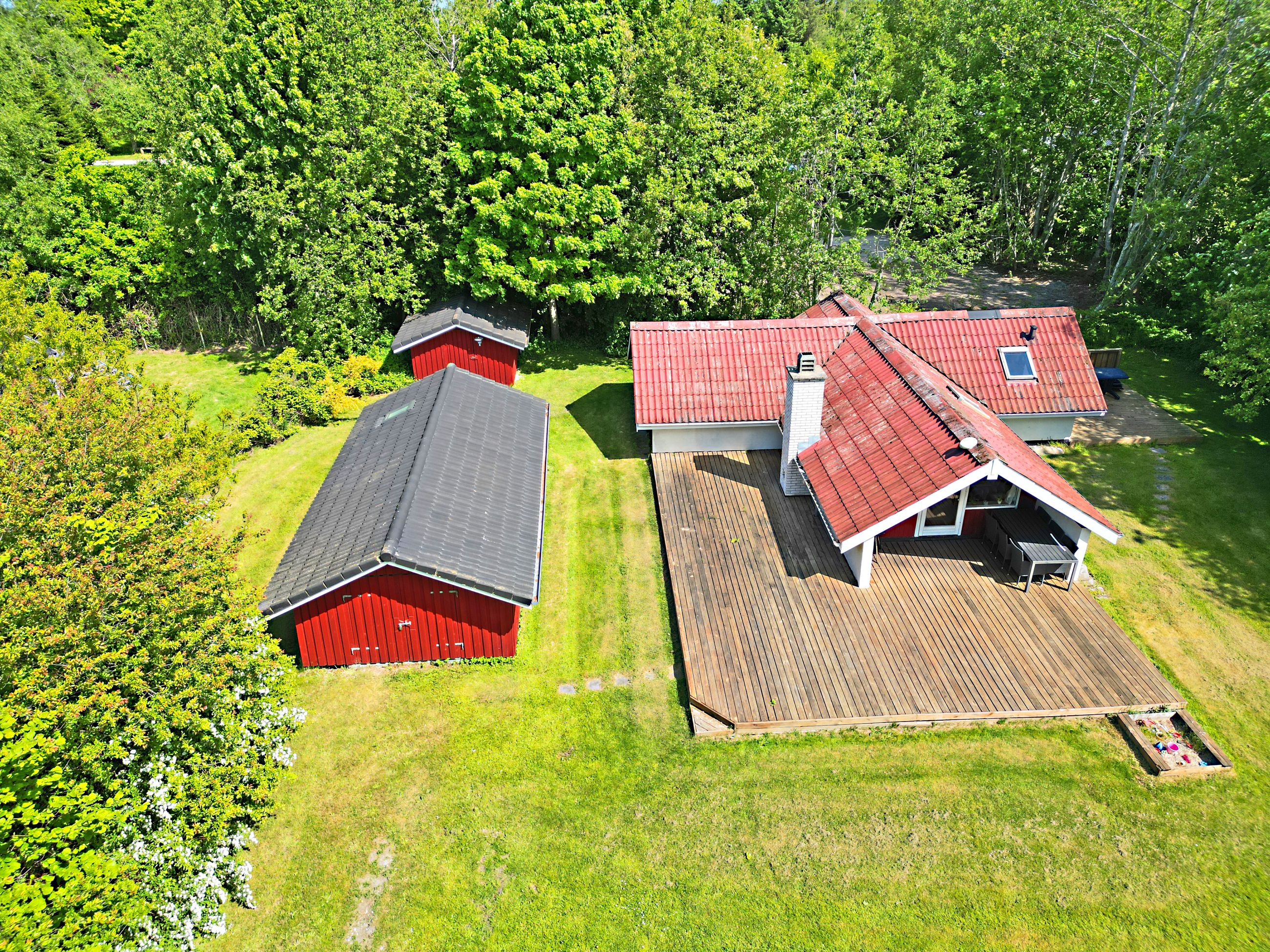 Til huset hører gode træterrasser etablerede ca 2019. Overdækning ca 12 m2 i forbindelse med indgang