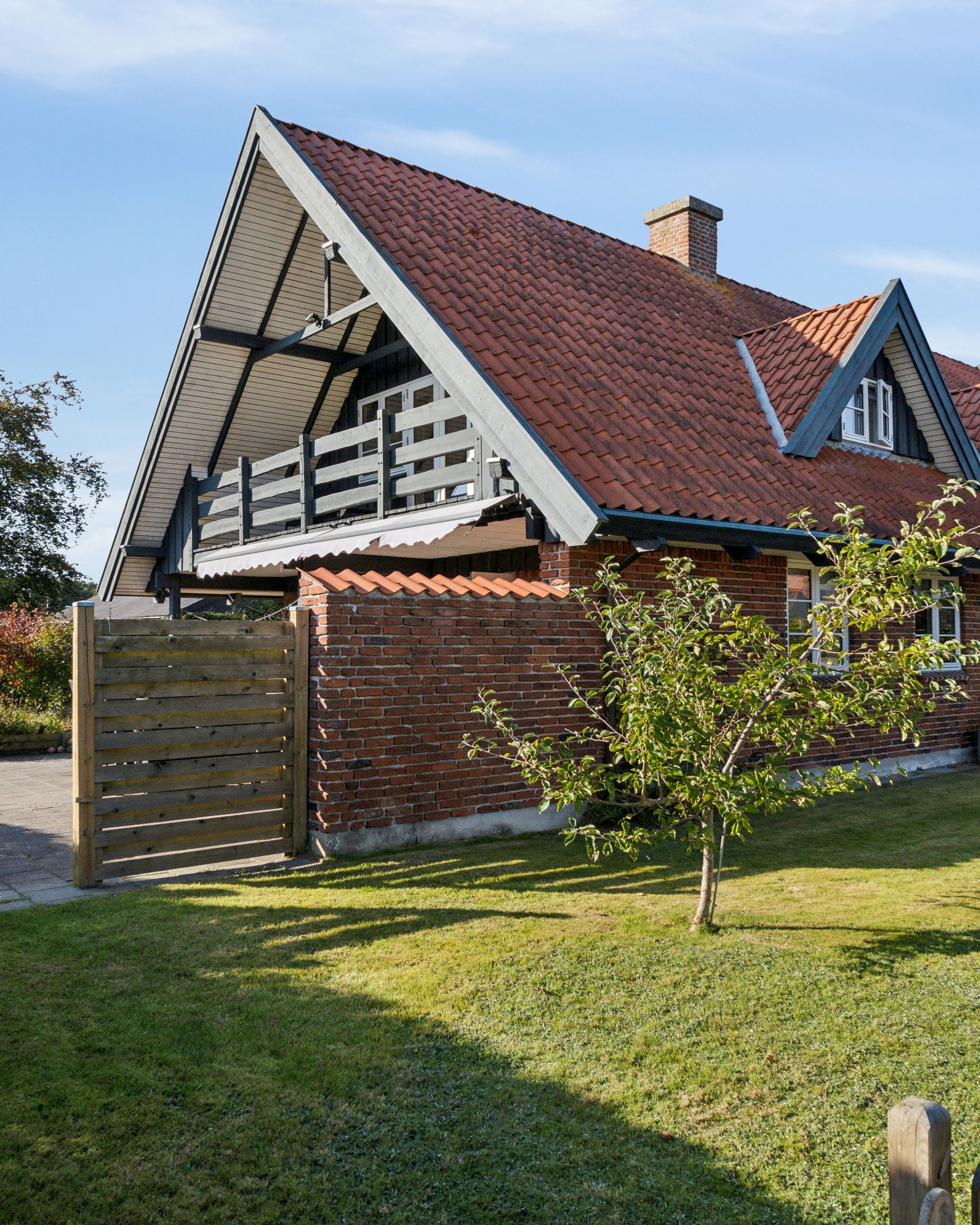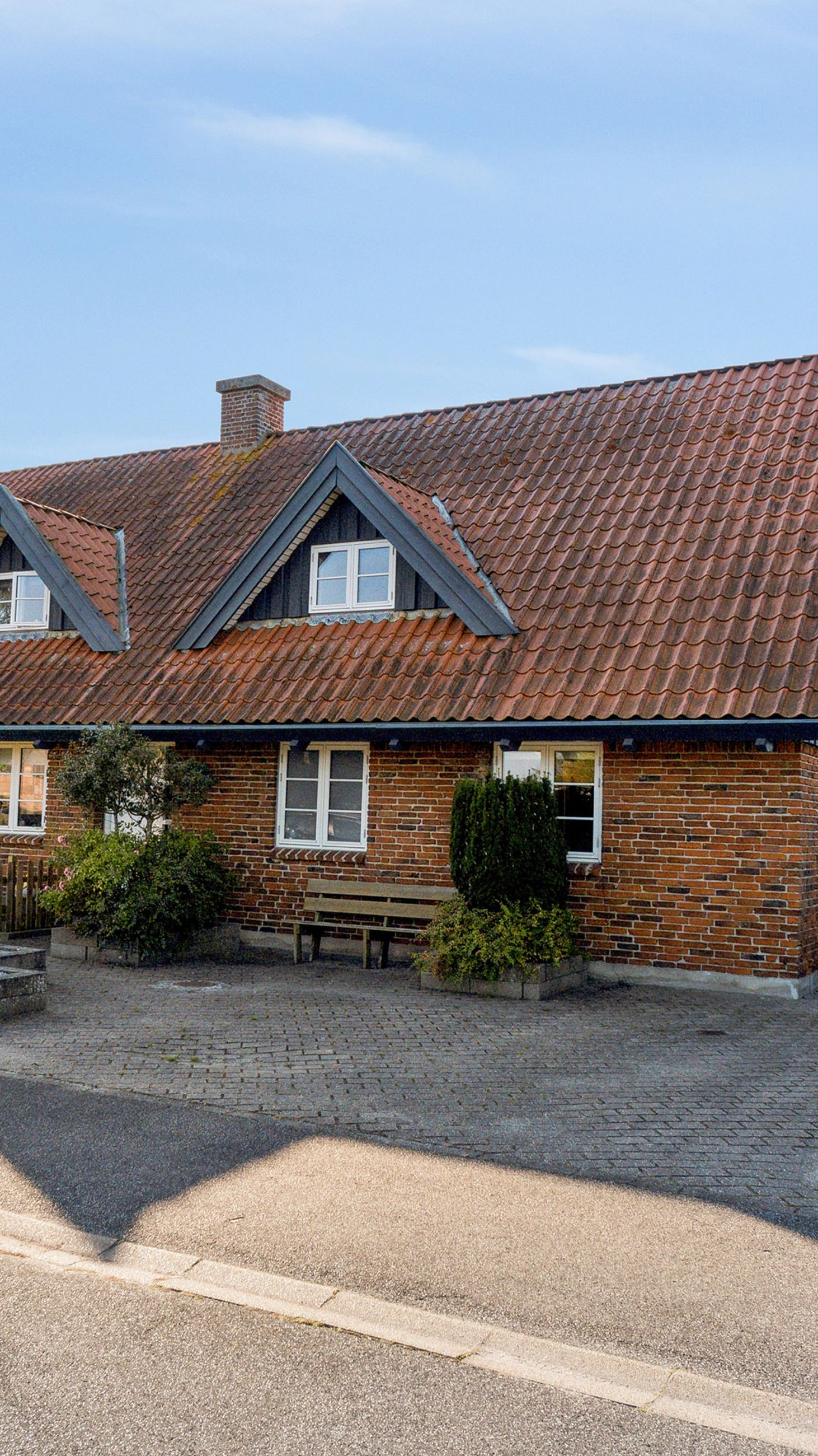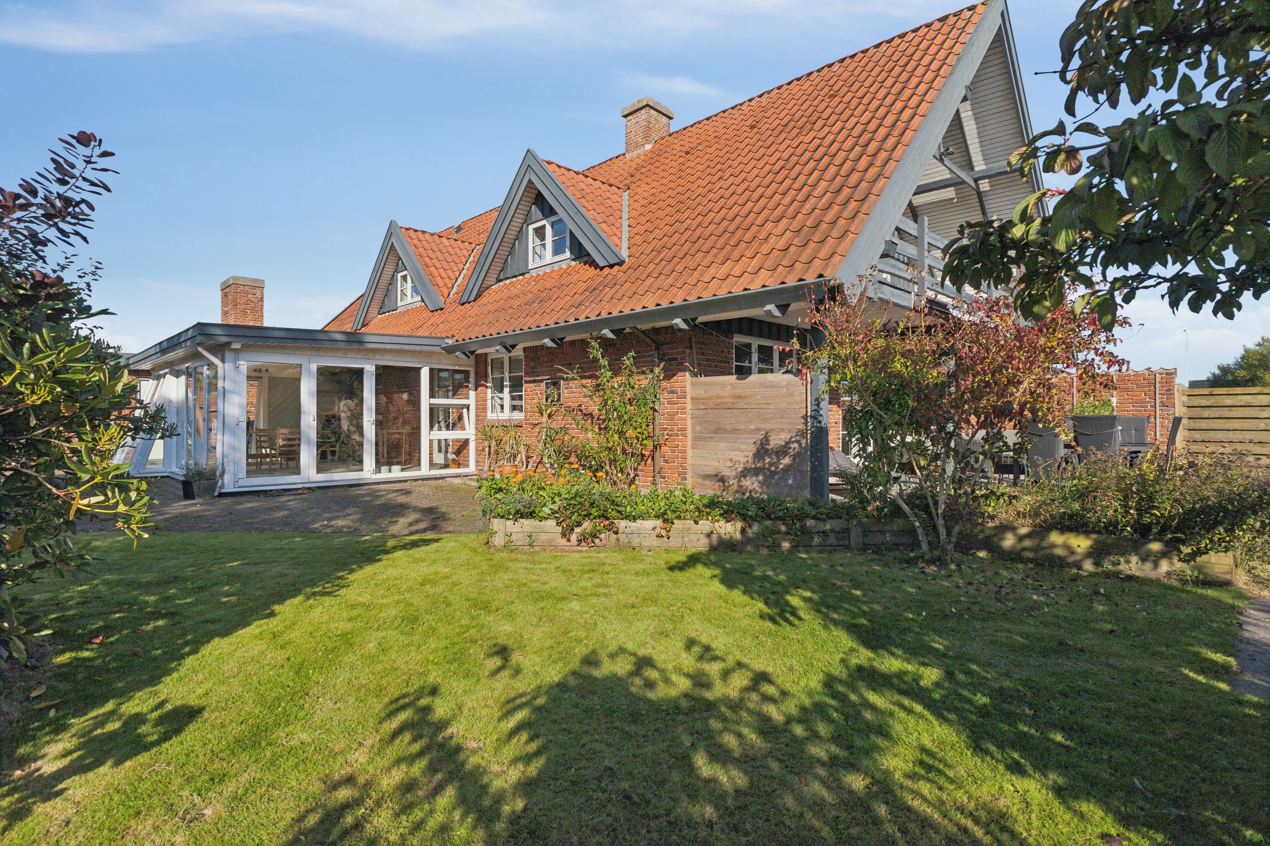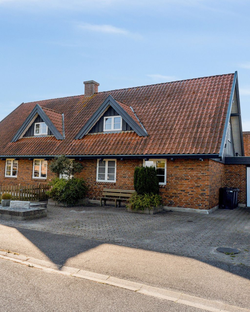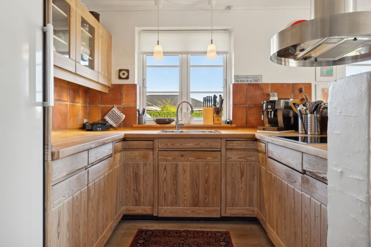 Udenfor fortsætter de mange muligheder med et stort udhus samt en garage på 28 kvadratmeter bygget i matchende røde teglsten. Garagen giver ikke blot plads til bilen men også mulighed for værksted eller ekstra opbevaring afhængigt af dine behov.