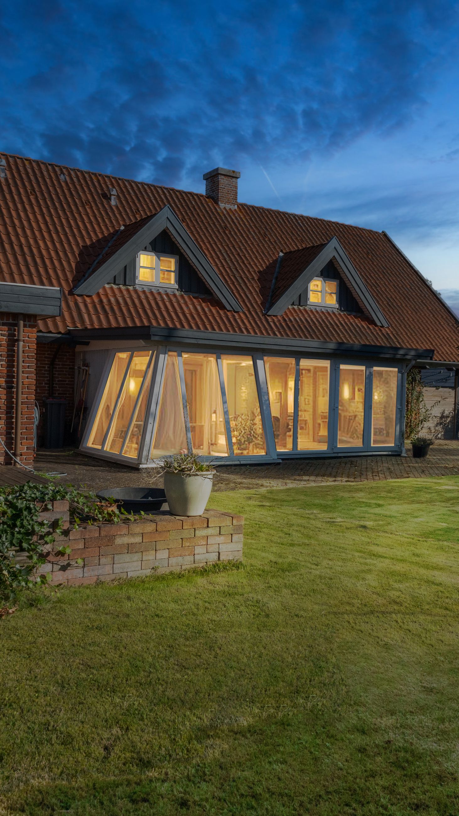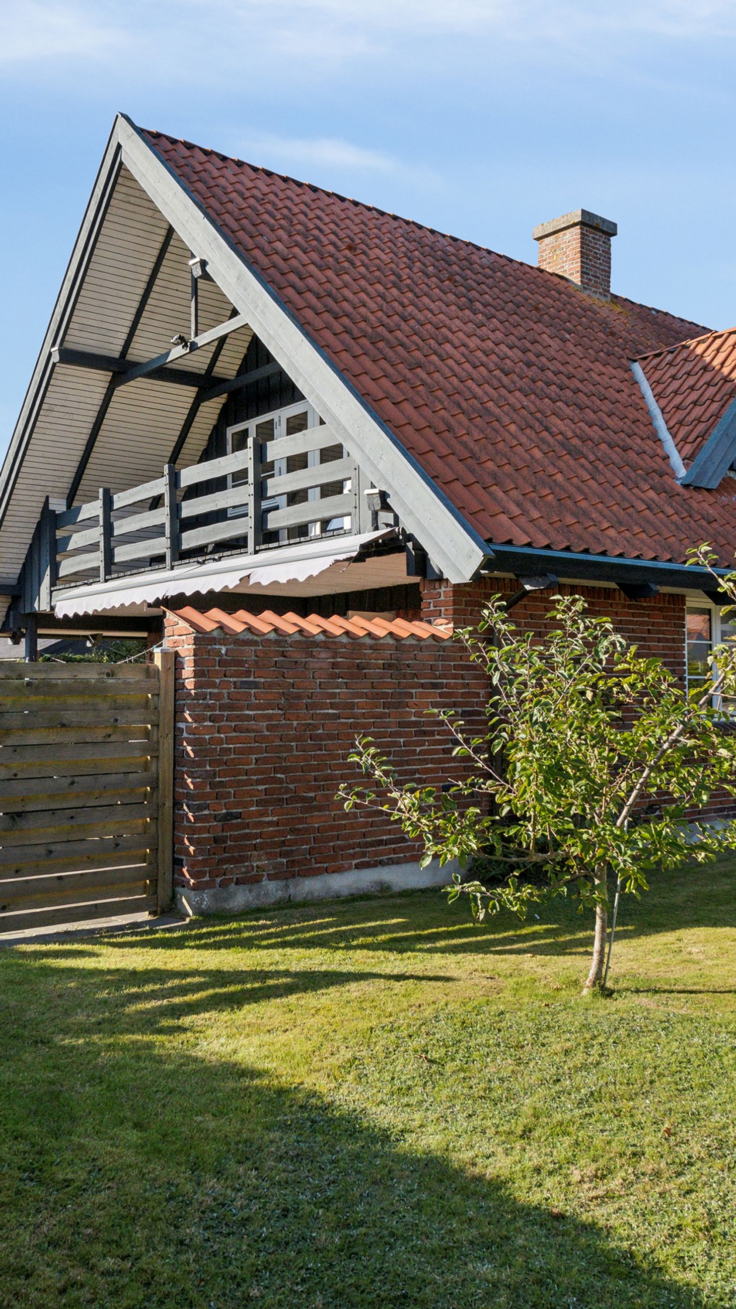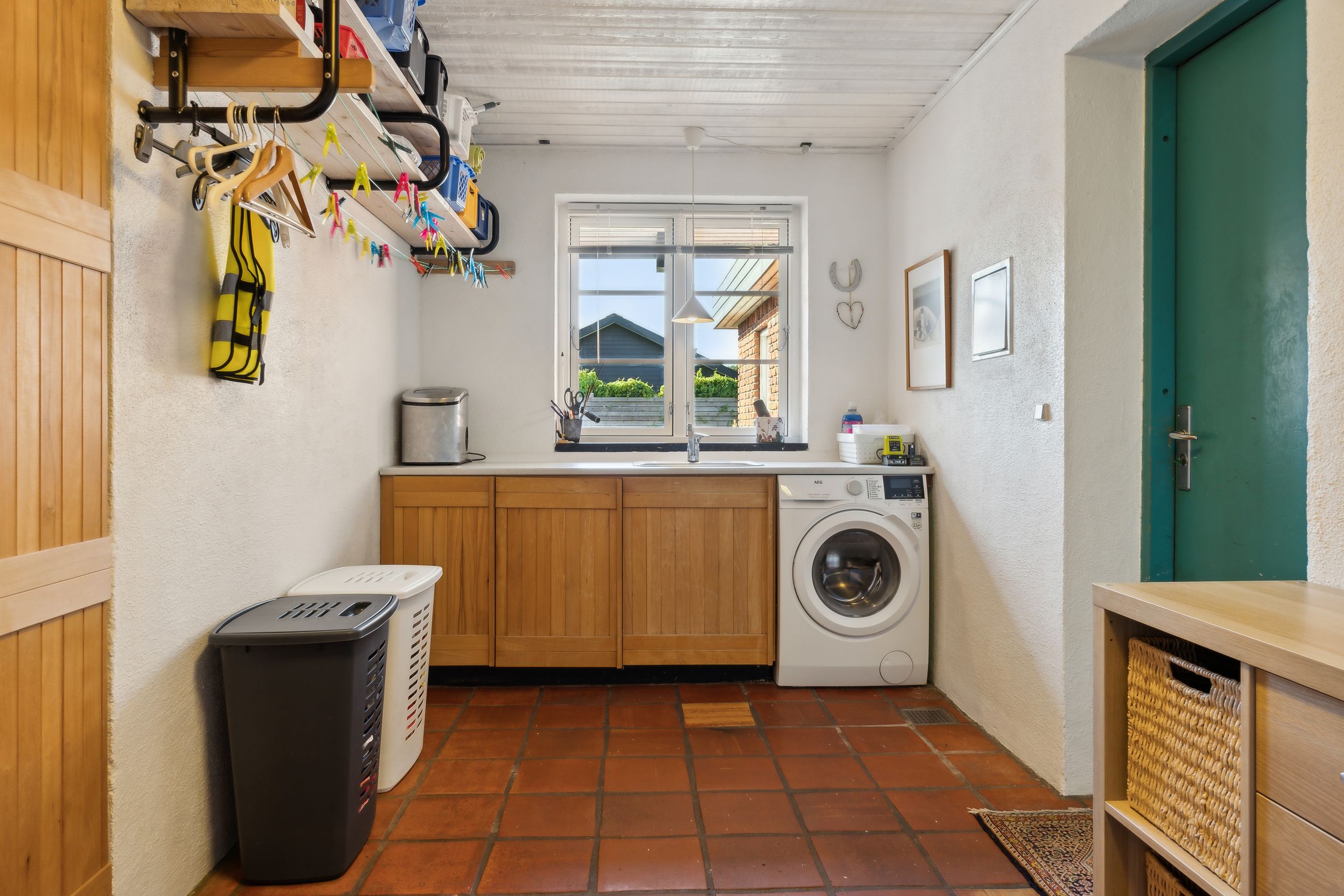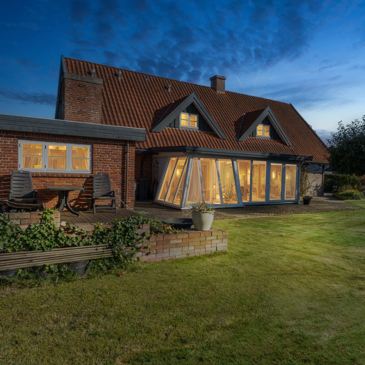 Udenfor fortsætter de mange muligheder med et stort udhus samt en garage på 28 kvadratmeter bygget i matchende røde teglsten. Garagen giver ikke blot plads til bilen men også mulighed for værksted eller ekstra opbevaring afhængigt af dine behov.