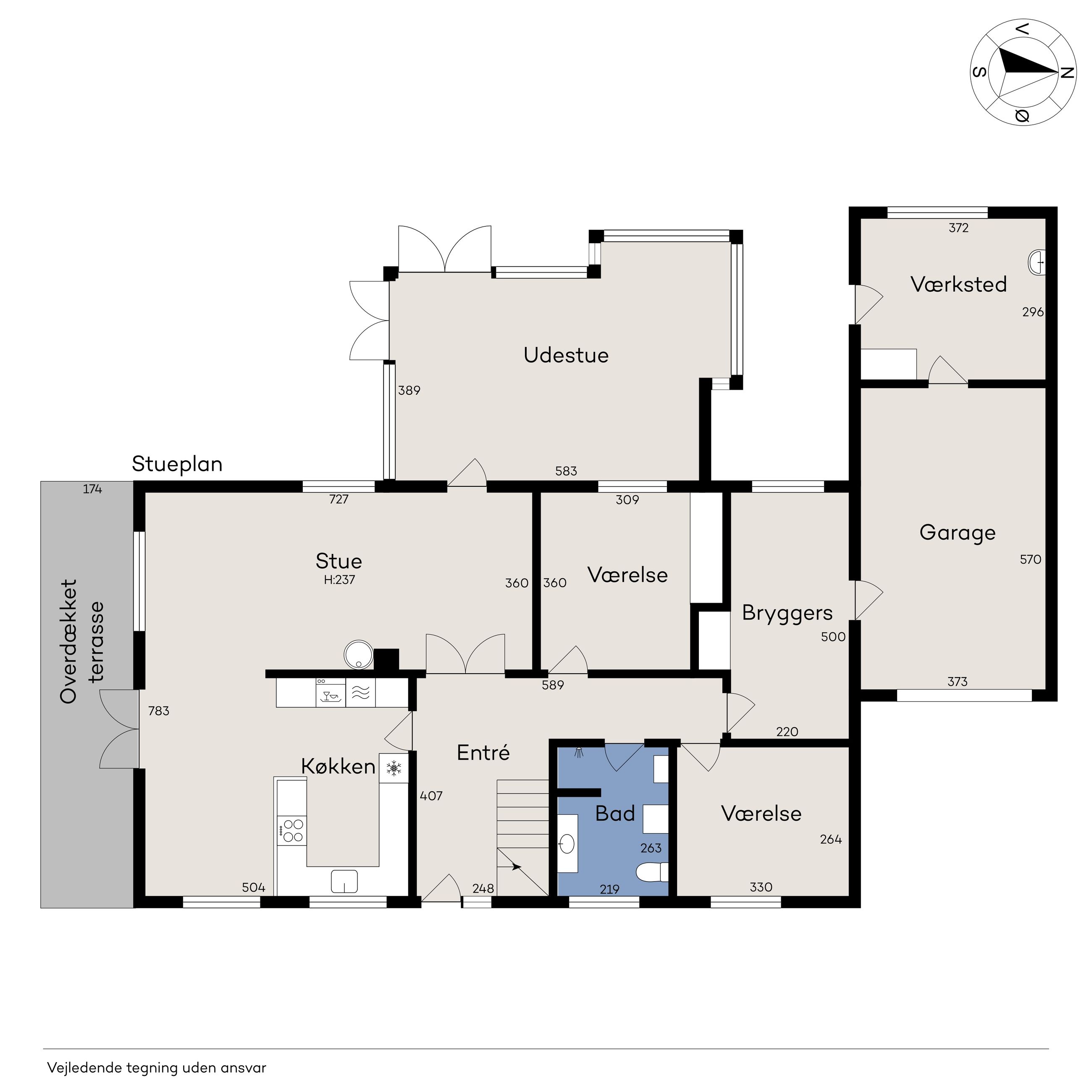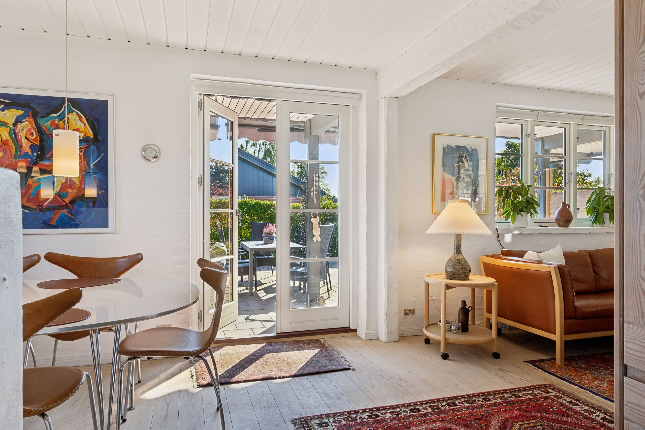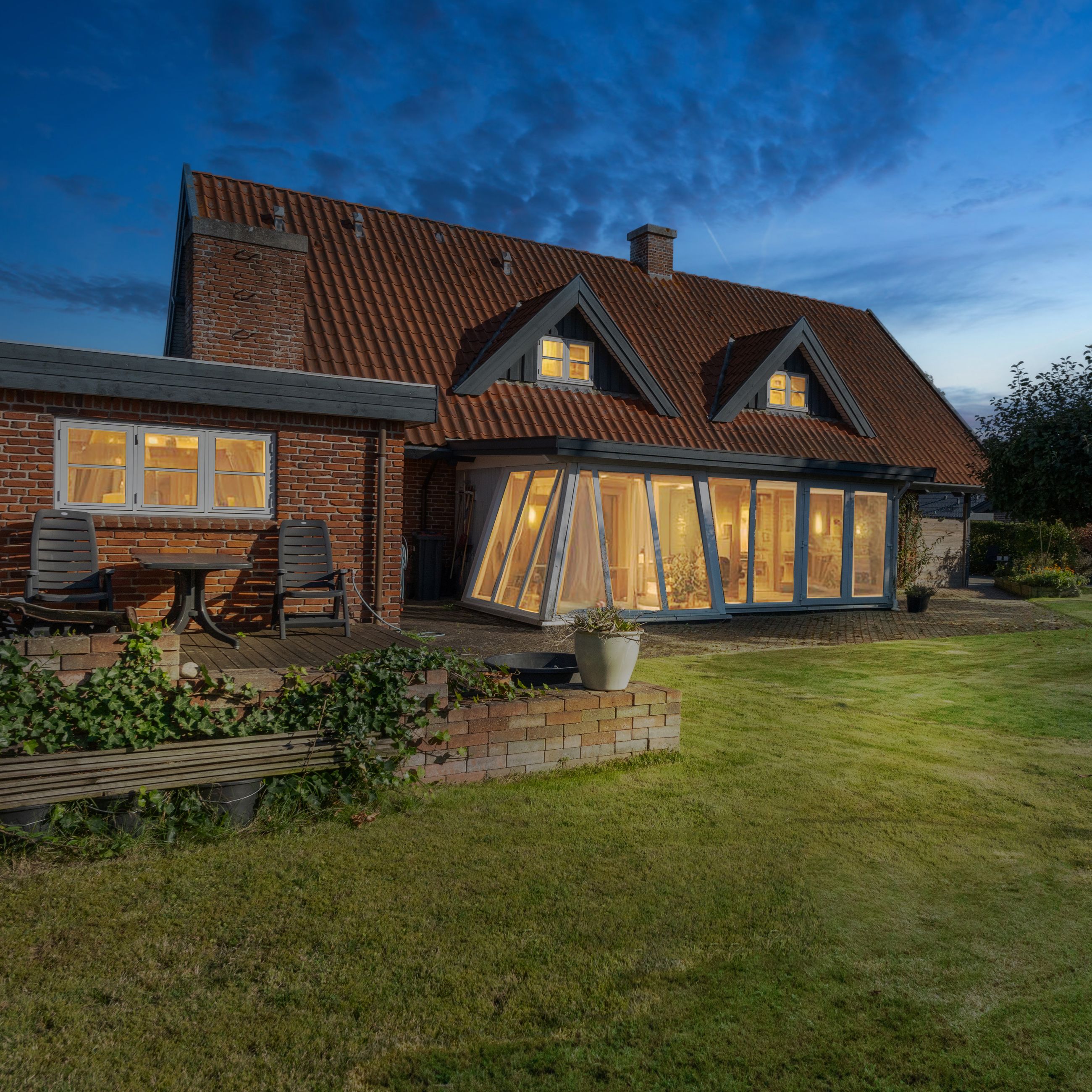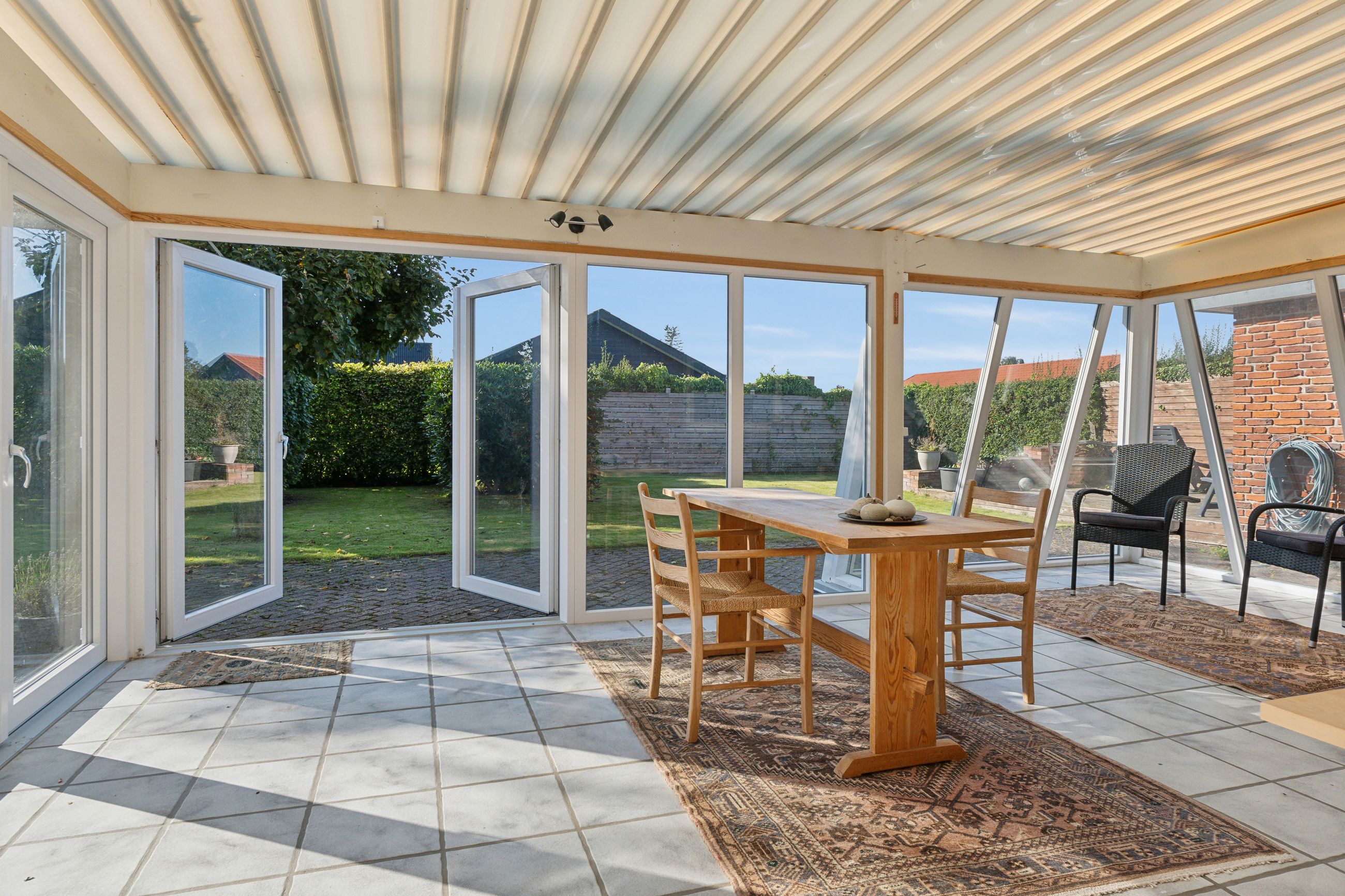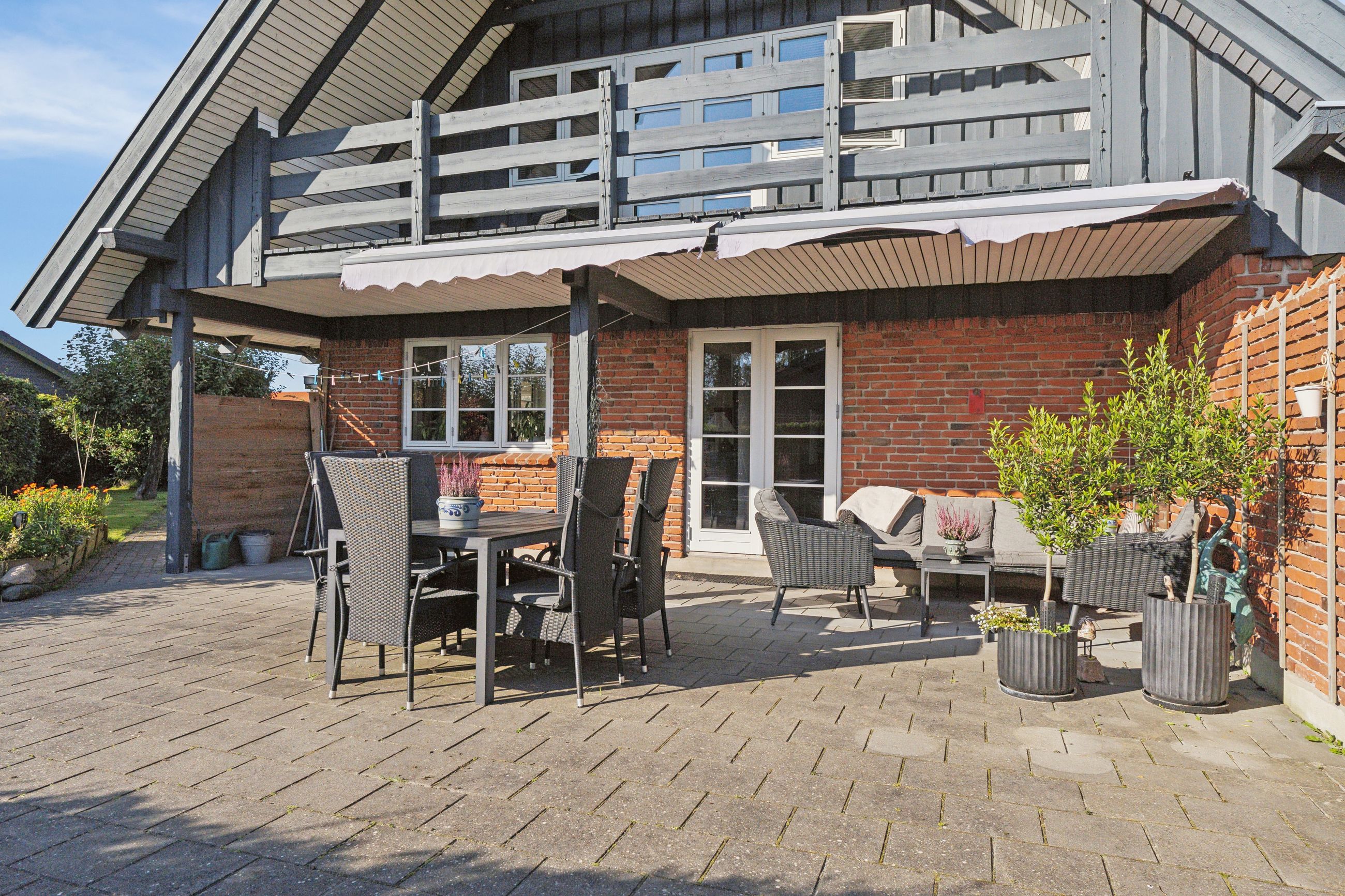 Et kapitel for sig selv, er det kæmpe terrasseareal der er på ejendommen. Sydsiden af villaen er belagt med et stort fliseareal, der går rundt ejendommen og hen forbi udestuen og grænser op til garagen. Derforuden findes træterrasse på vestsiden af garagen/udhuset, så du kan få aftenssolen med.
