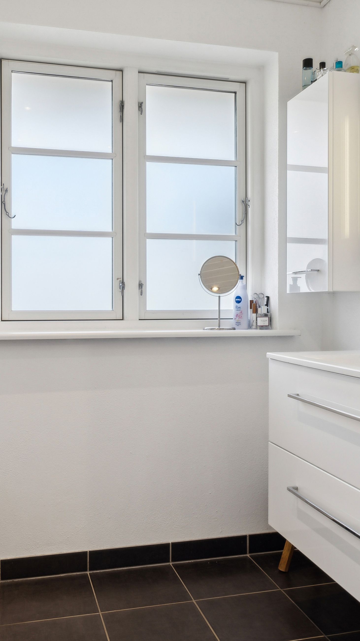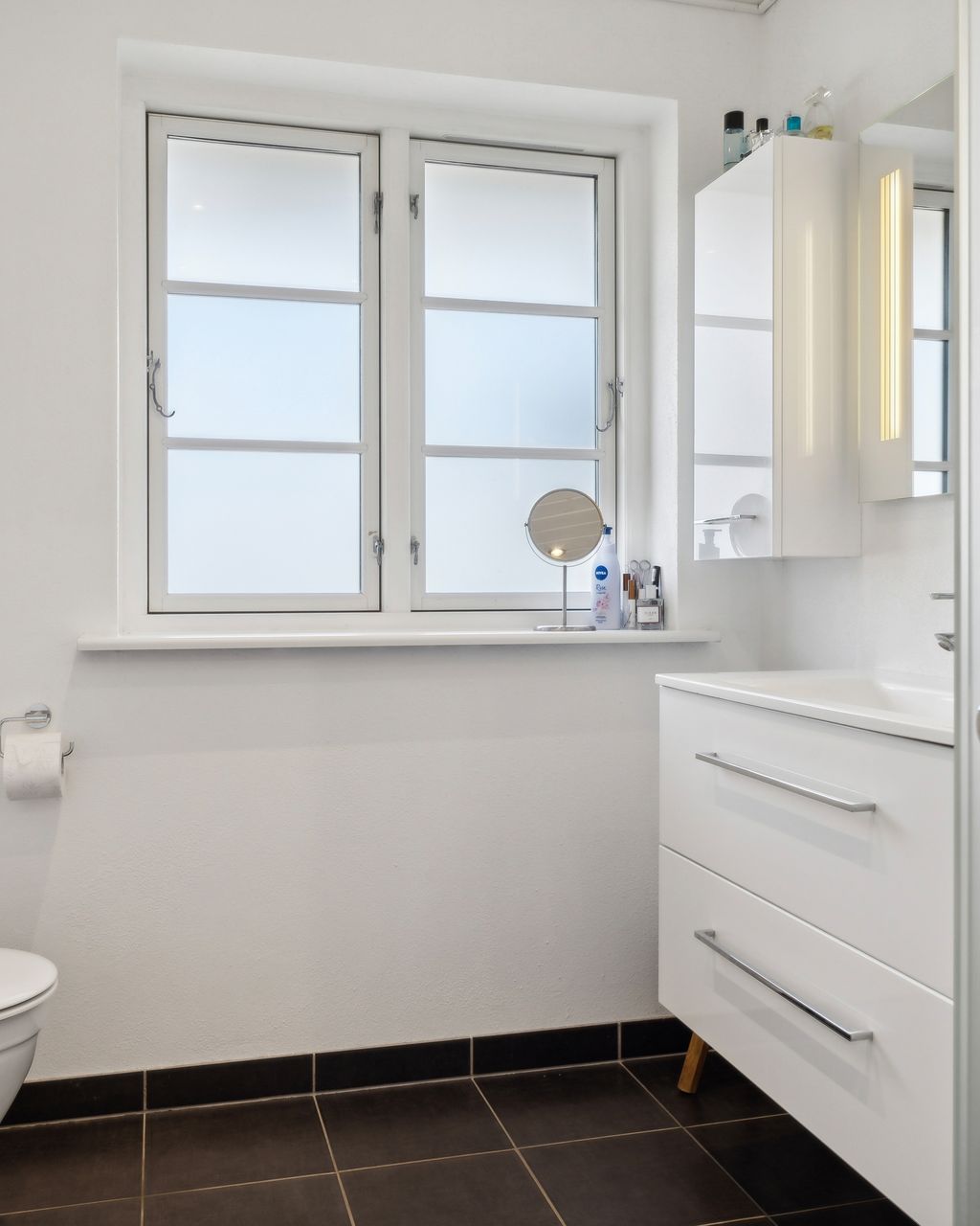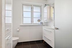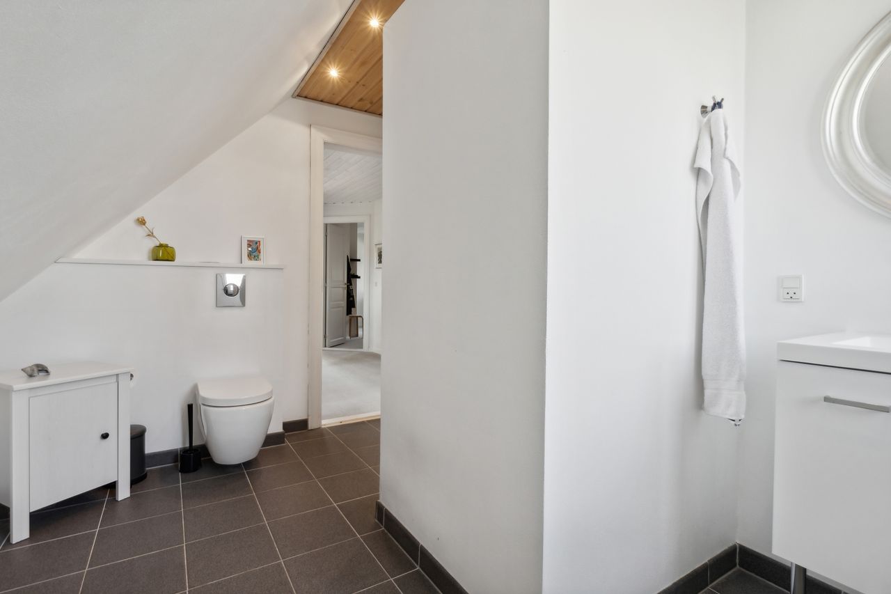 Villaen har to velindrettede badeværelser – ét på hver etage – hvilket sikrer optimal funktionalitet for den travle familie eller når I har gæster på besøg. Begge badeværelser er udstyret med moderne faciliteter og god opbevaringsplads, så dagligdagen glider nemt.