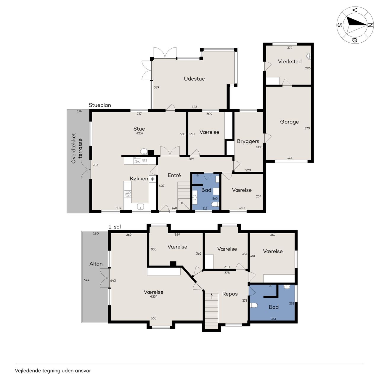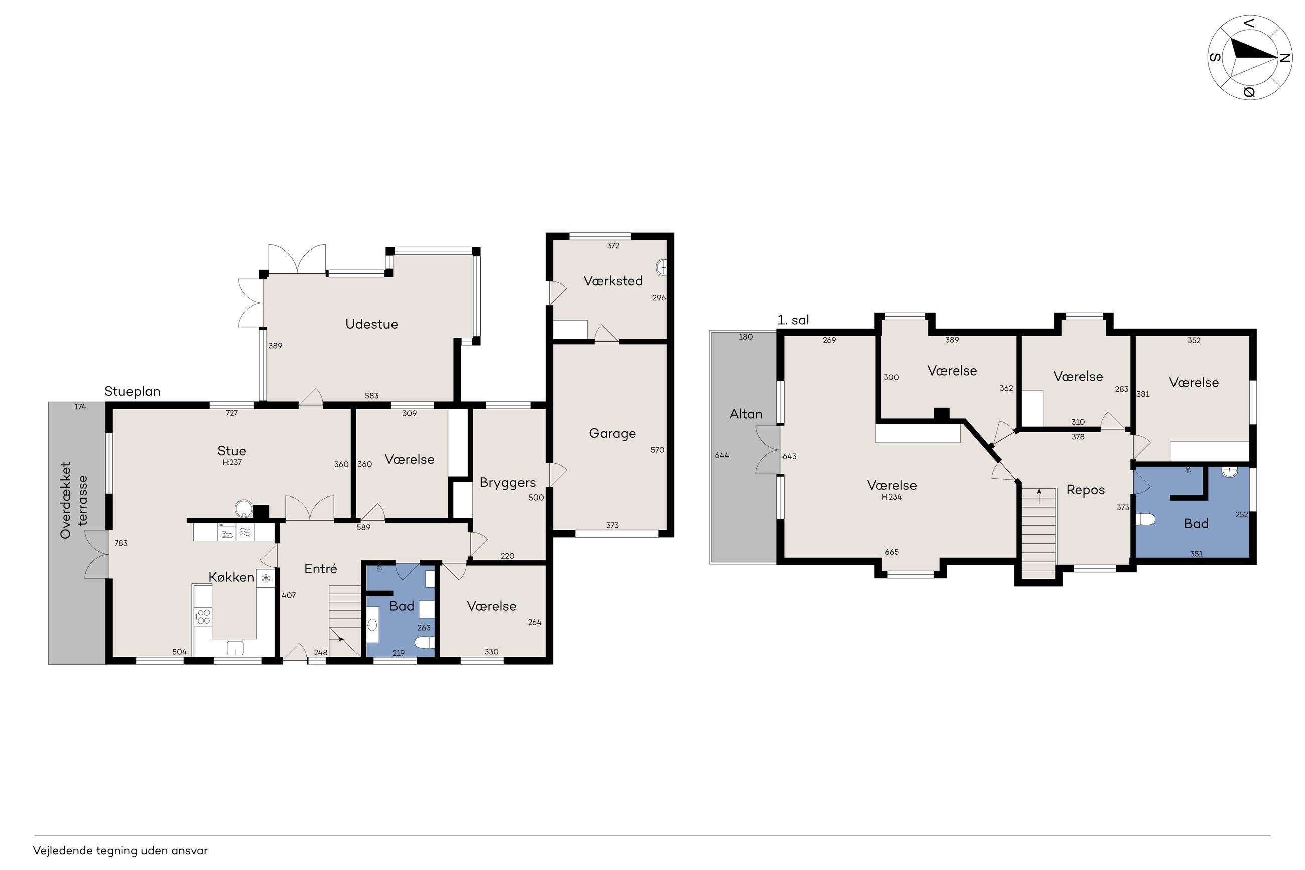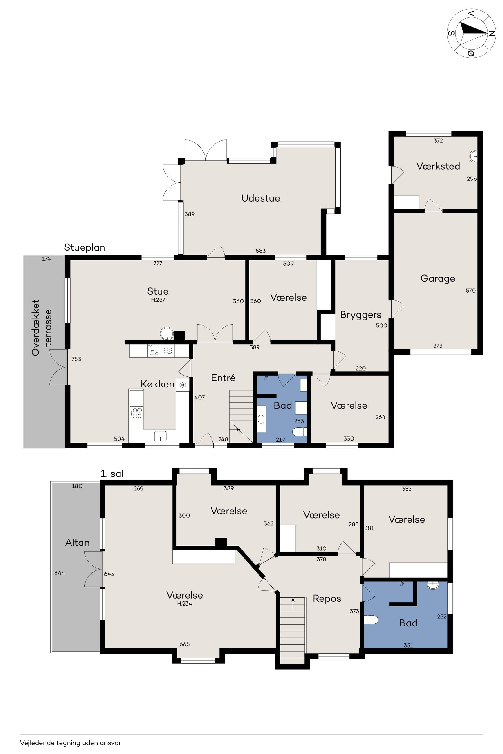 Villaen har to velindrettede badeværelser – ét på hver etage – hvilket sikrer optimal funktionalitet for den travle familie eller når I har gæster på besøg. Begge badeværelser er udstyret med moderne faciliteter og god opbevaringsplads, så dagligdagen glider nemt.