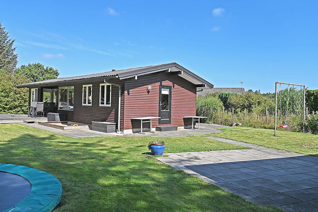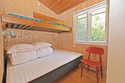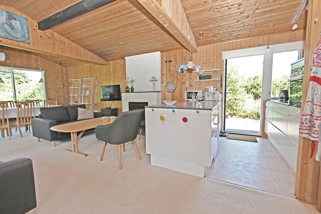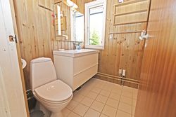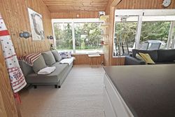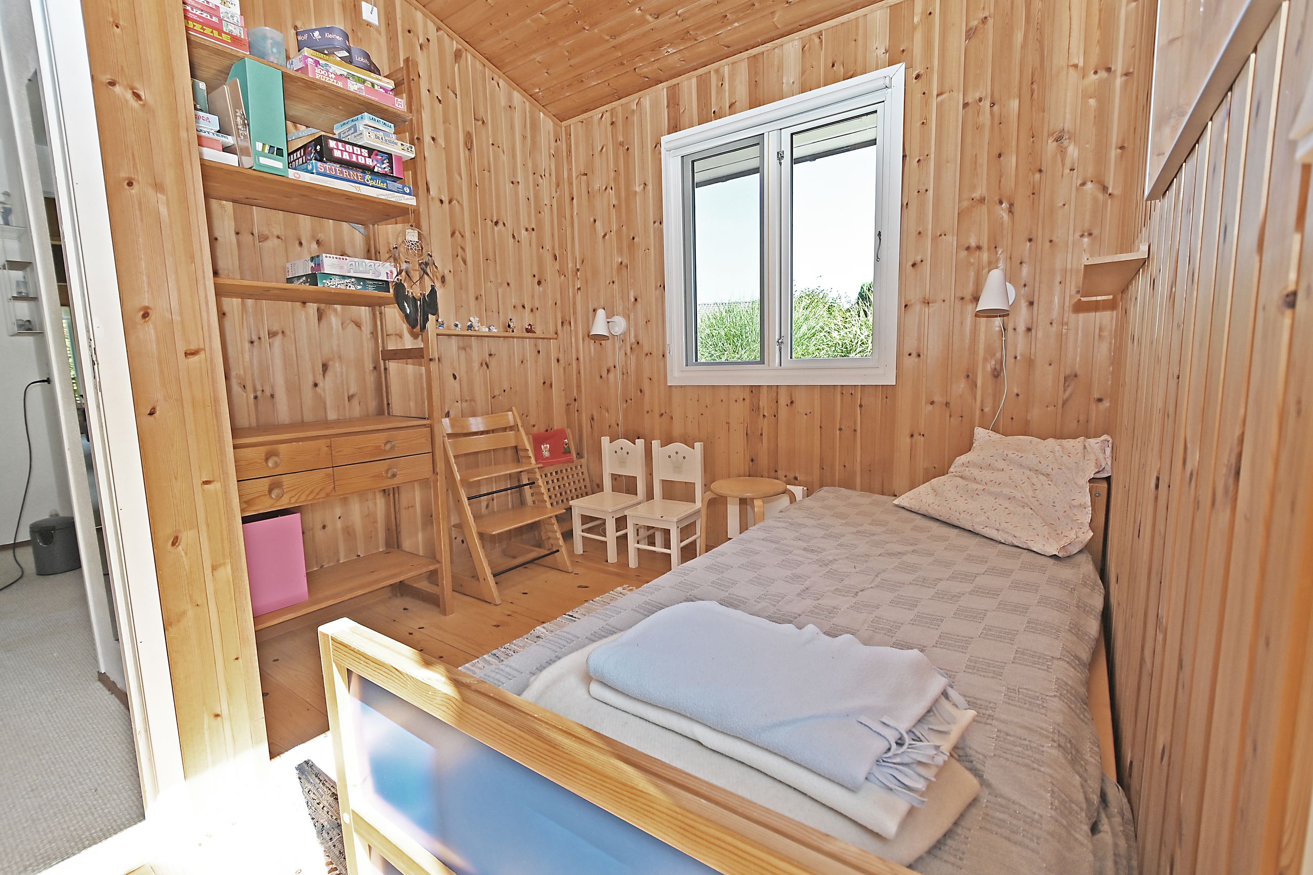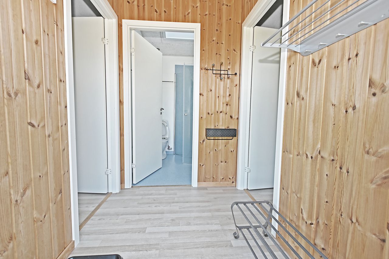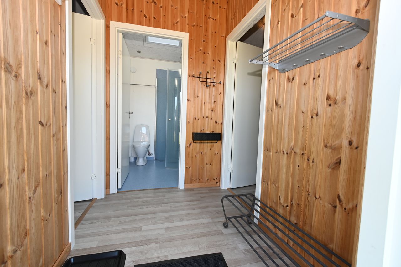 Fra køkkenet er adgang til den nordlige del af huset. Fra stuen er adgang til husets værelsesafsnit via fordelingsgang, der giver adgang til rummeligt badeværelse med bruseniche samt bademiljø. Huset rummer 3 gode værelser/køjerum, med ialt 5 sovepladser. Det ene værelse har adgang til østvendt terrasse , og fra stuen er der adgang til skøn, sydvendt træterrasse på ca + 30 m2.
